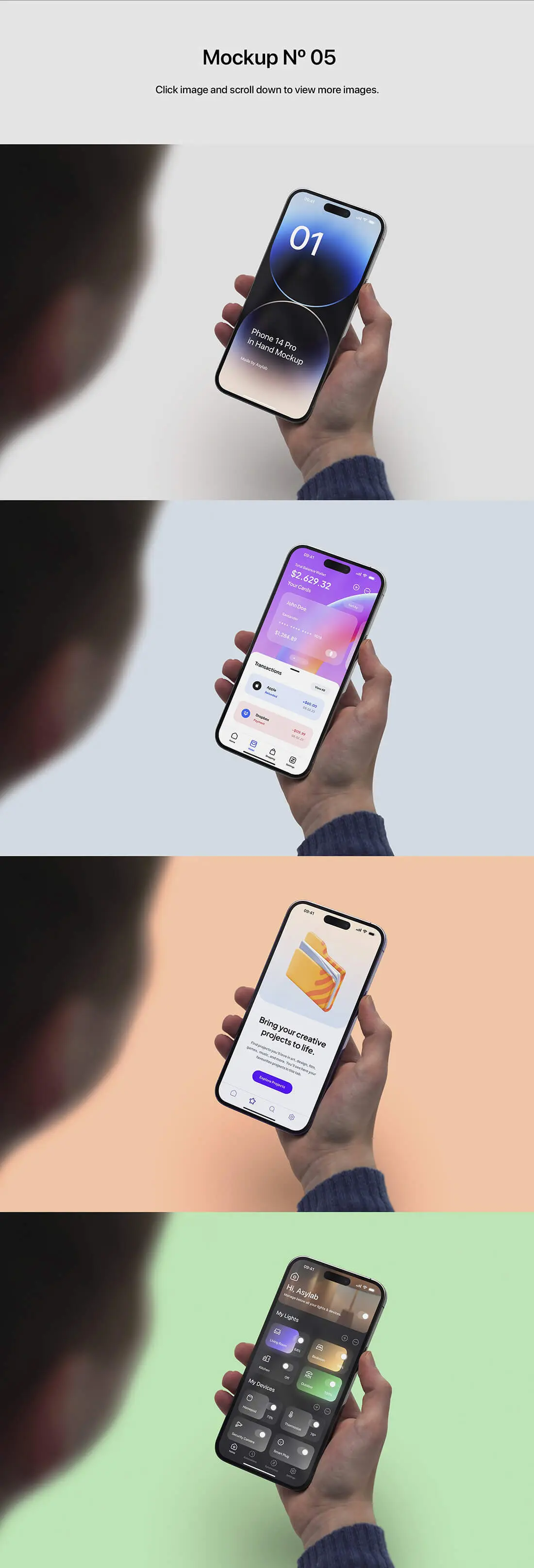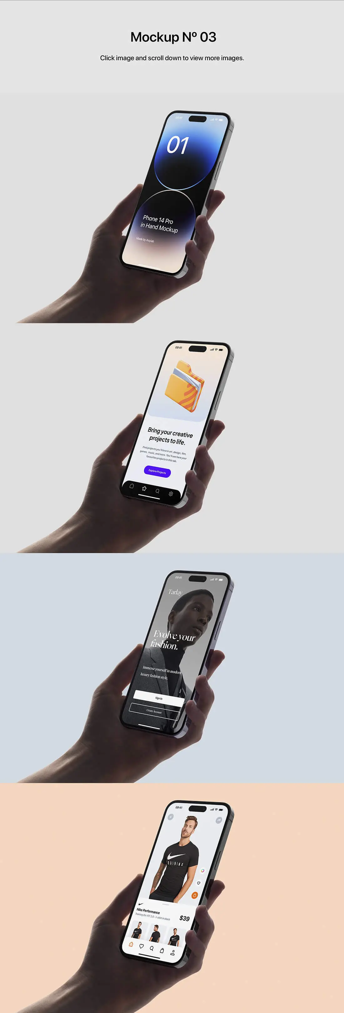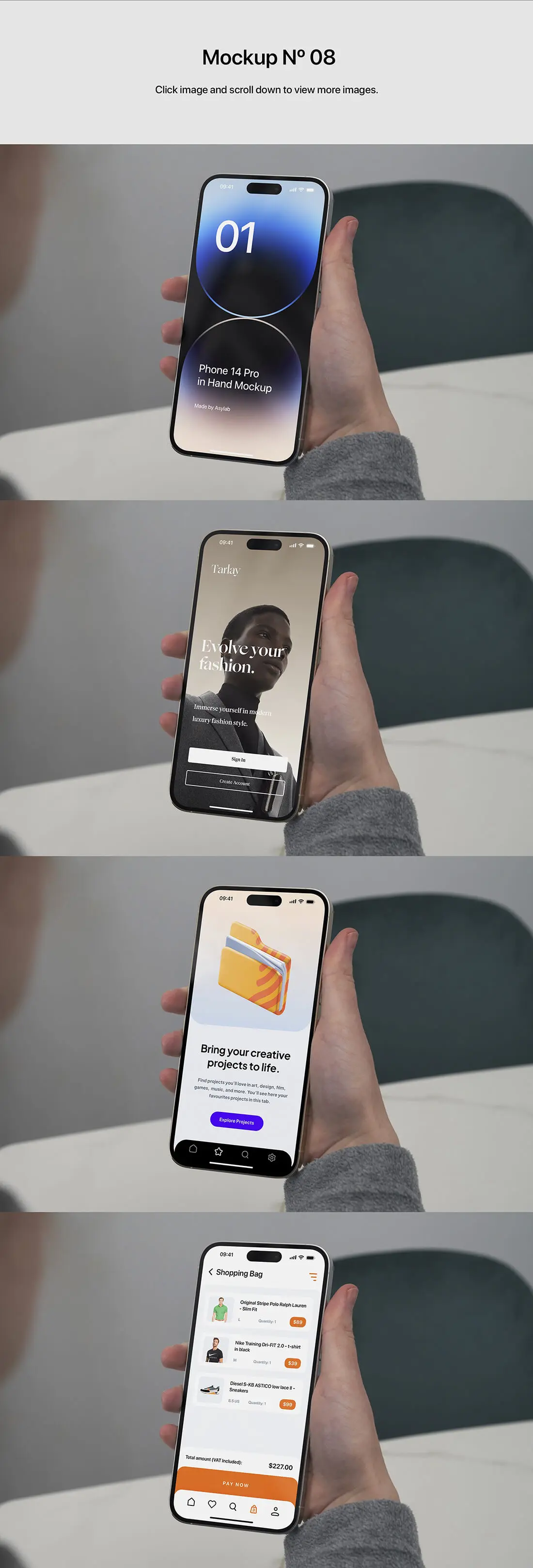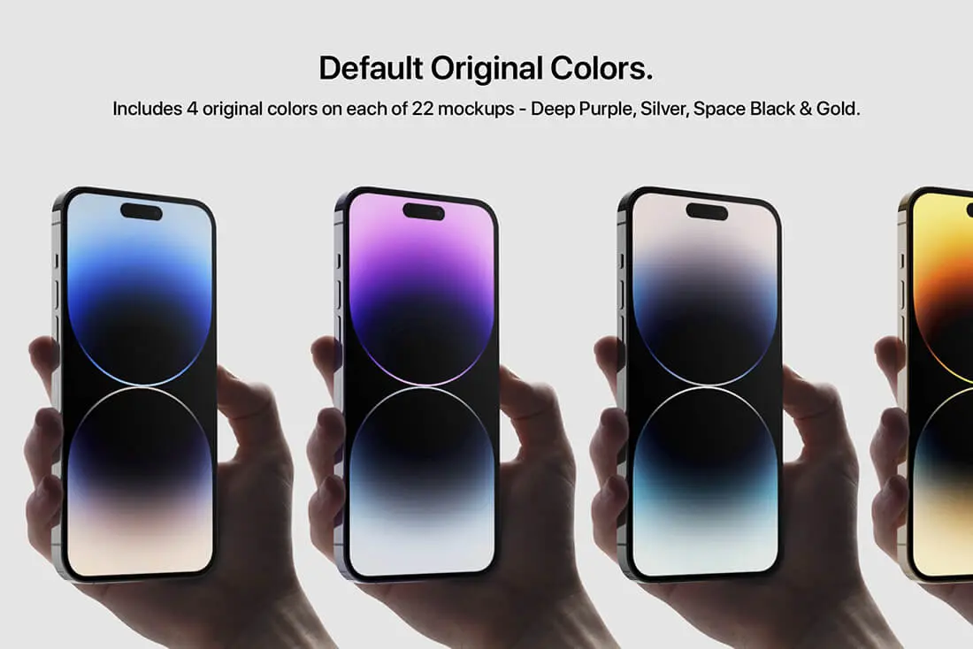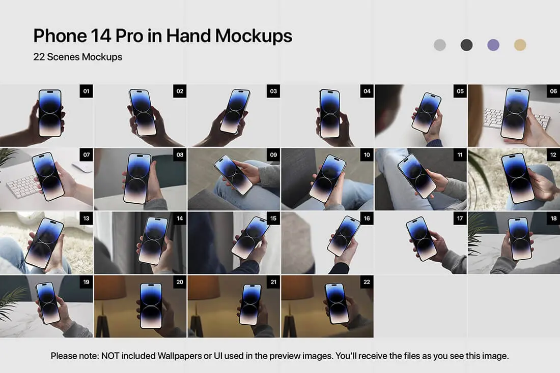 - 包括 22 个 Phone 14 Pro 手持模型 – PSD 高质量文件(您将在第二张图片中看到的所有场景都已包含在购买中)。