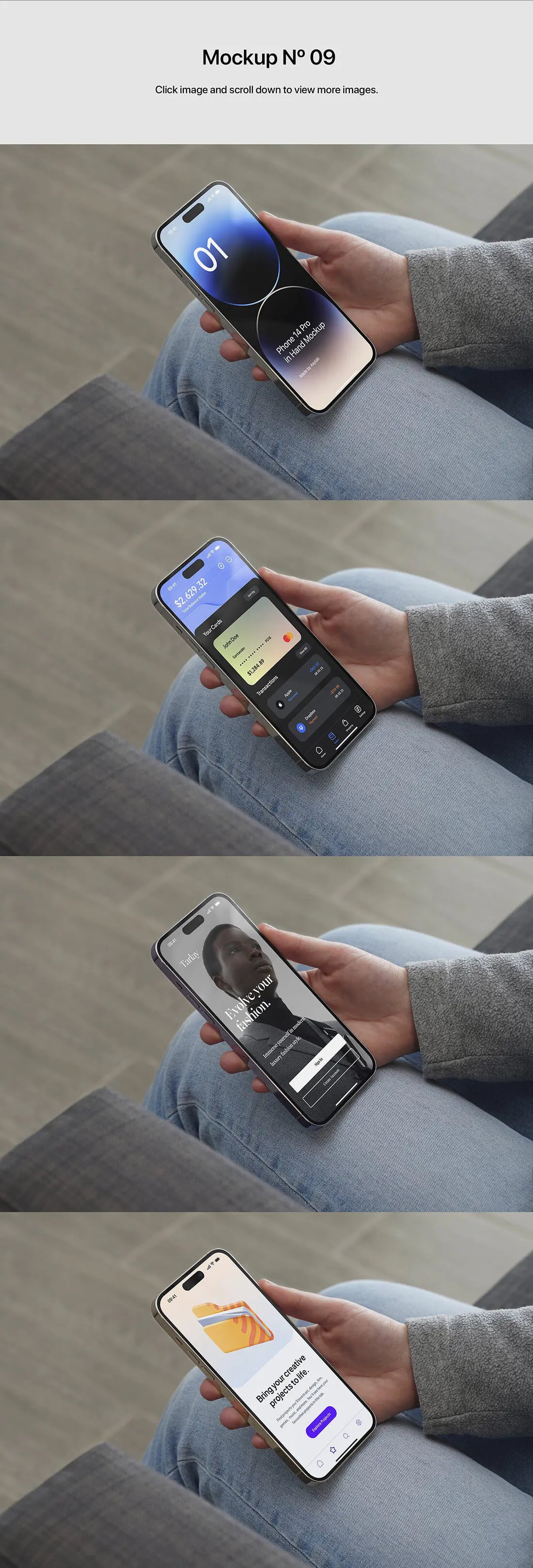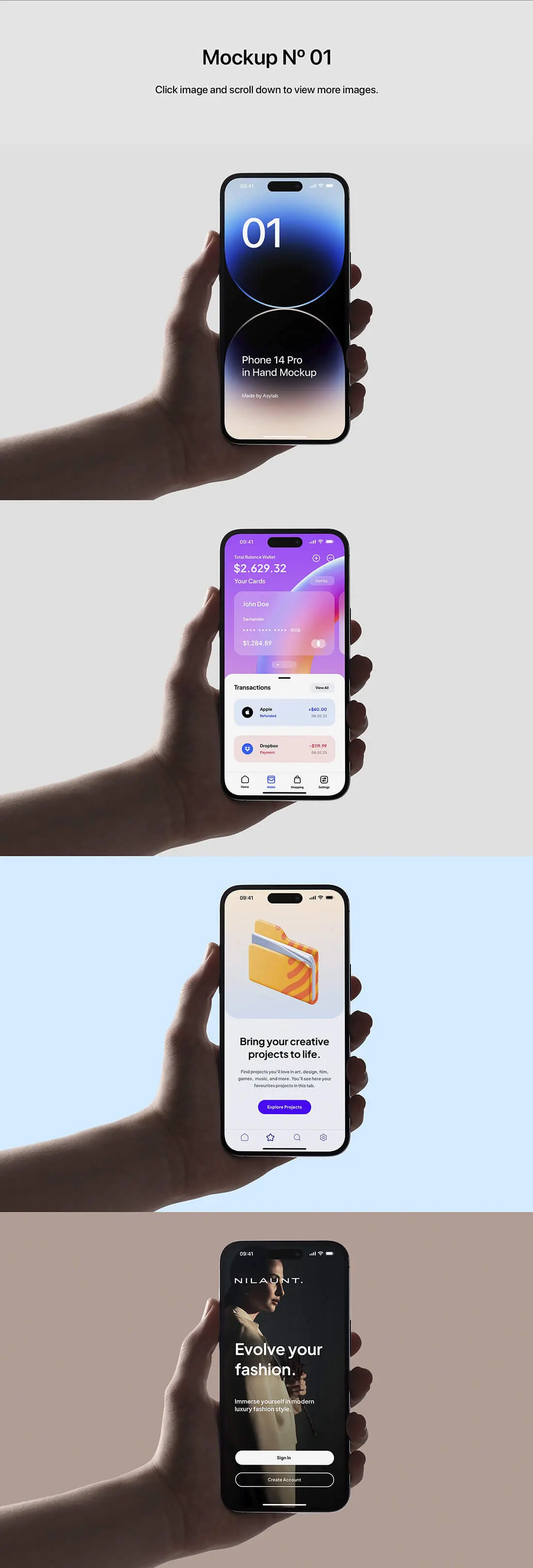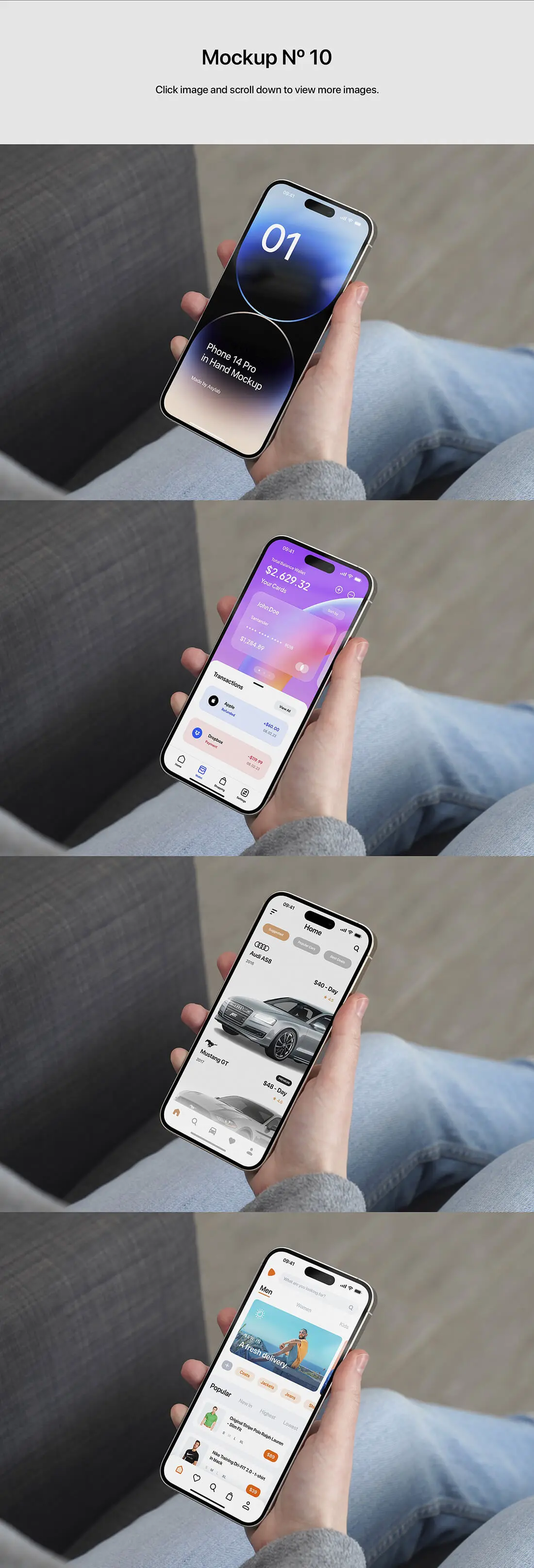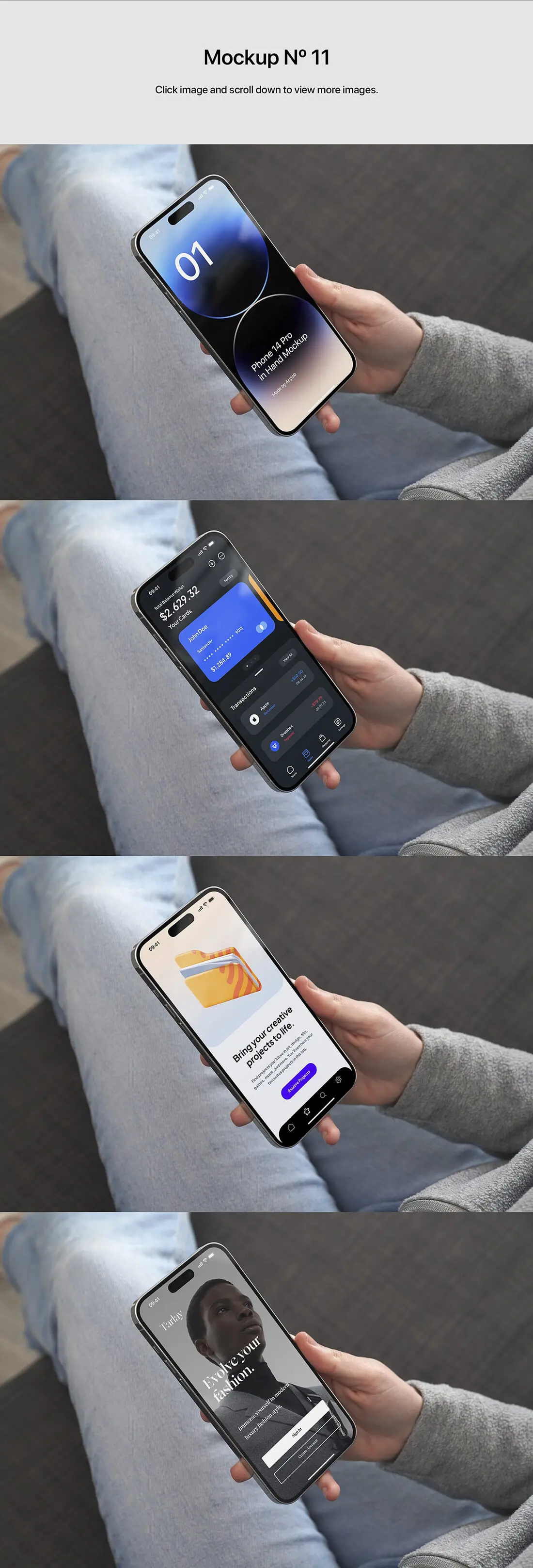 - 包括 22 个 Phone 14 Pro 手持模型 – PSD 高质量文件(您将在第二张图片中看到的所有场景都已包含在购买中)。