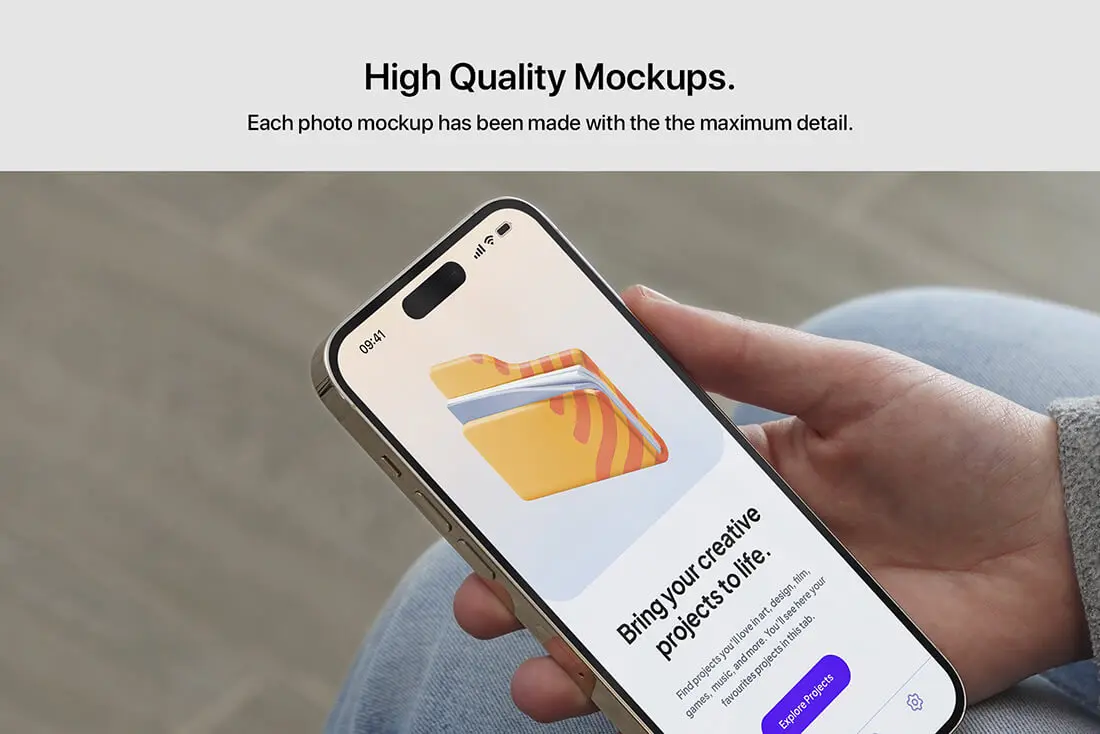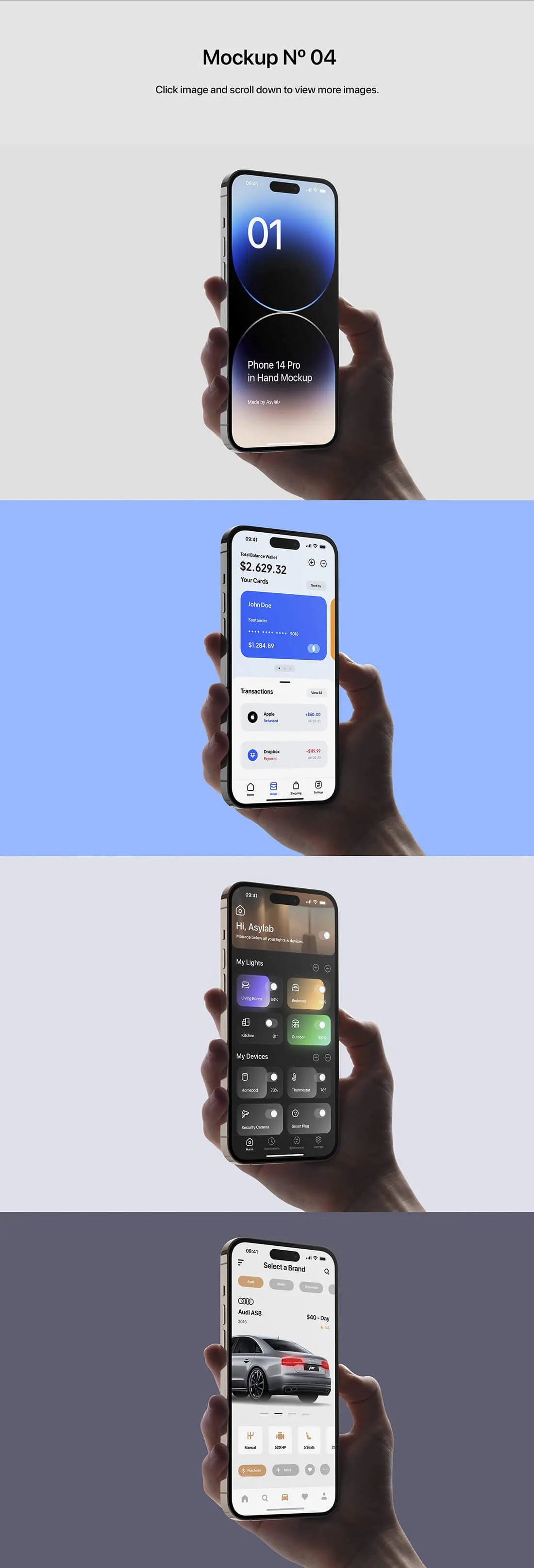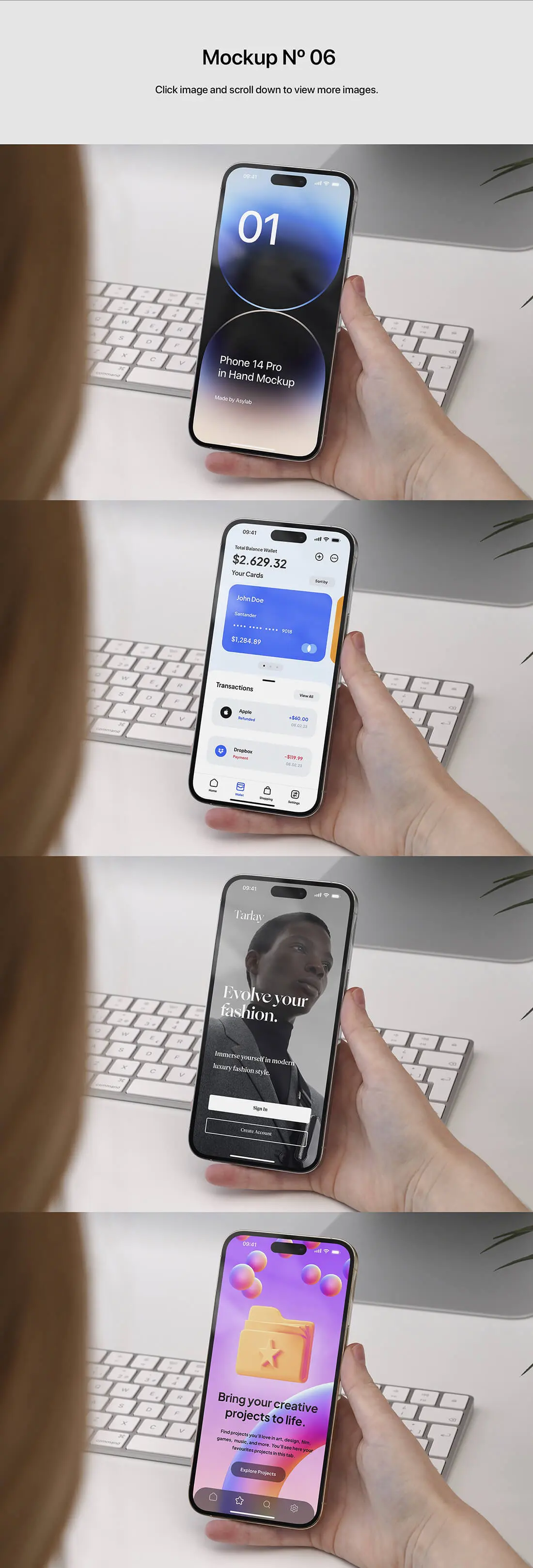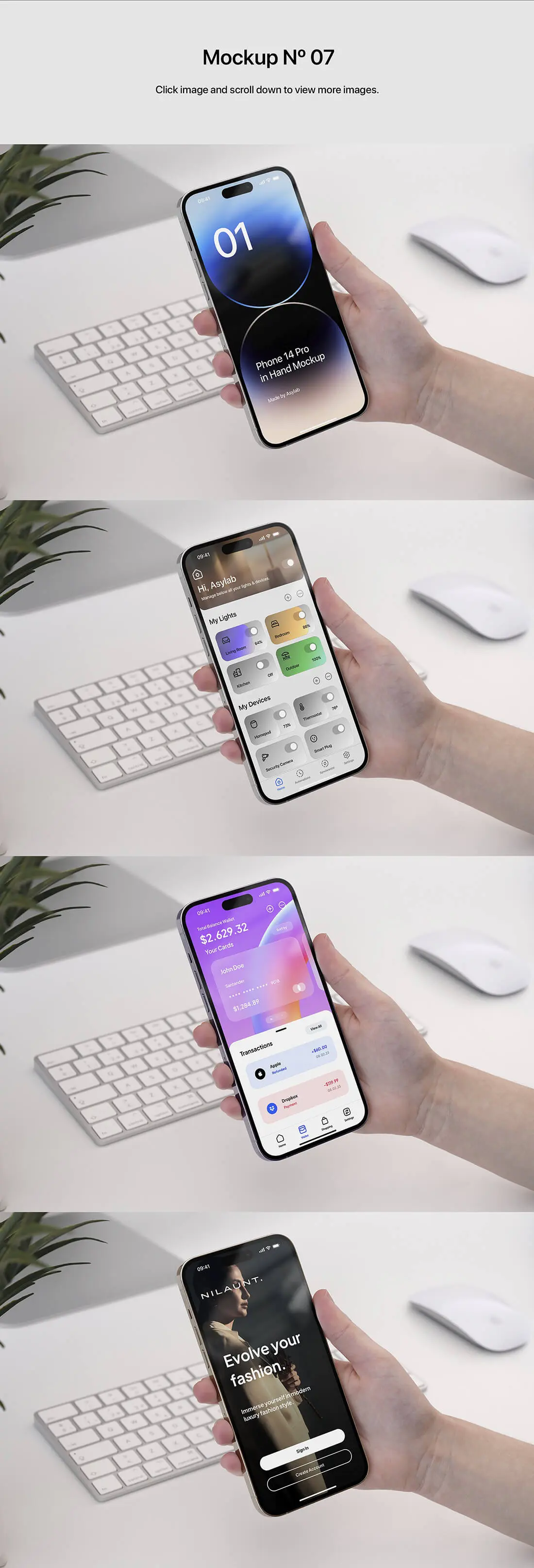 - 包括 22 个 Phone 14 Pro 手持模型 – PSD 高质量文件(您将在第二张图片中看到的所有场景都已包含在购买中)。