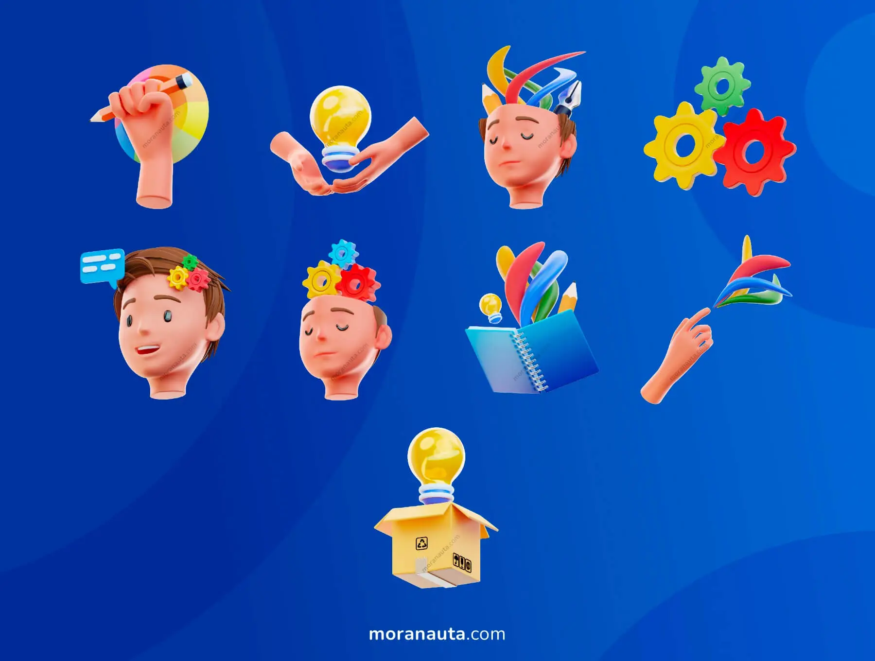 20 3D 设计思维图标集,用于您的网页、应用程序、营销和演示设计。