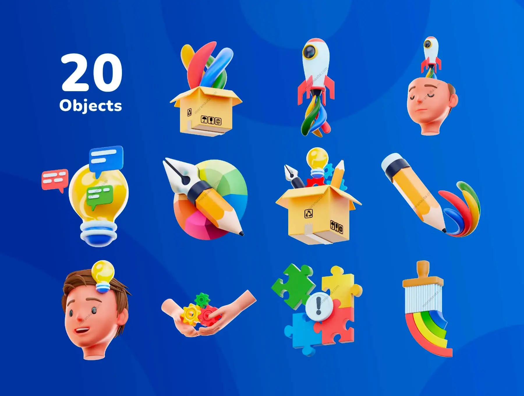 20 3D 设计思维图标集,用于您的网页、应用程序、营销和演示设计。