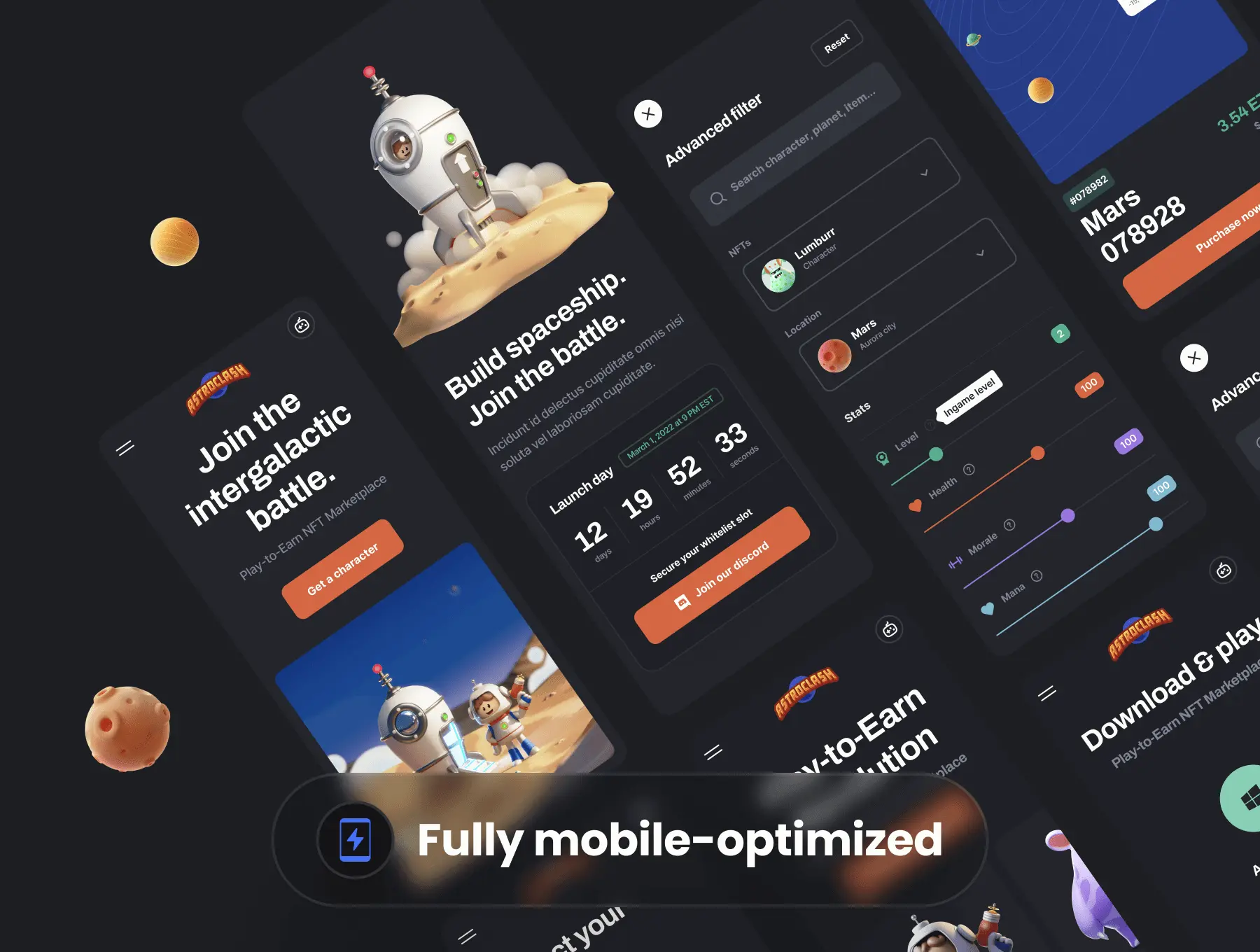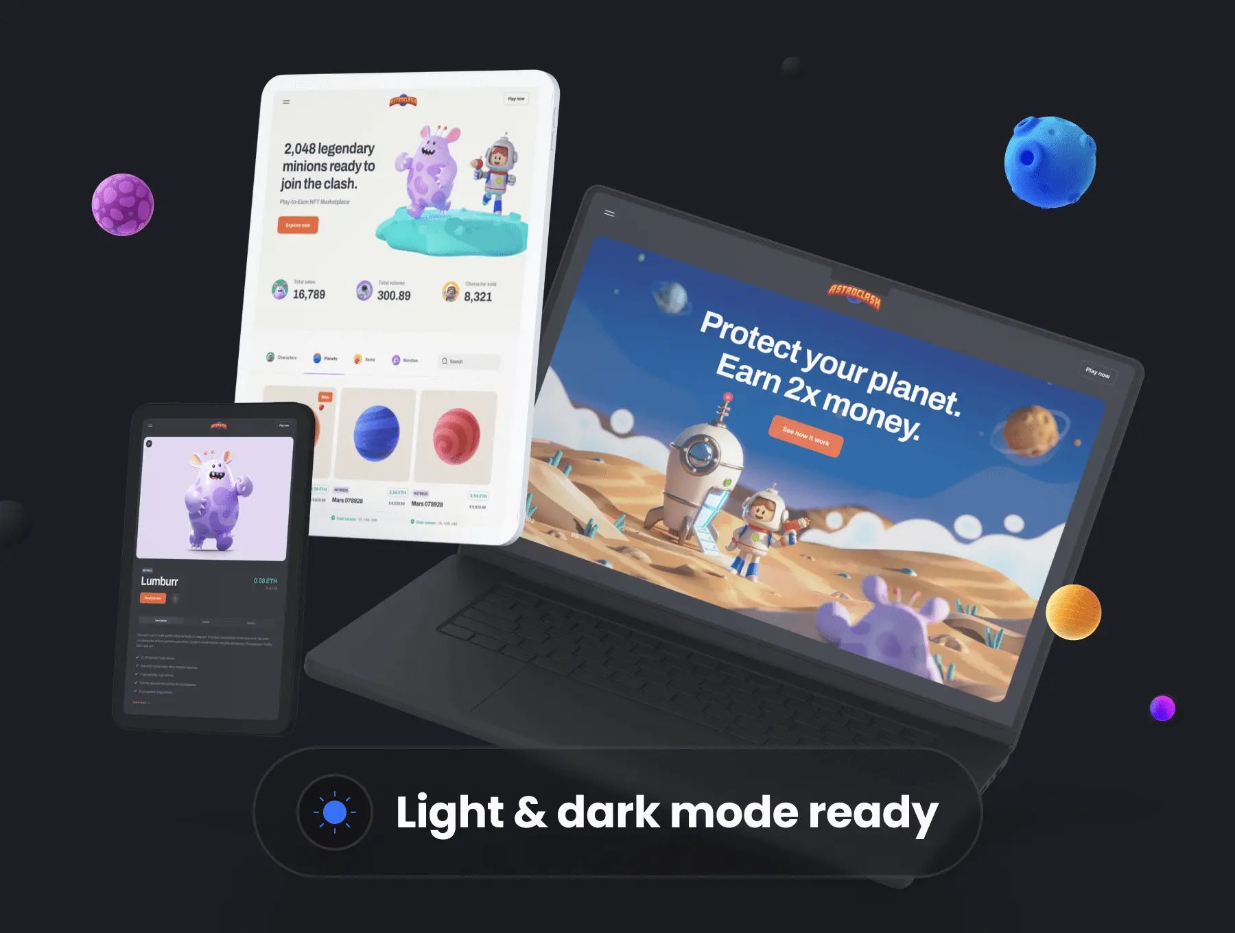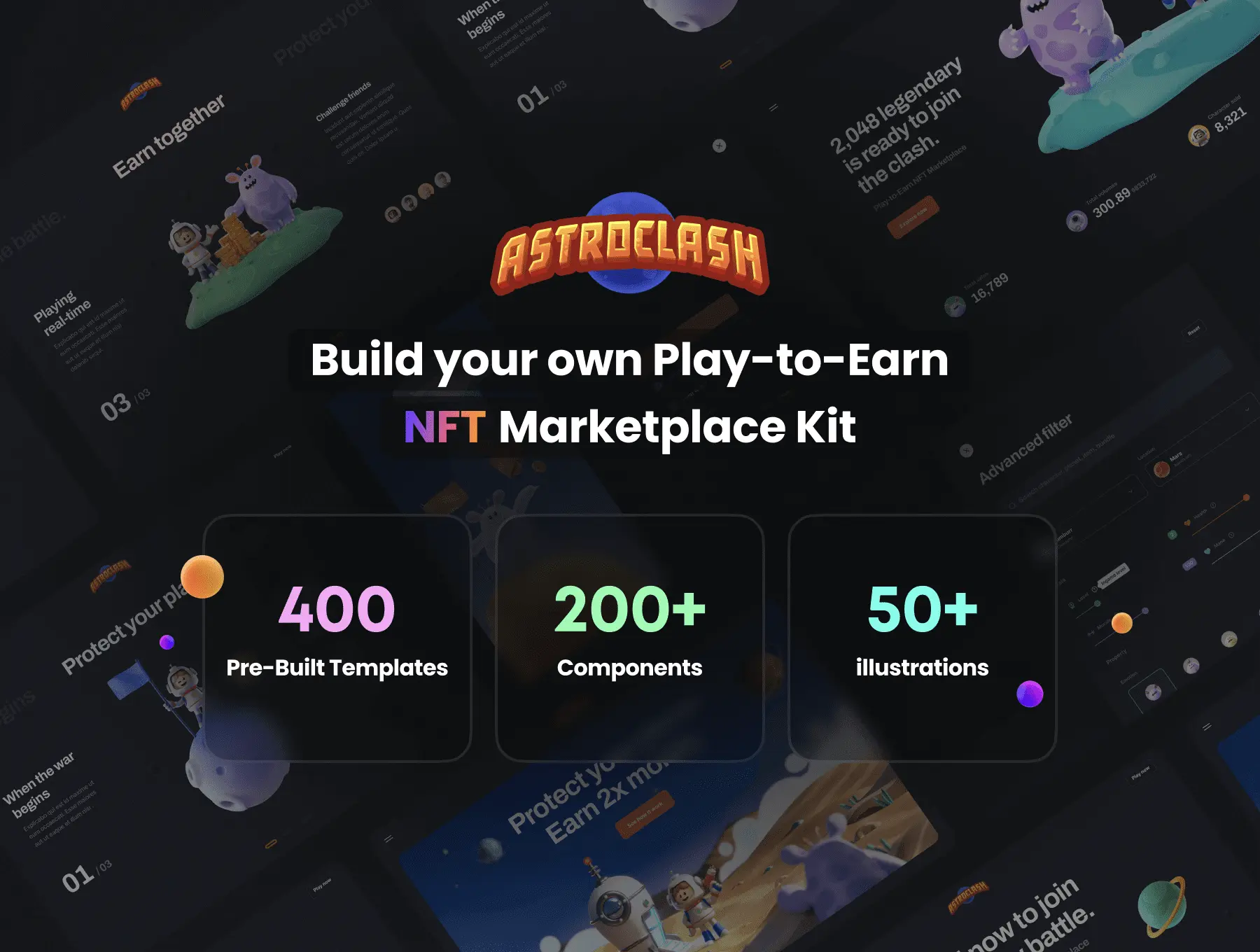 认识 AstroClash,一个功能齐全的 Play-to-Earn 市场工具包,包括可在 Figma 中编辑的独家设计文件以及一组定制的精美 3D 插图。