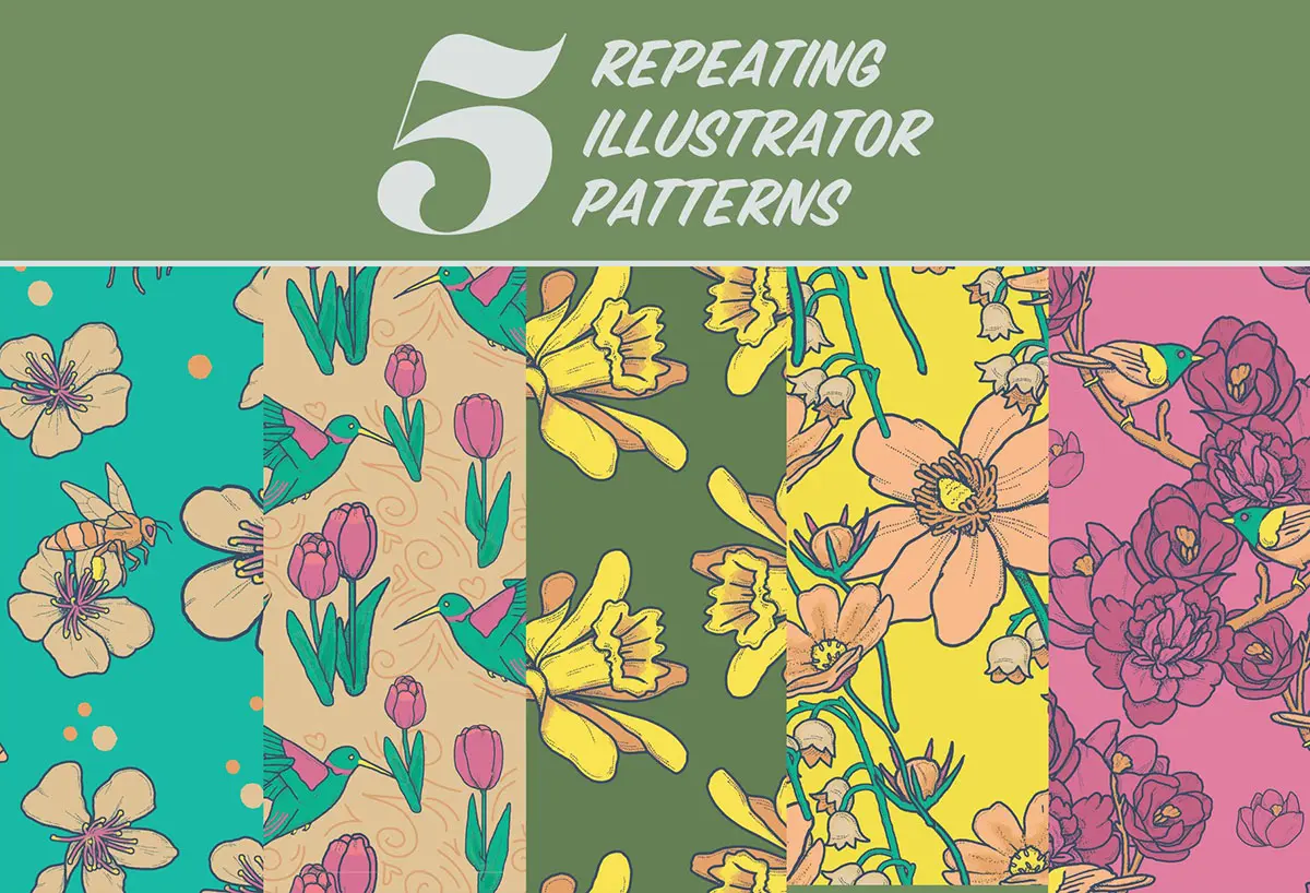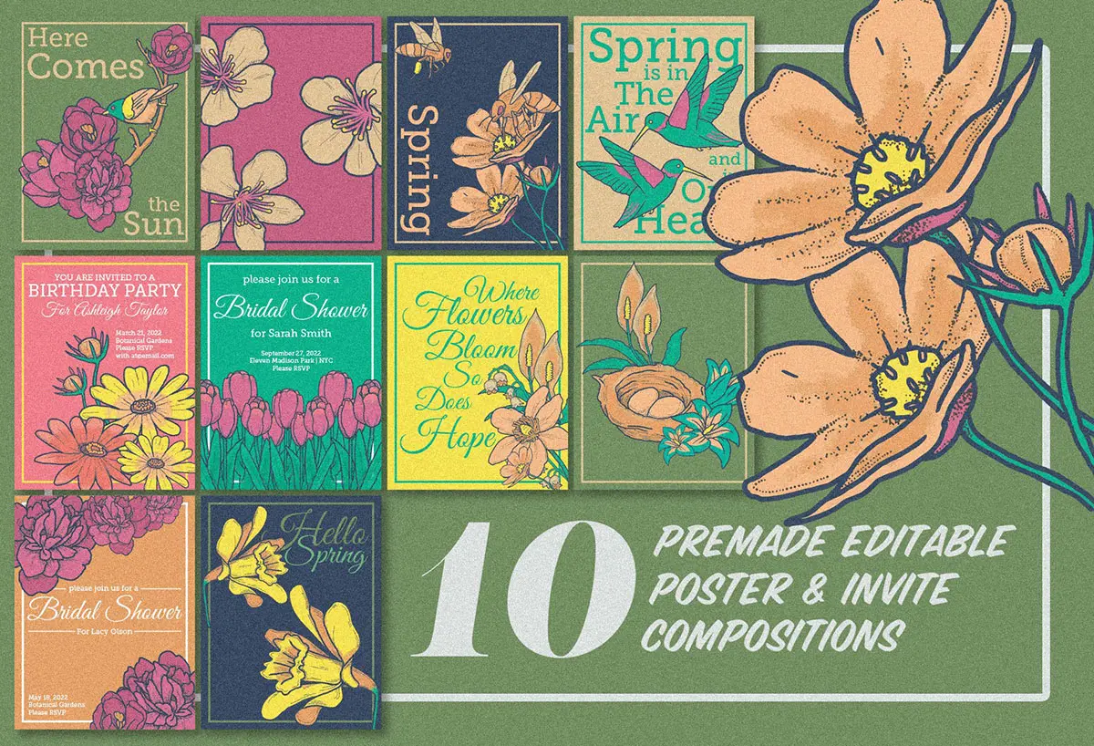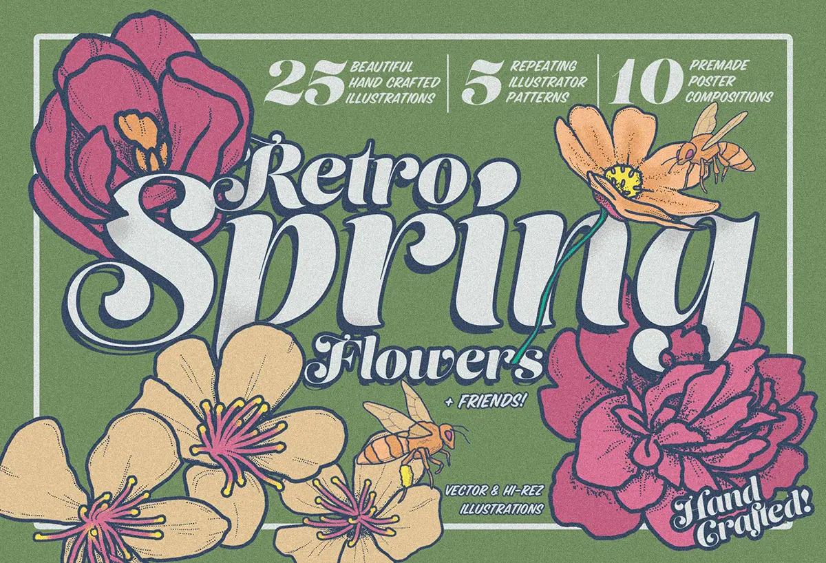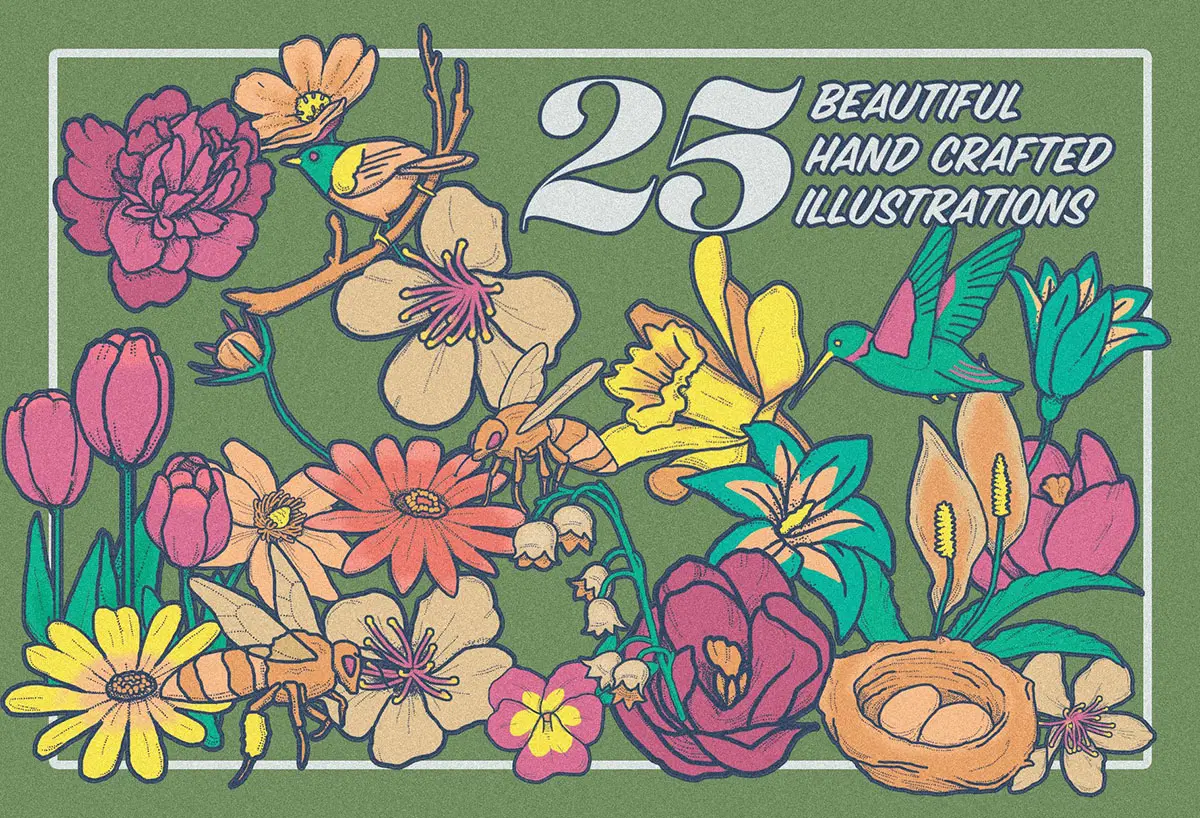 Retro Spring Flowers Bundle 潮流复古花卉蔬菜植物线描手绘插画插图ai设计素材源文件合集