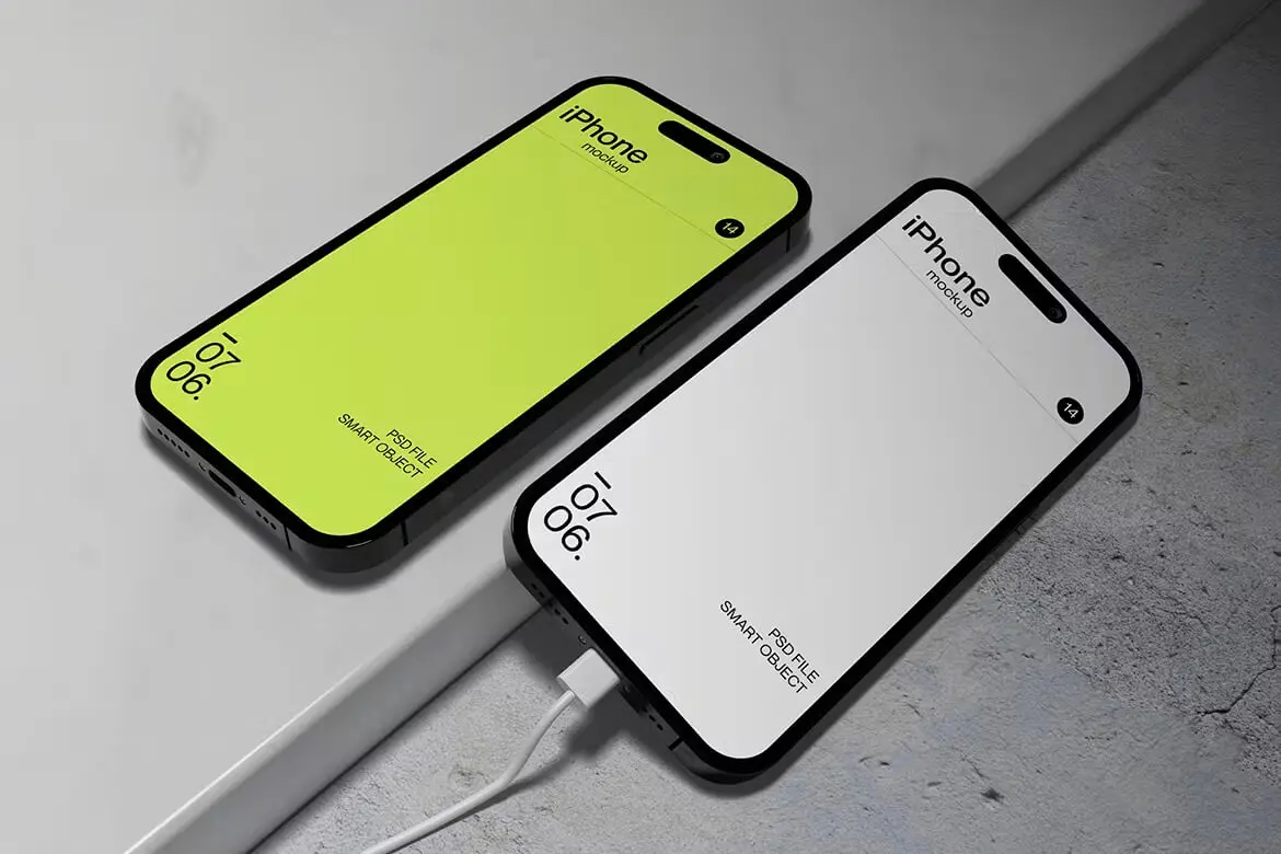 Iphone 14 Mockup 3张充电的苹果14手机模型用户界面ui设计展示贴图ps样机素材模板