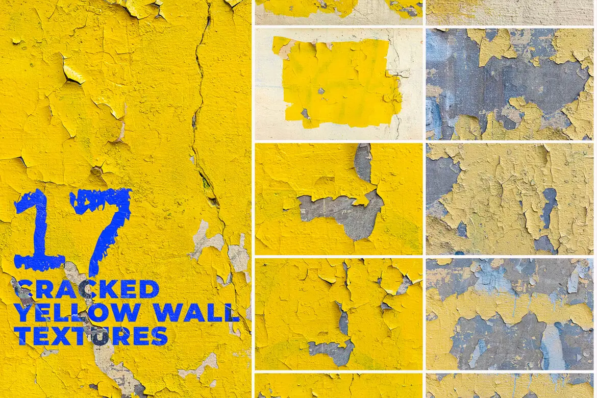 17 Cracked Yellow Wall Surface Textures 17张陈旧裂开黄色裂纹墙皮墙面纹理背景叠加图片设计素材