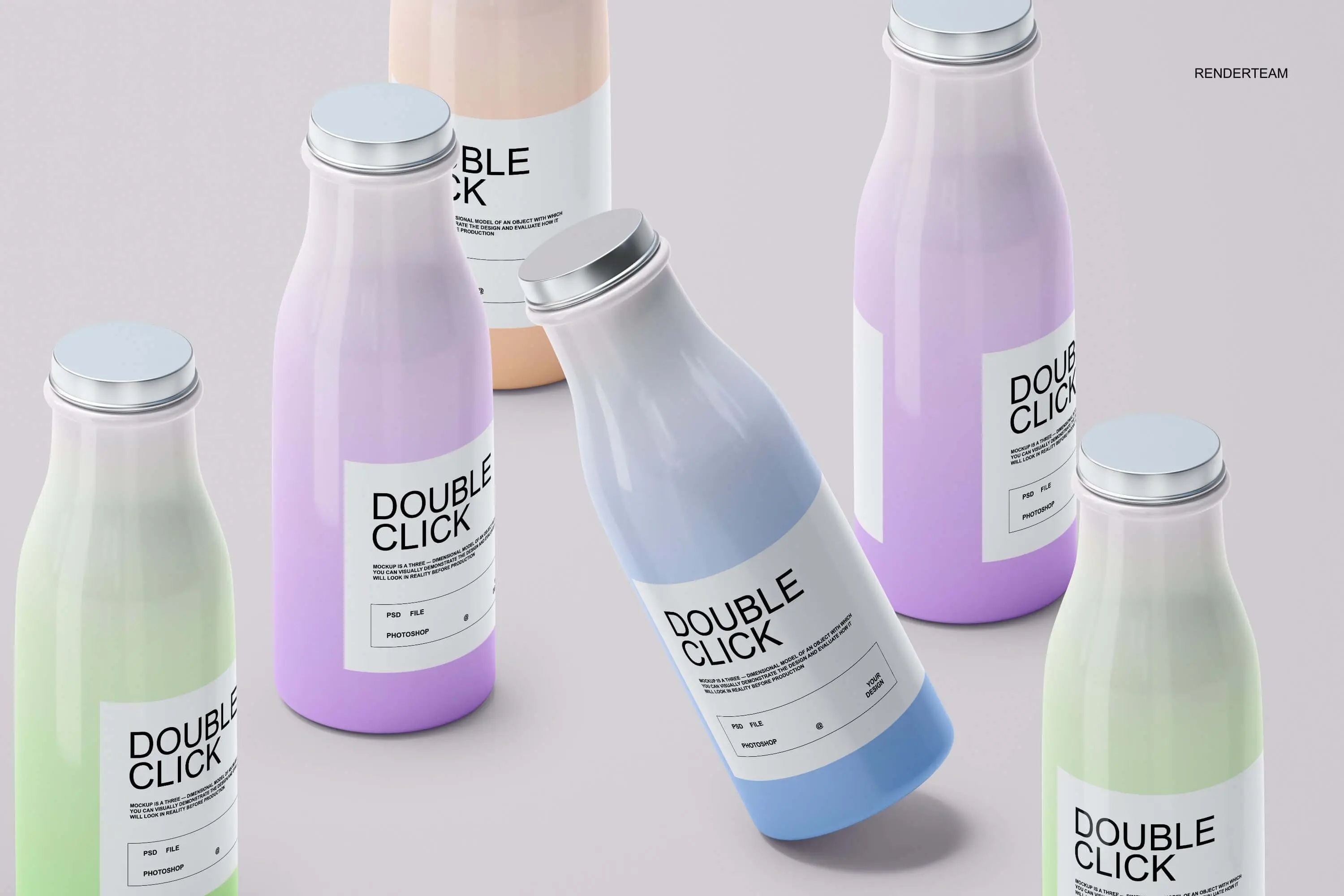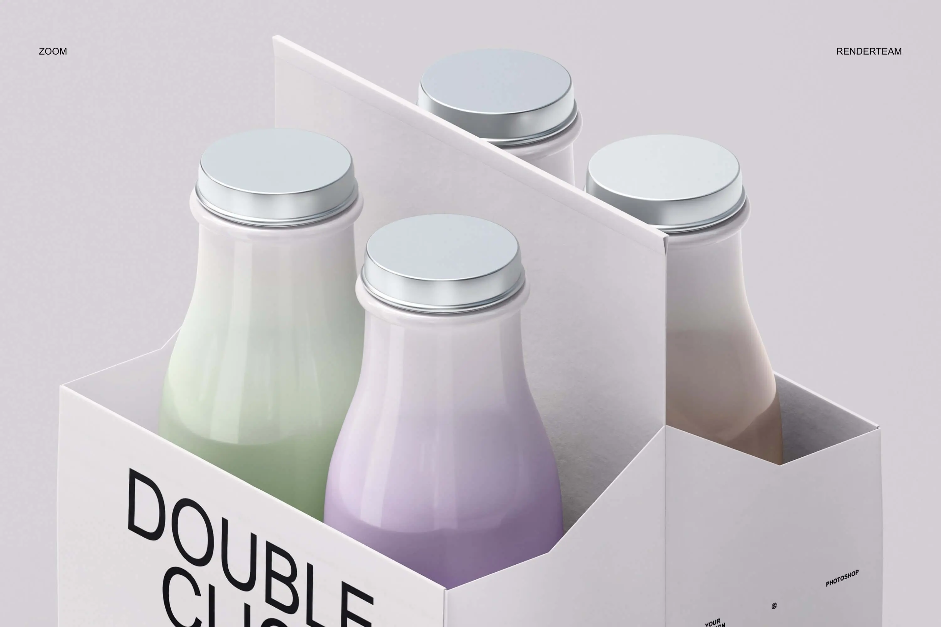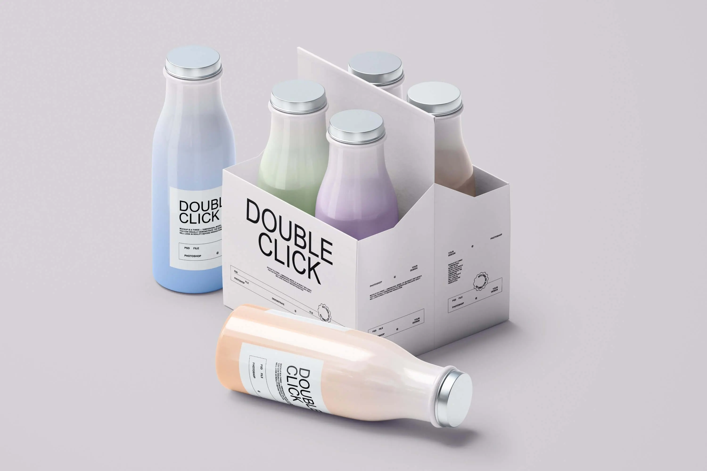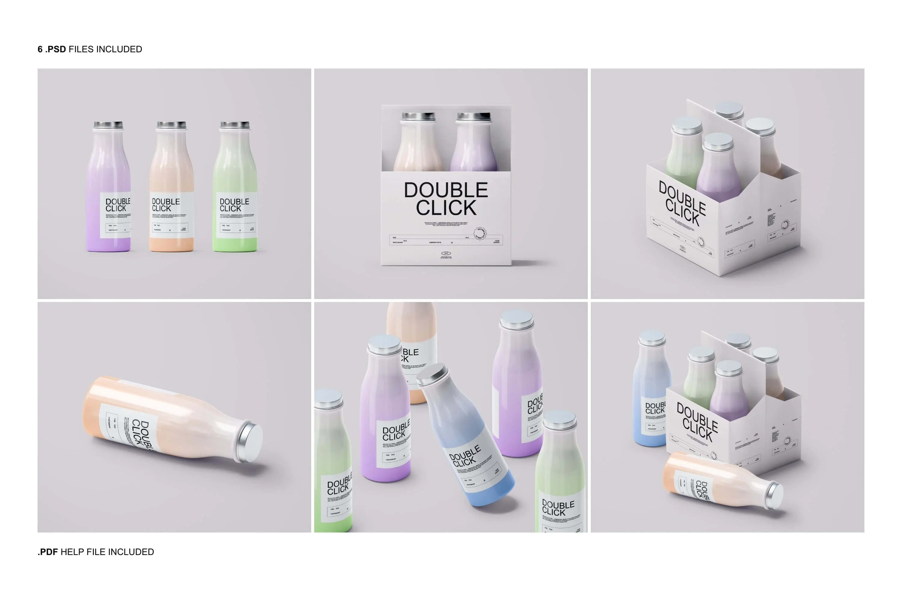 Yogurt Bottle and Box Mockup Set 6款时尚酸奶瓶牛奶果汁饮料玻璃瓶组合包装设计贴图ps样机素材