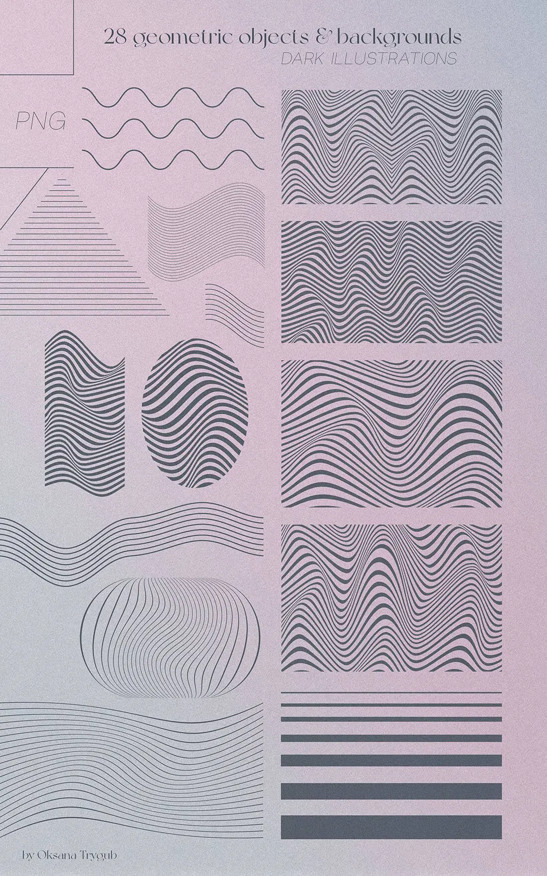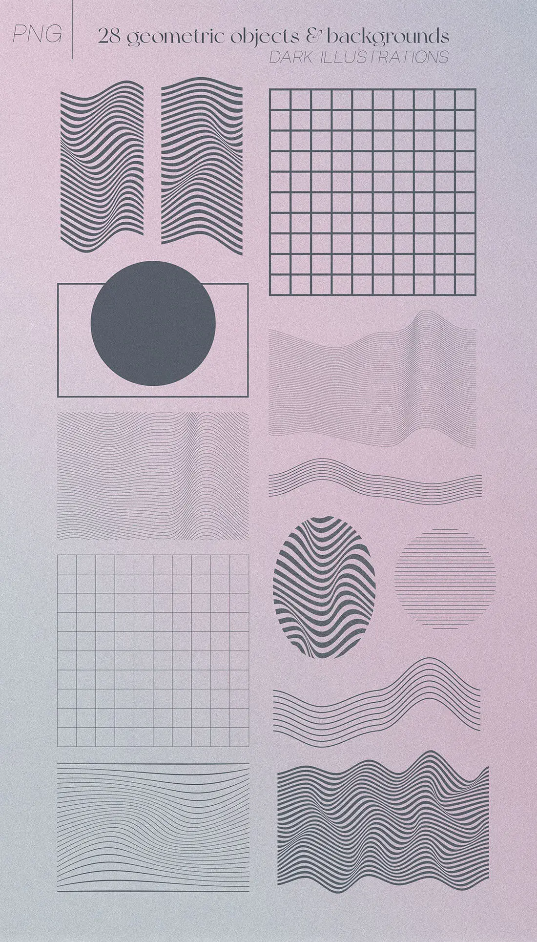 28 个对象和背景/深色插图(PNG 文件从 ~7700px 到 ~1300px,300 dpi)