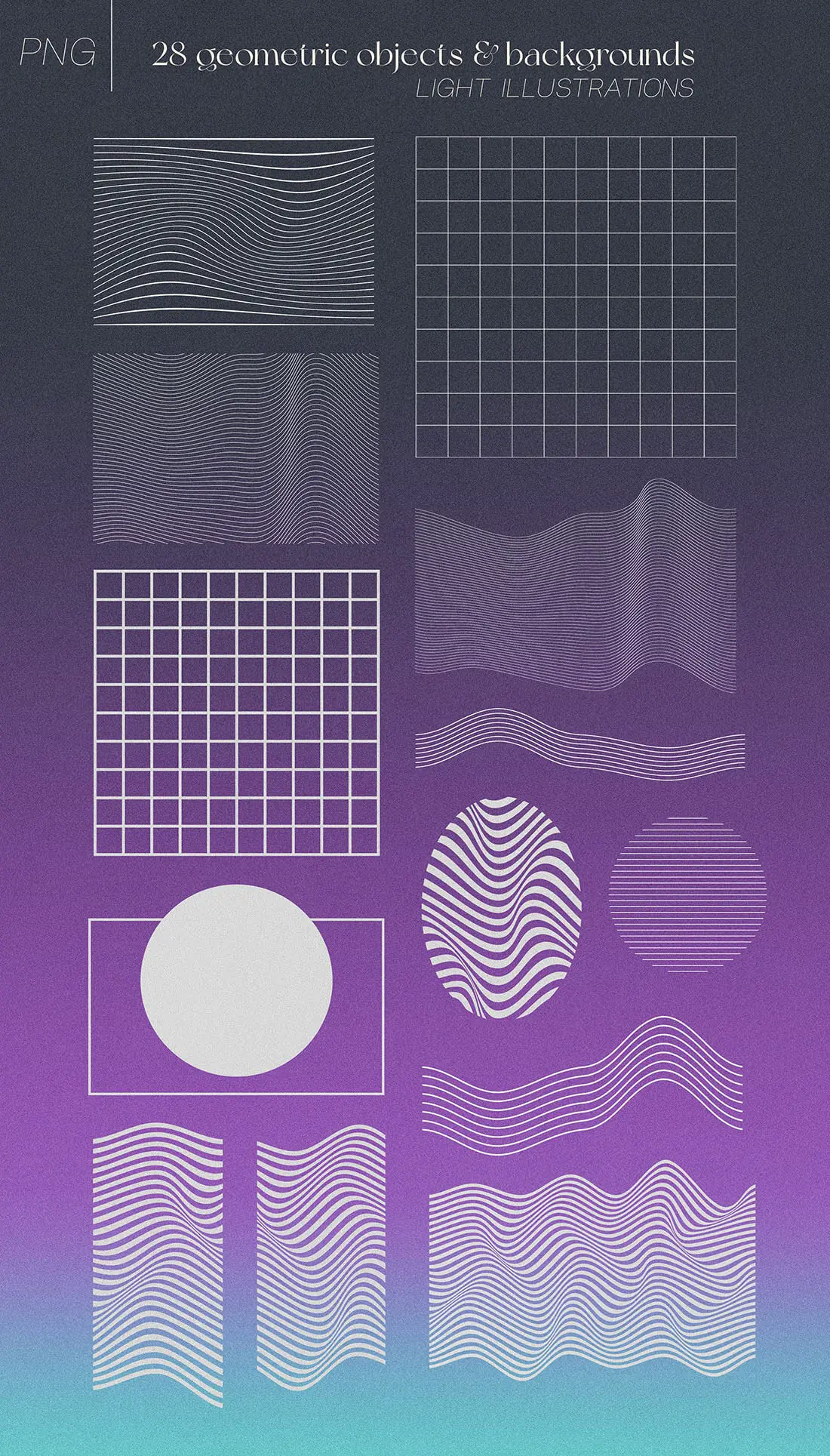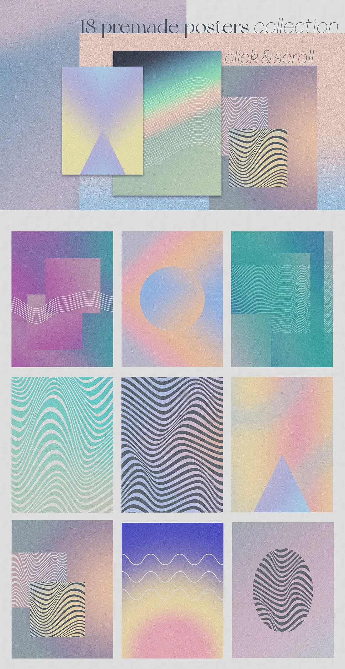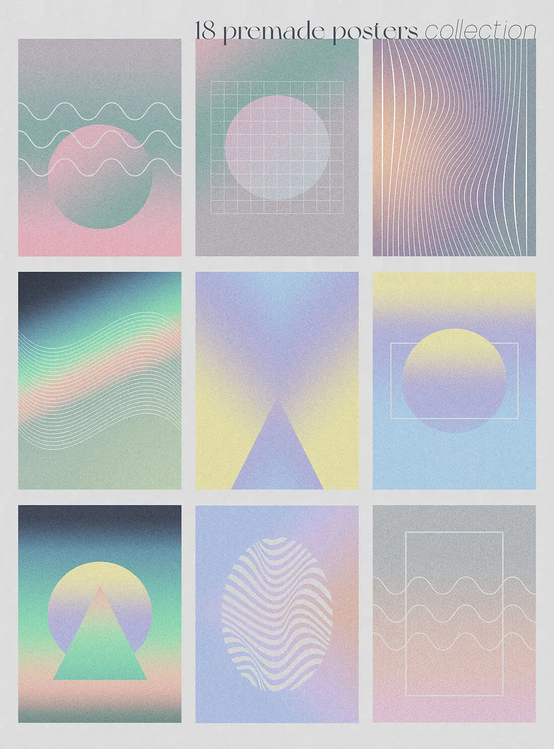 亲爱的朋友,很高兴向您介绍我的新产品“怀旧渐变”。我希望你会喜欢!这个系列的灵感来自 70 年代和 80 年代的风格。可爱的选择粒状渐变背景、复古几何对象和形状、迷幻、错觉波浪条纹图案和一组预制海报。打造时尚现代设计所需的一切!