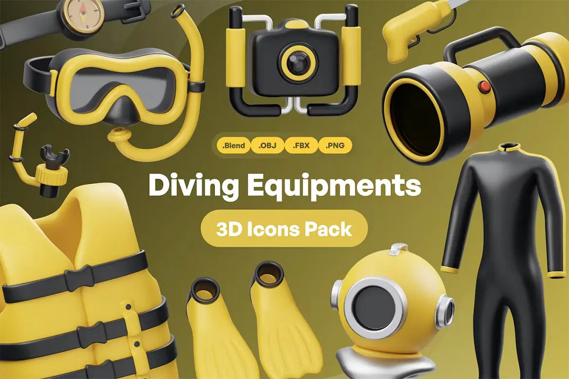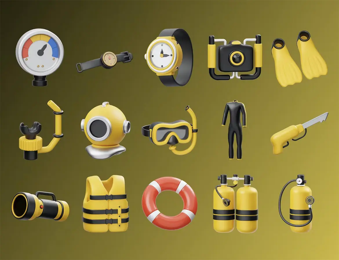 Diving Equipment 3D Icon 15款潜水游泳健身器材3D插图图标icon设计素材psd分层文件