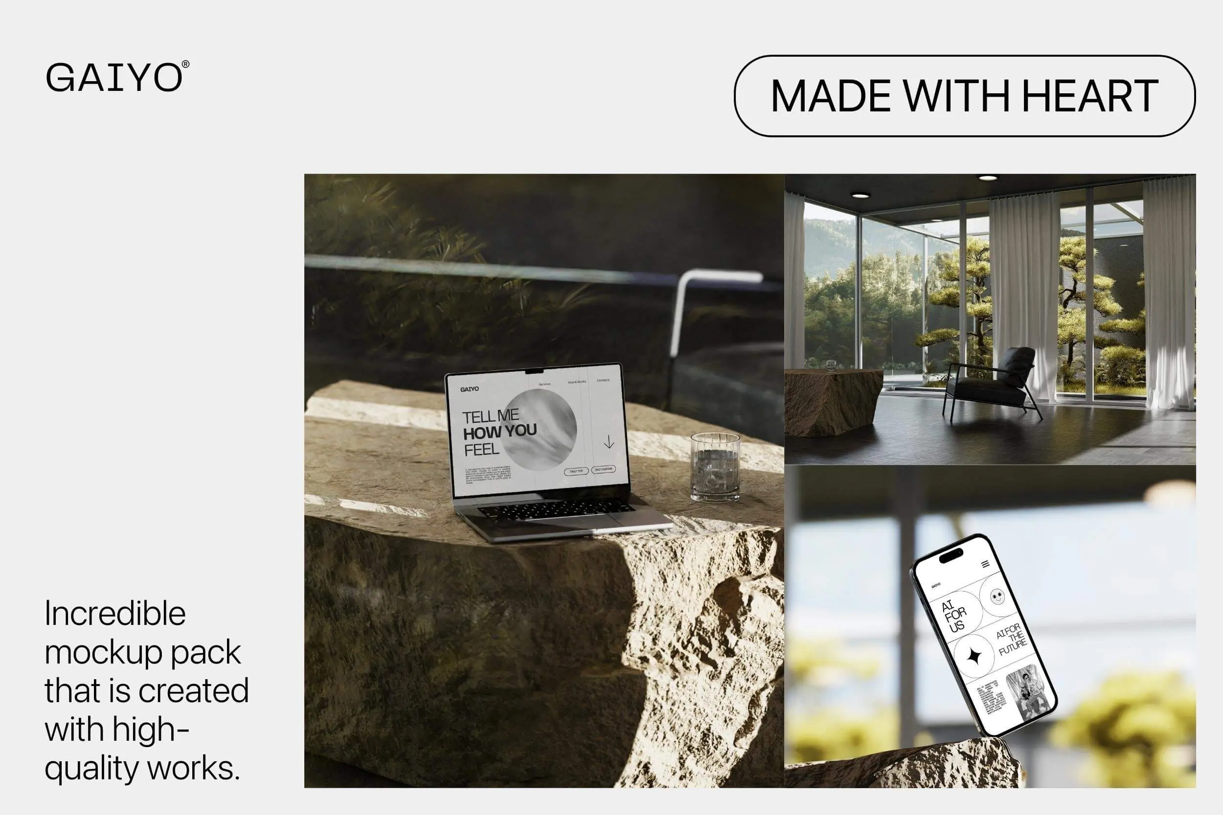 使用Gaiyo Stone室内样机和照片模板以简单时尚的方式展示您的室内设计项目。使用这些模型模板使您的设计变得令人难忘。