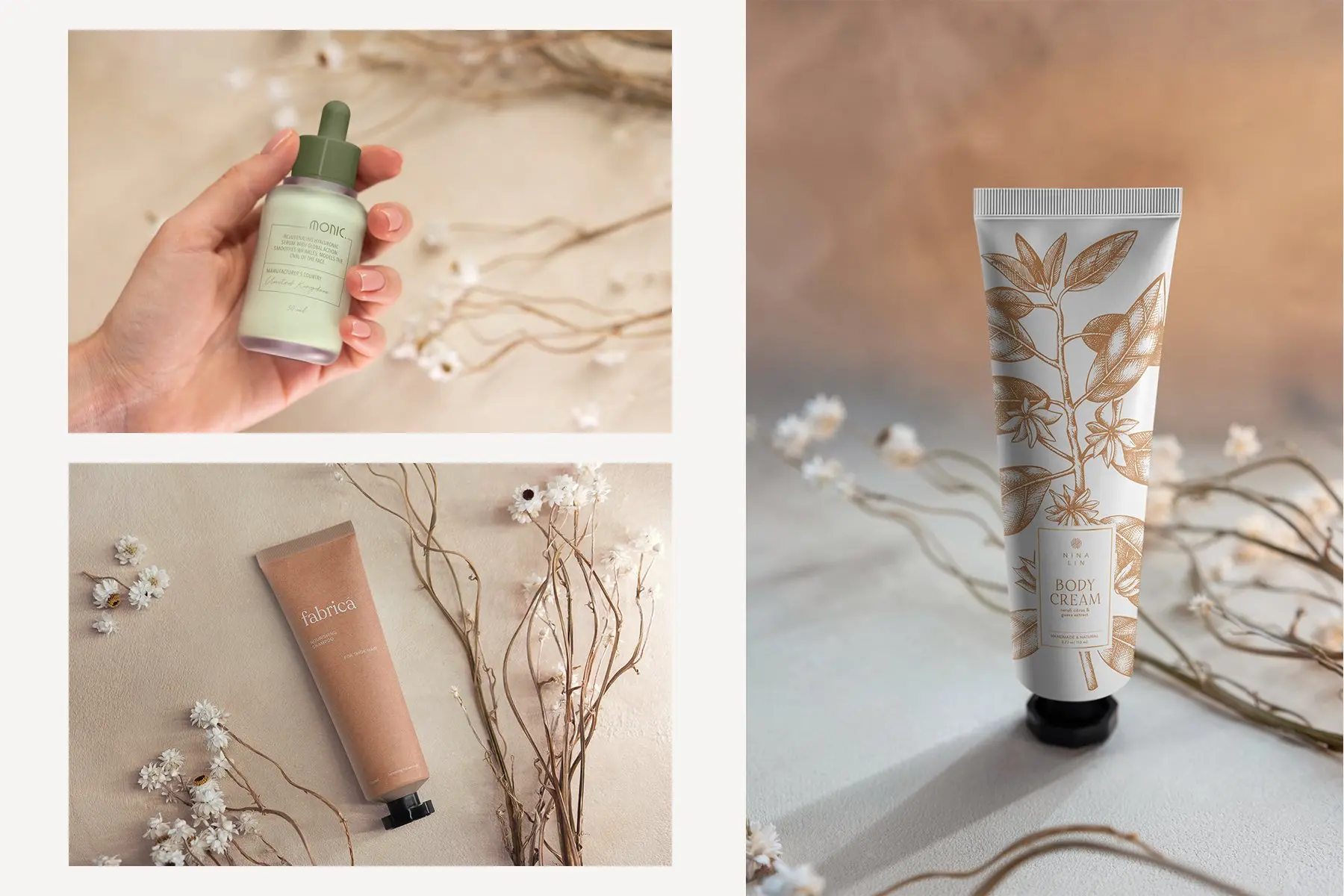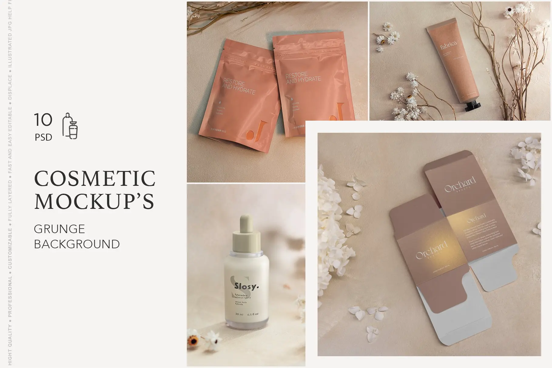 Cosmetic MockUp’s Grunge Background 美妆护肤品容器包装样机psd模板,化妆品分装瓶容器包装样机空白贴图