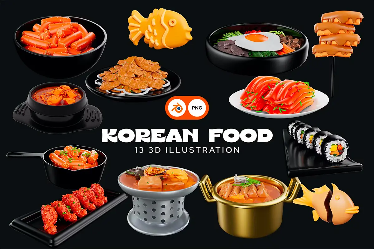 Korean Food 3D Illustration Pack 13款韩国传统美食料理3D插图插画webp免抠图片设计素材