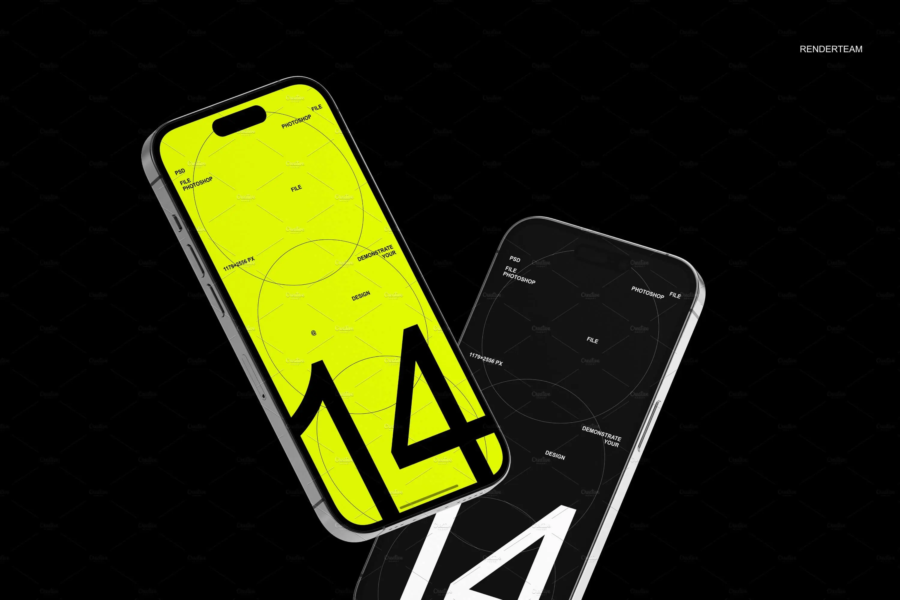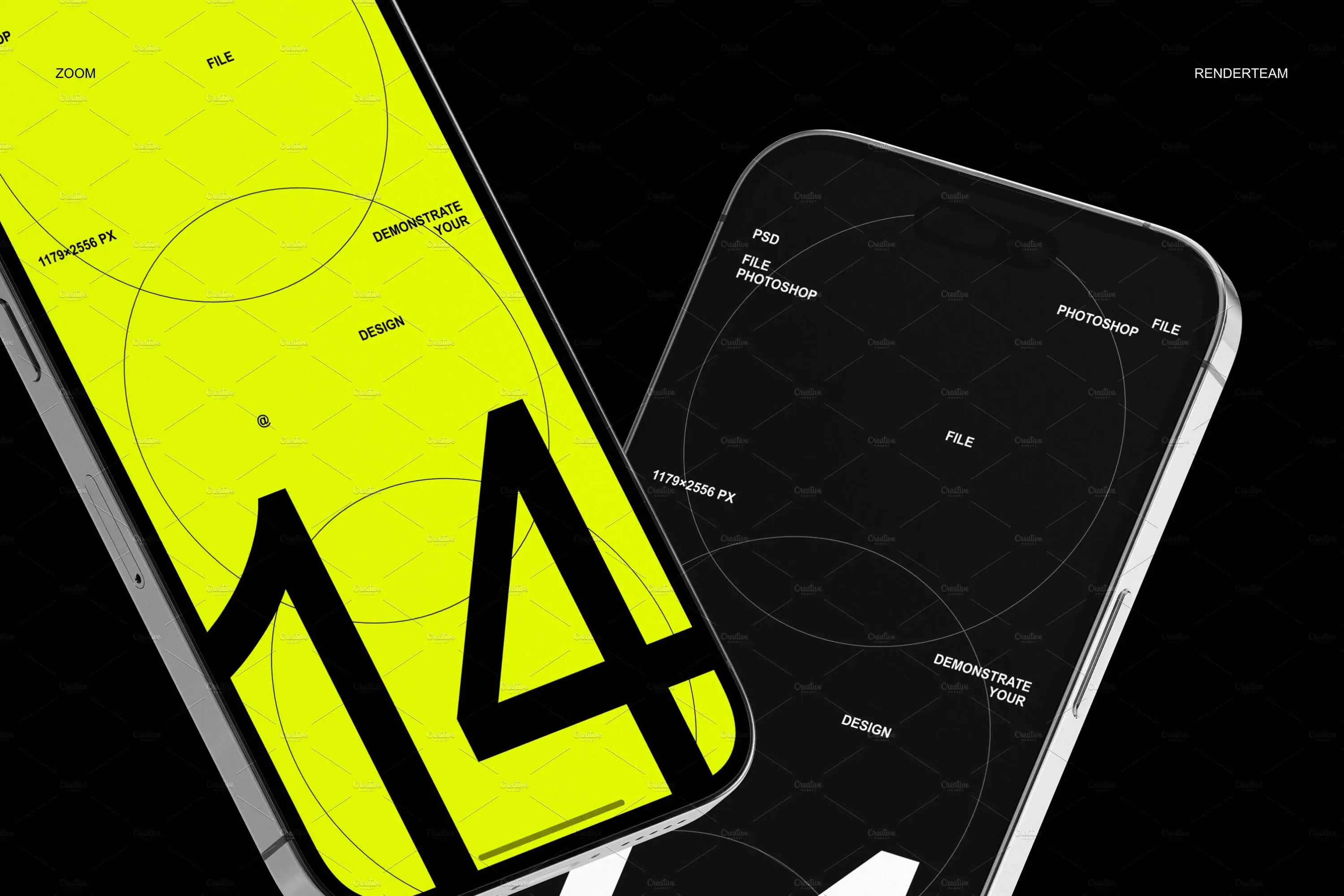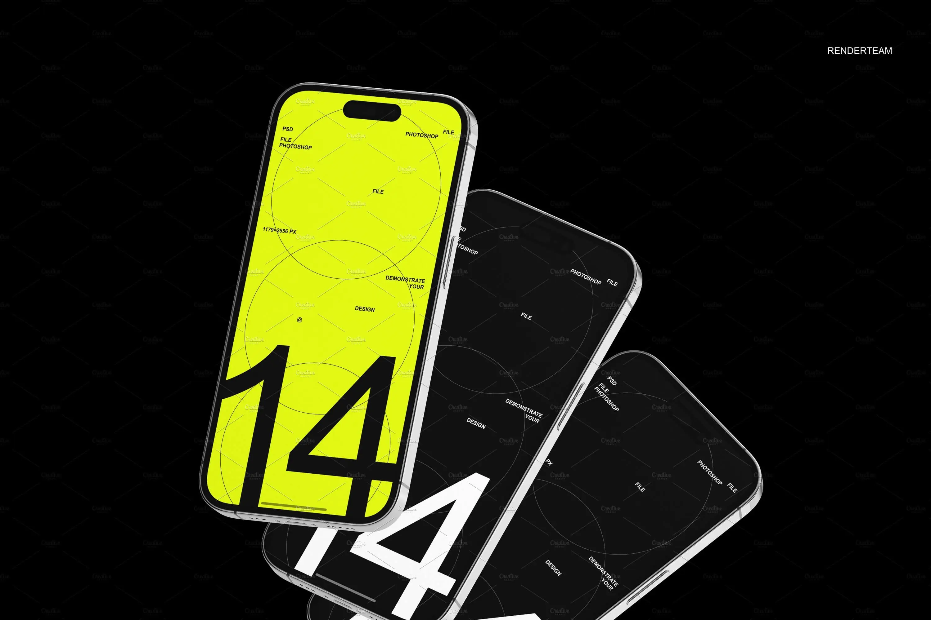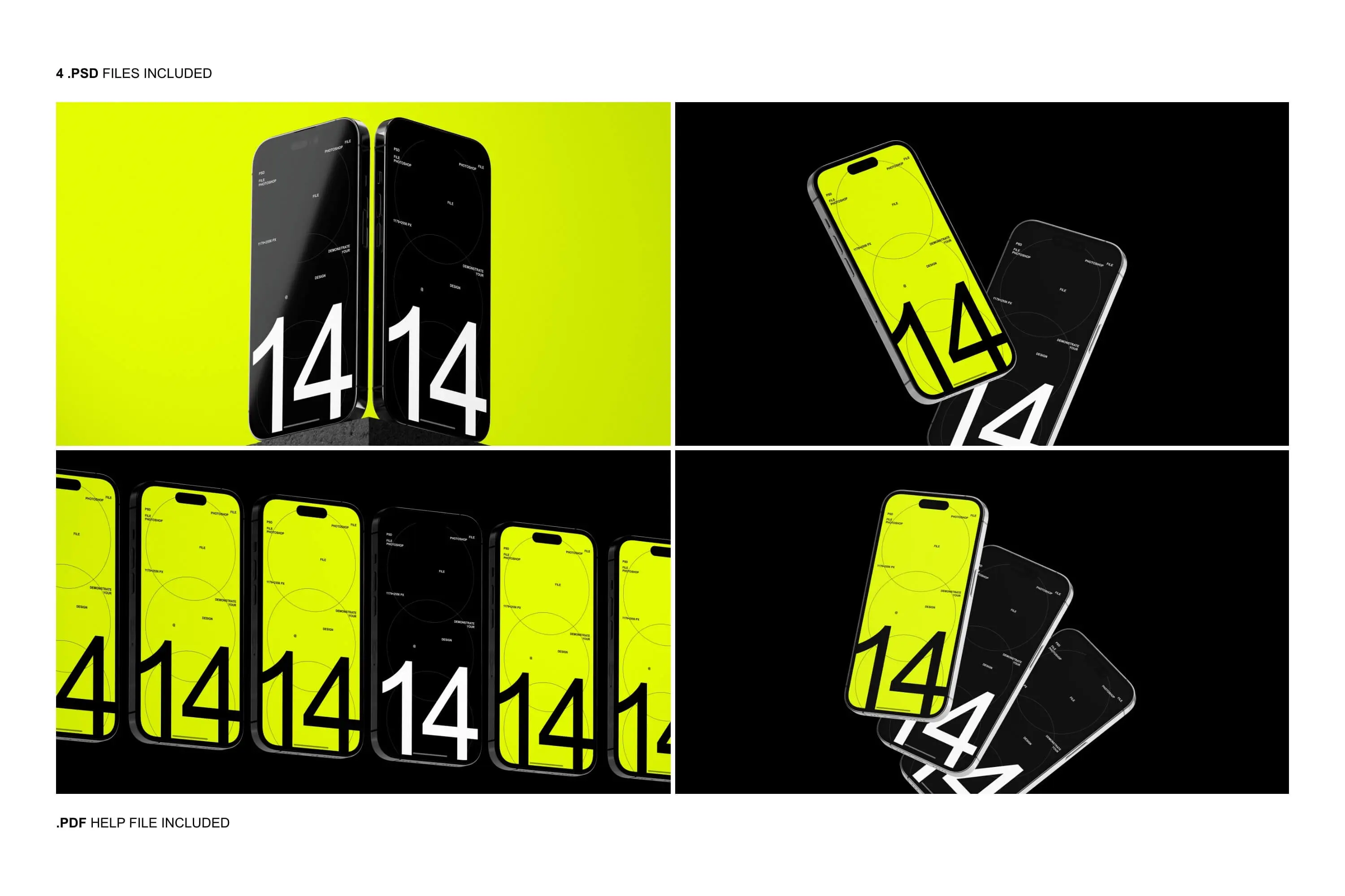 iPhone 14 Pro Mockup 4款极简iPhone14手机App应用ui界面设计作品展示ps样机素材效果图