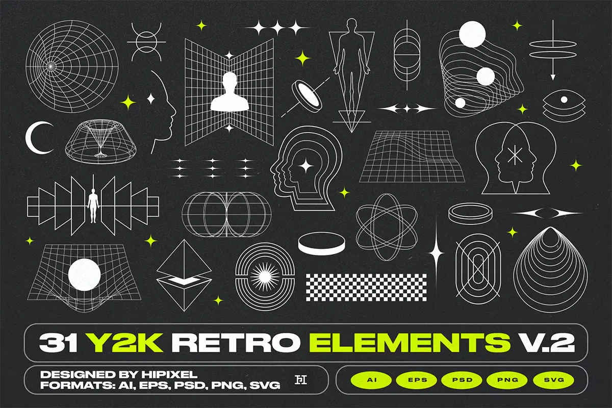 31 Y2K Retro Elements V.2 31款Y2K复古赛博朋克酸性线性几何图形元素矢量设计素材