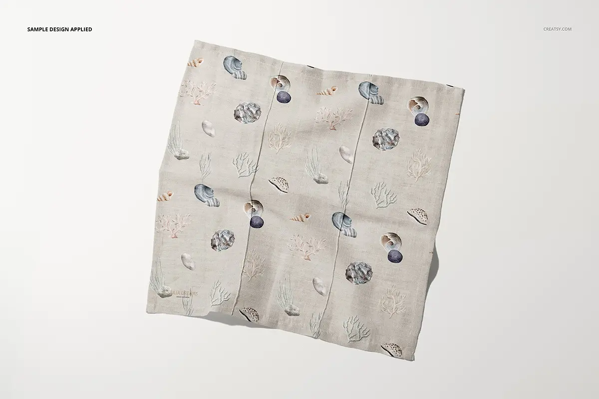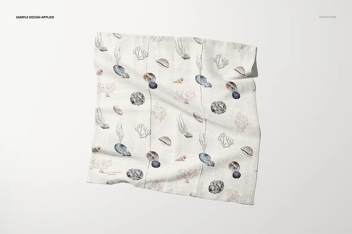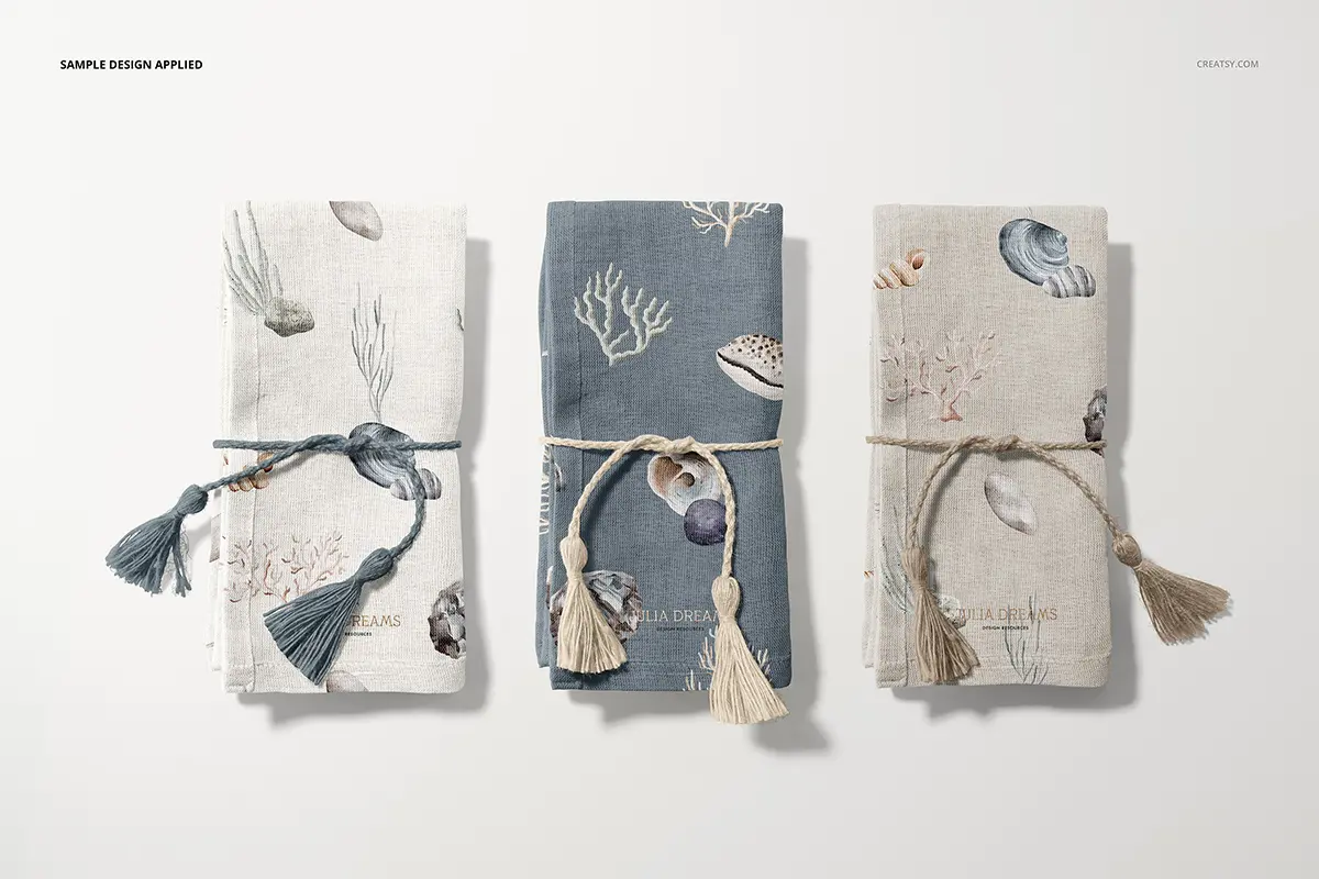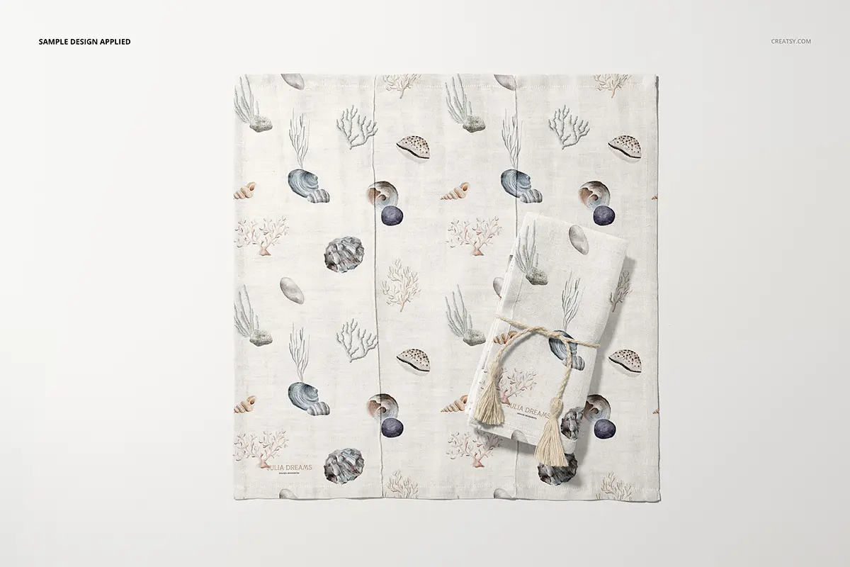 Cotton Linen Napkin Mockup Set 手工棉麻亚麻厨房巾餐巾垫布印花图案设计贴图ps样机素材展示效果