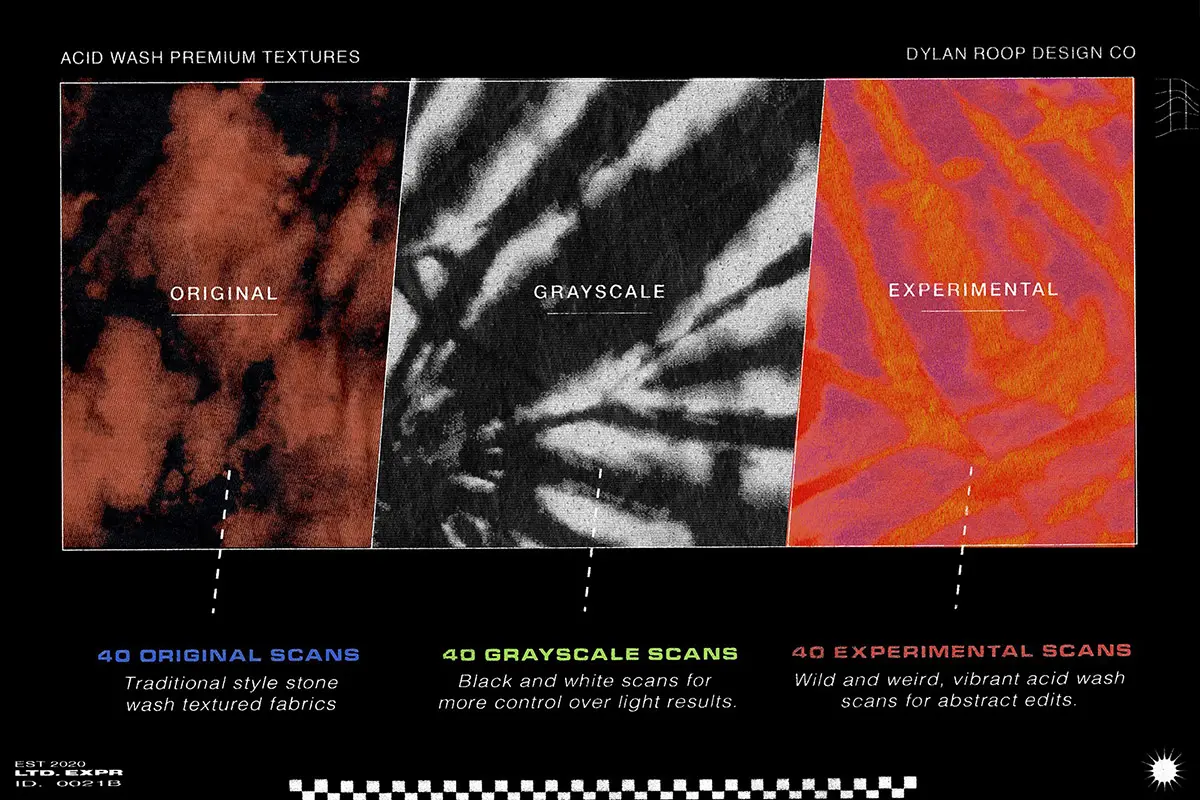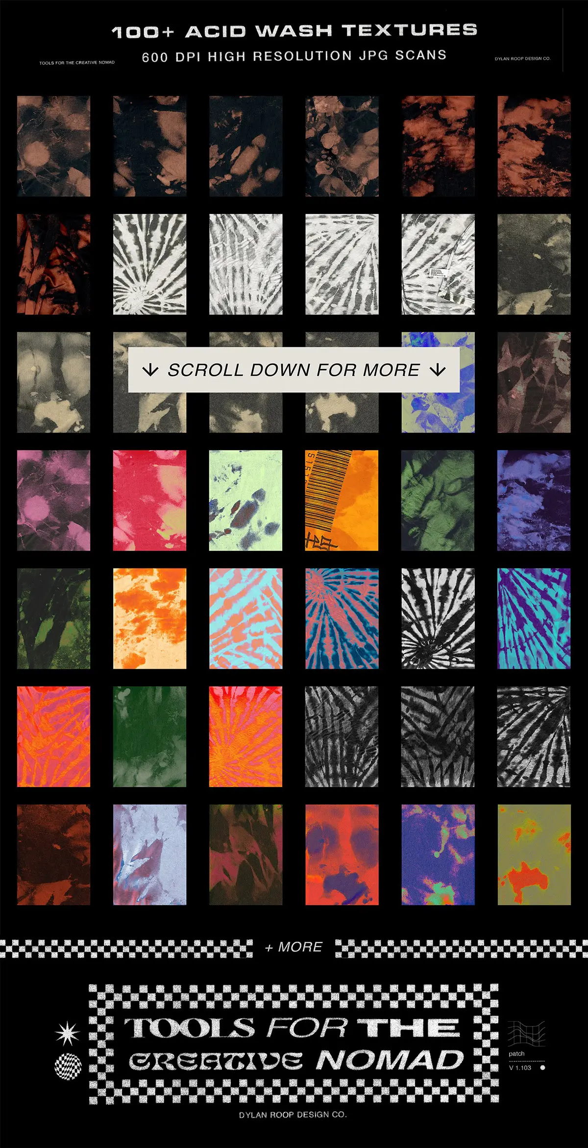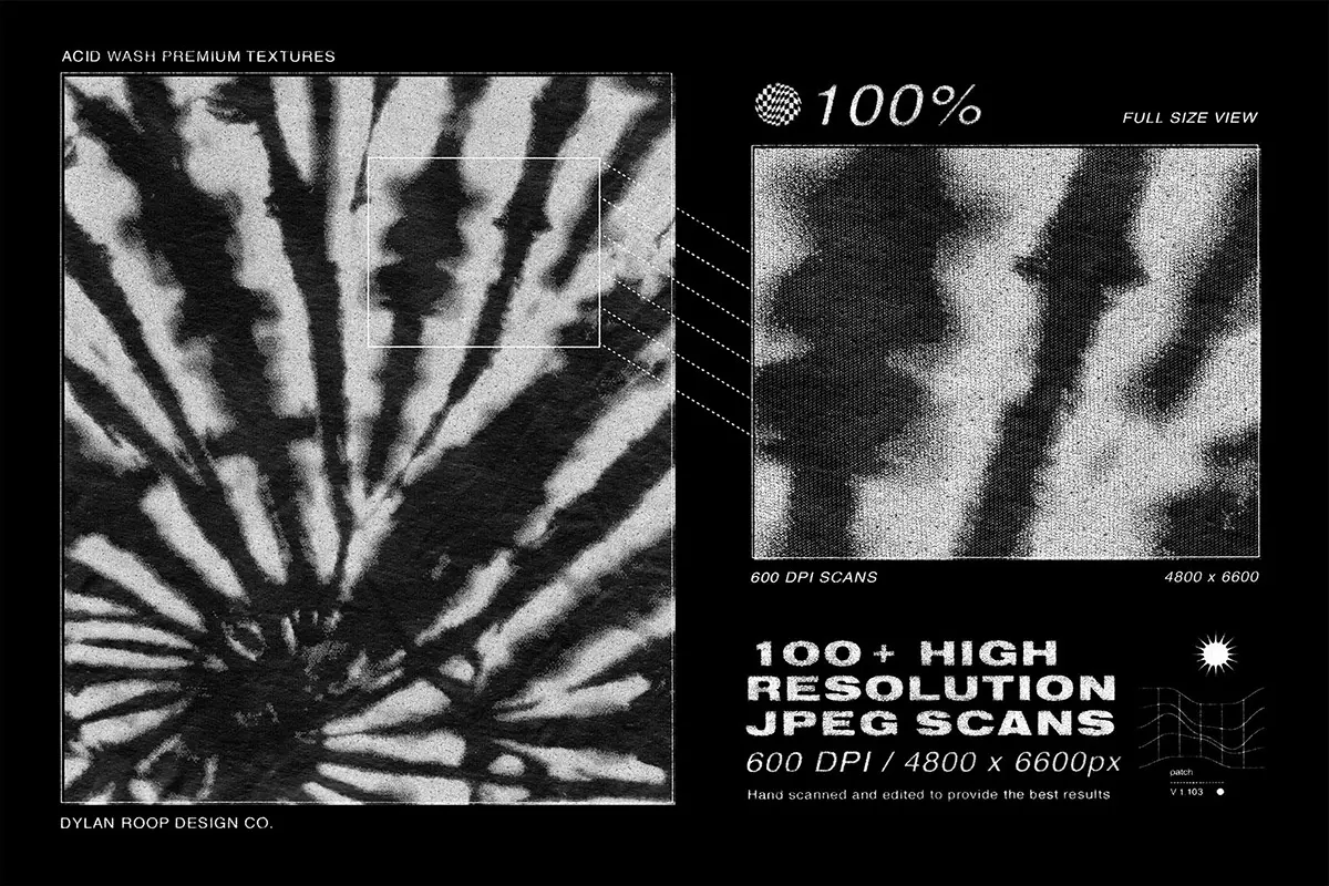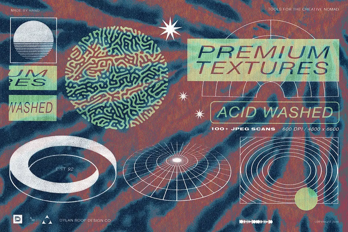 Acid Wash 是一系列高质量照片扫描的扎染和漂白织物。 这些都是手工扫描和编辑的,以提供专业和高质量的外观。 这些纹理非常适合商品和包装设计。