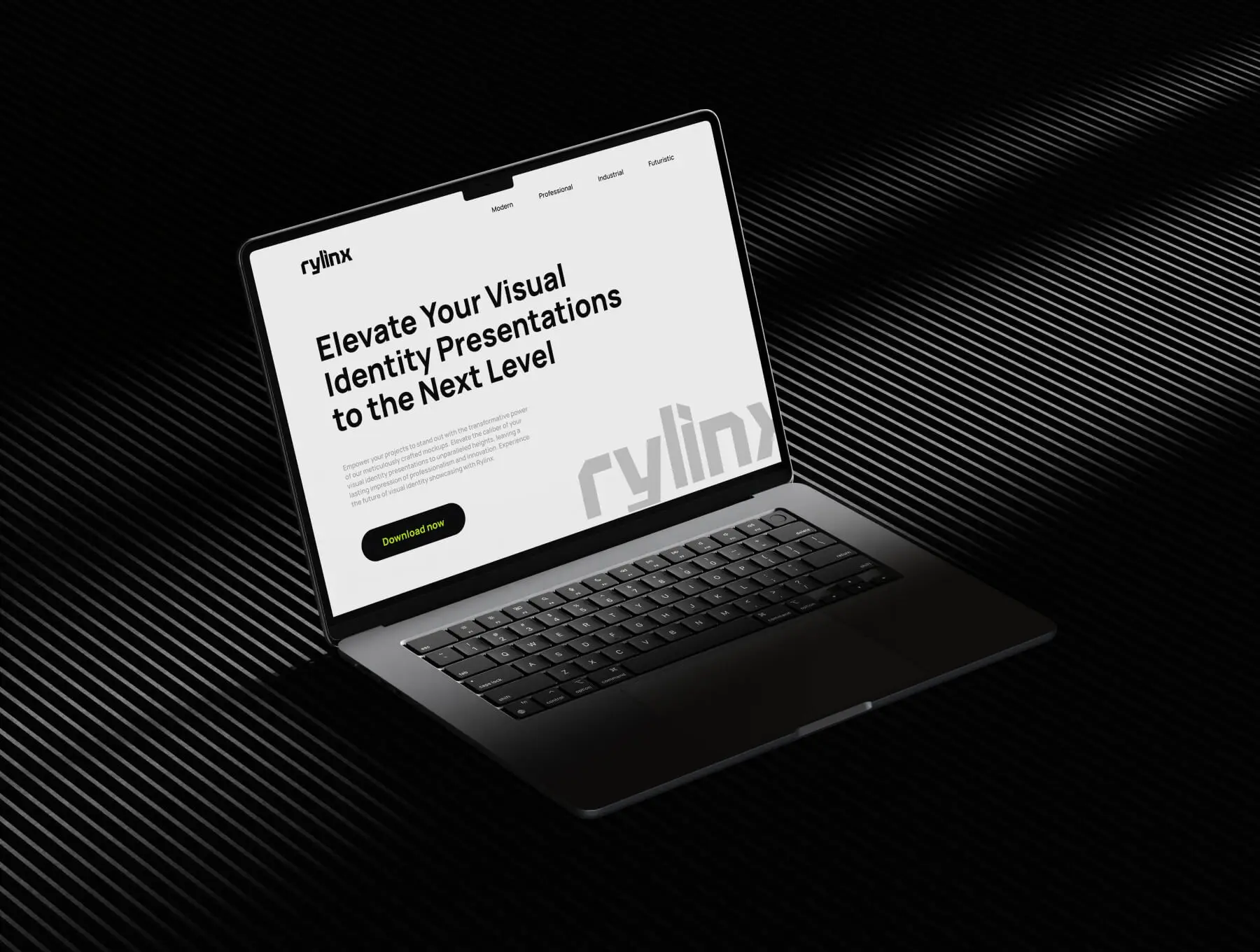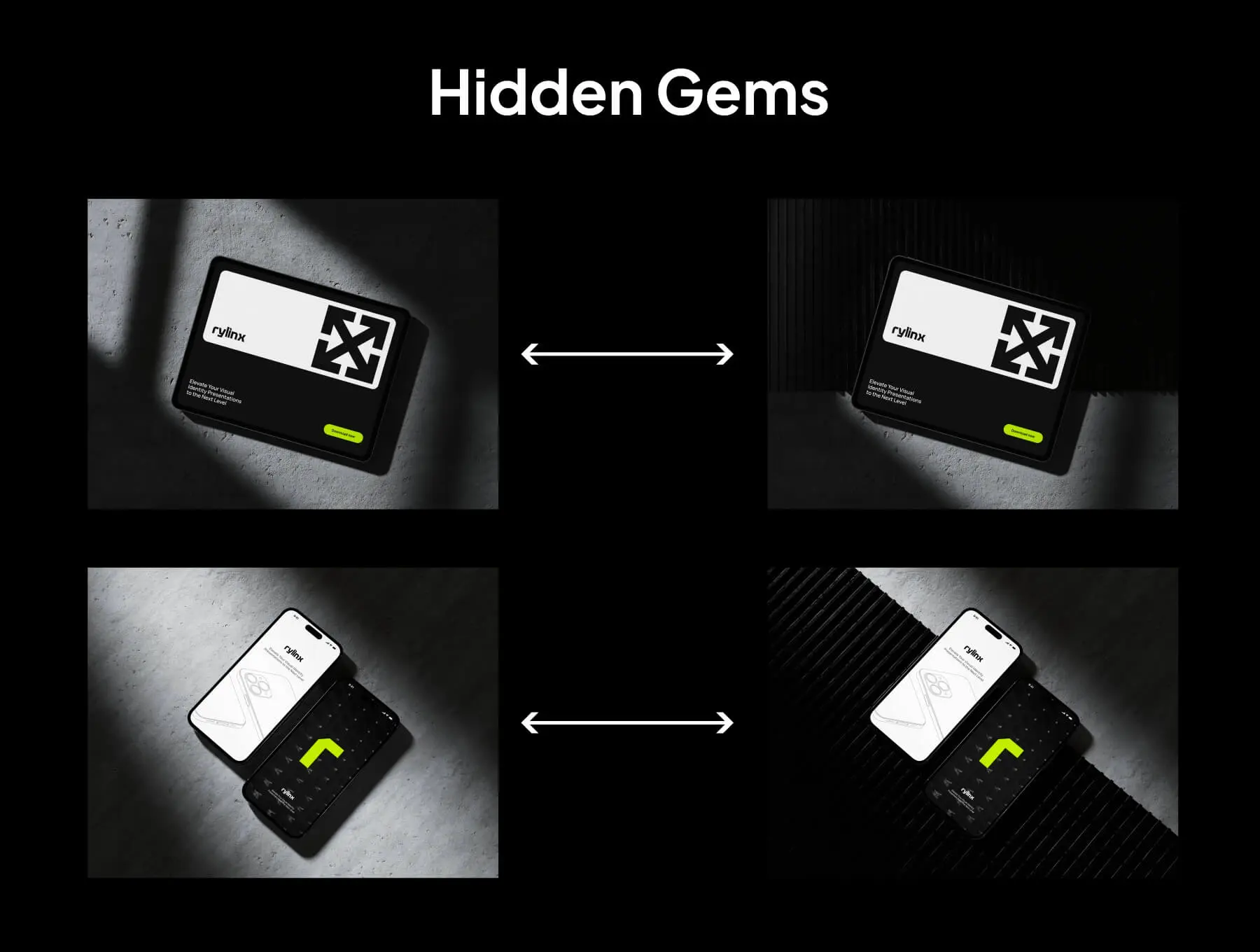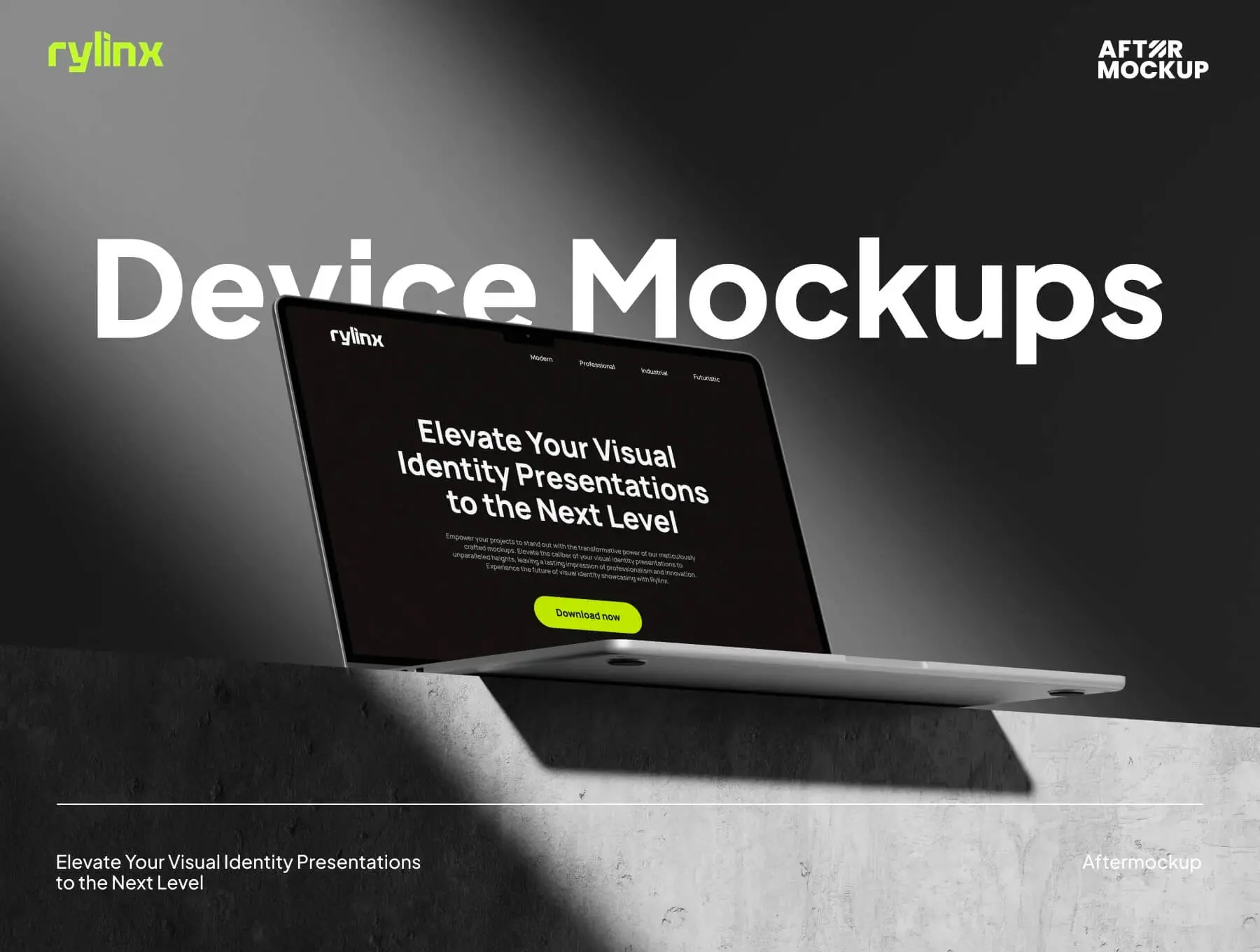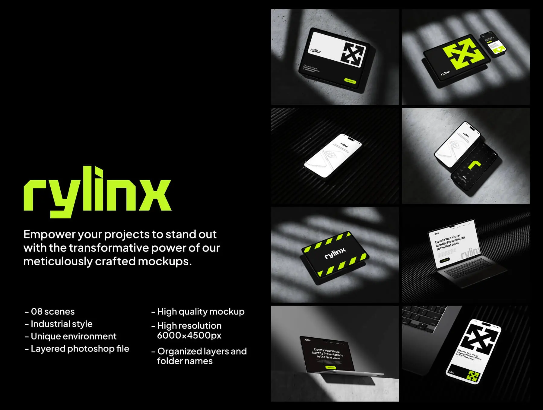 Rylinx Device Mockups 8款工业黑化风苹果iPhone 15手机MacBook笔记本iPad平板屏幕演示样机模板
