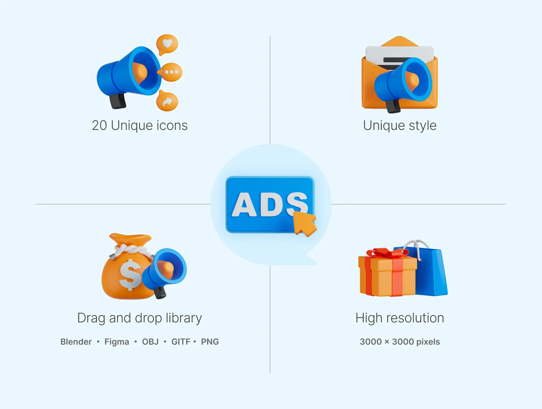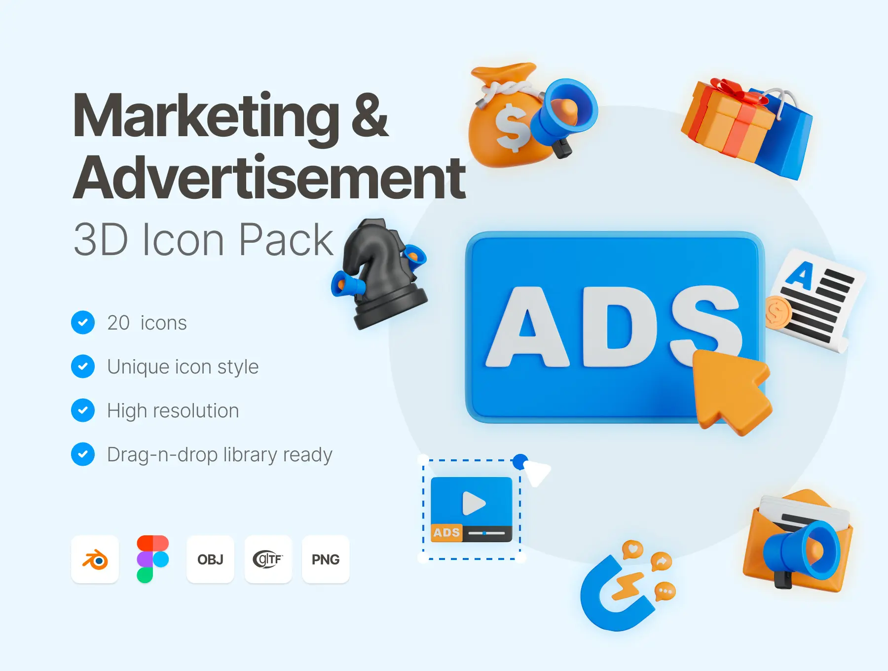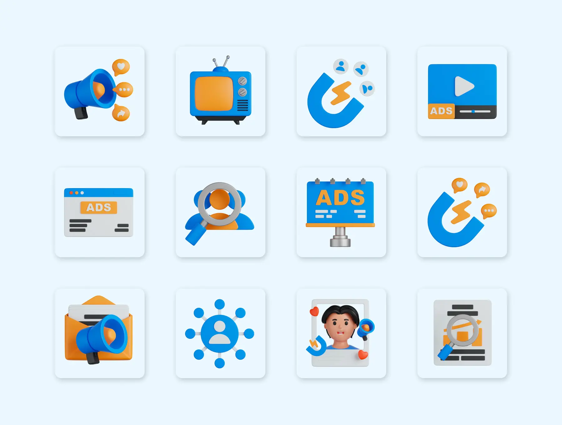 Marketing & Advertisement 3D Icons 20款时尚电商网络广告营销3D立体图标Icons设计素材包