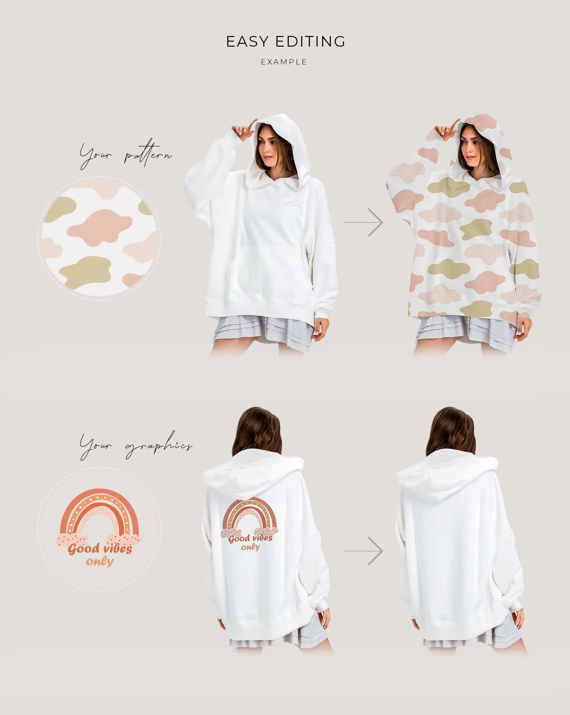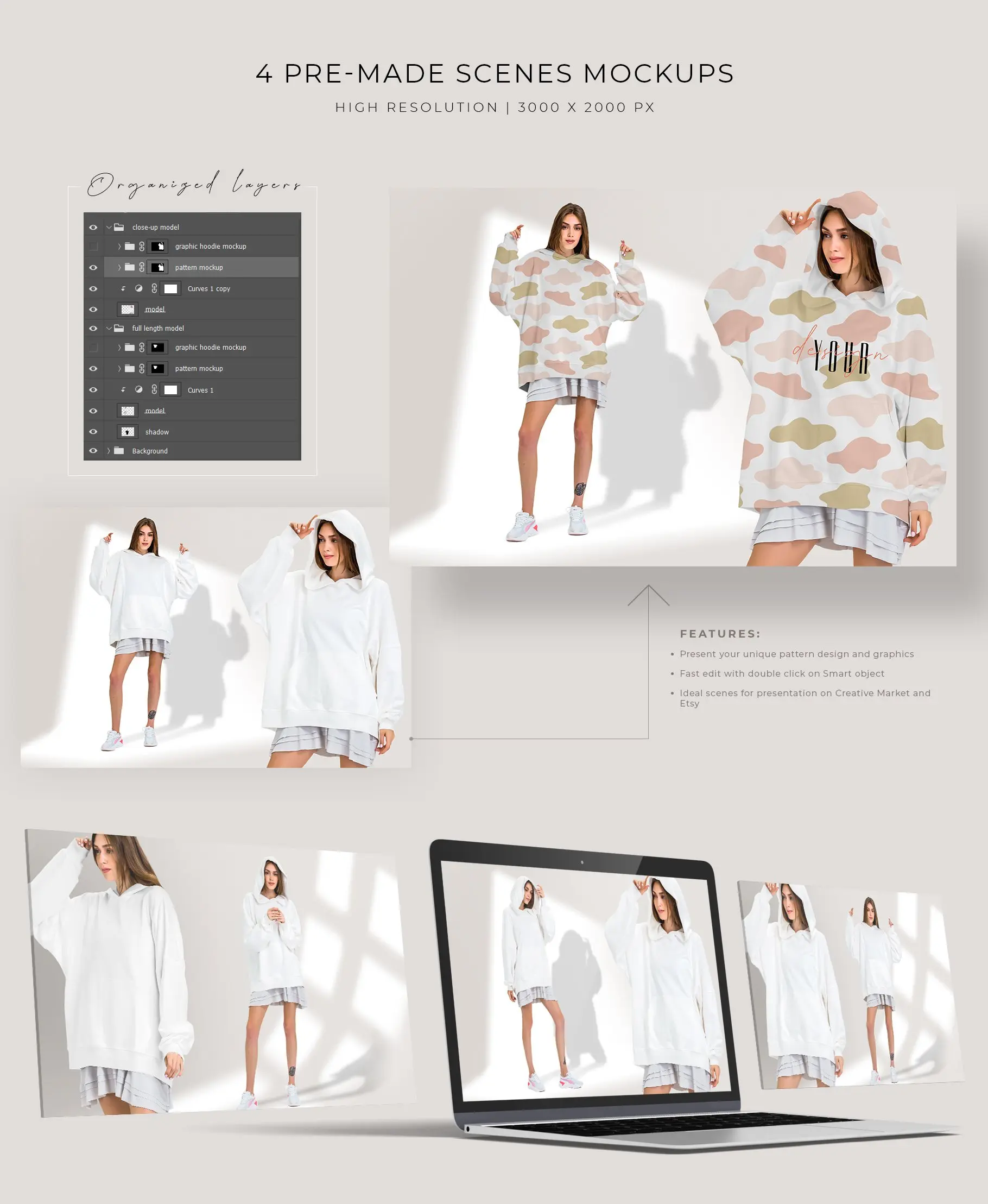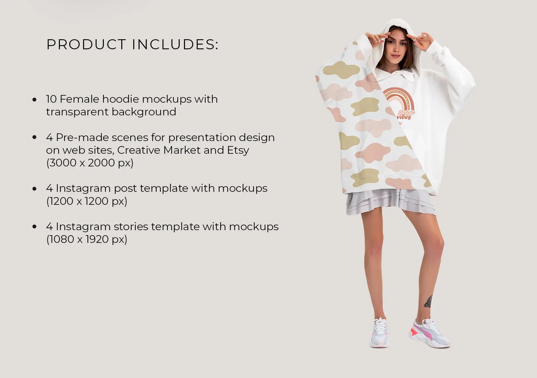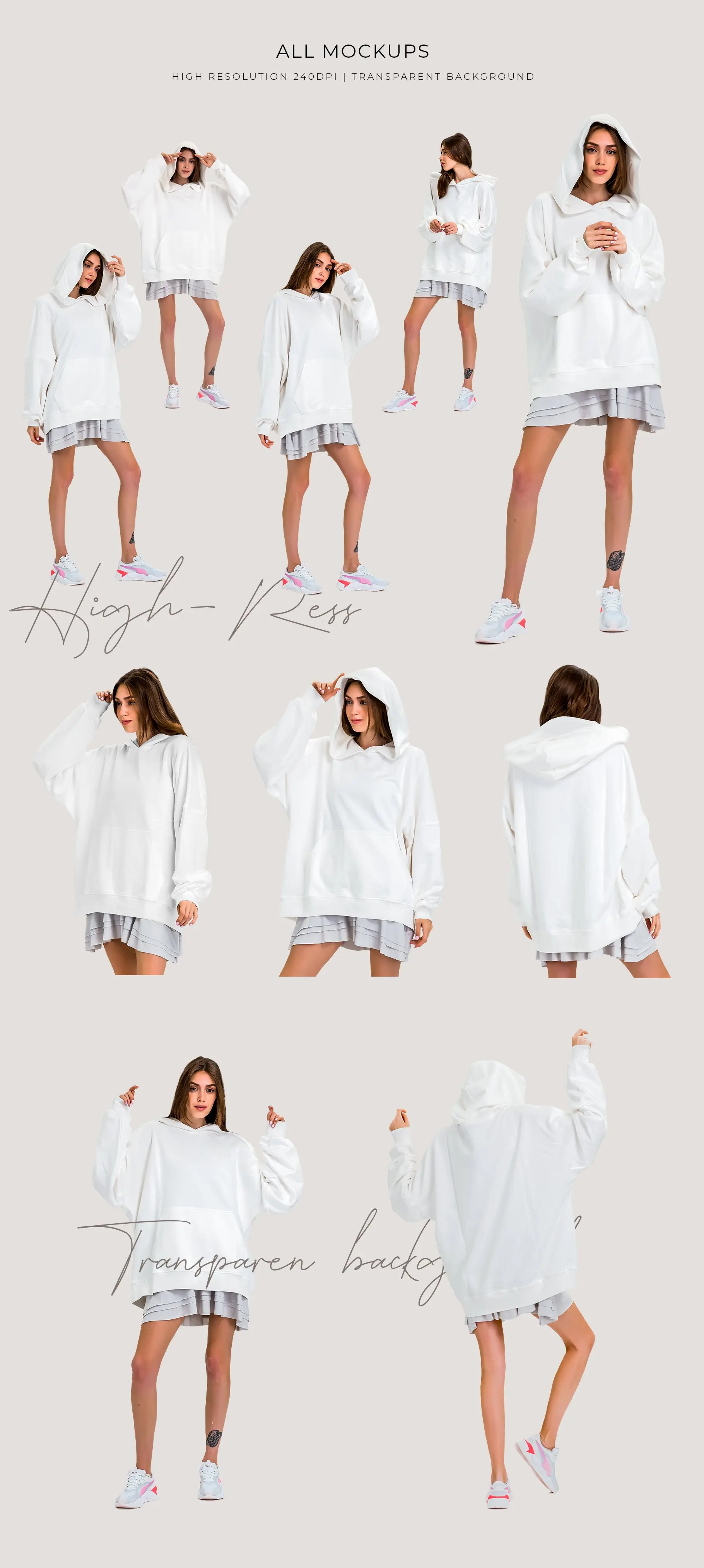 Oversize Hoodie Mockup Templates 潮牌宽松oversize女装长袖连帽卫衣logo图案设计贴图ps样机素材
