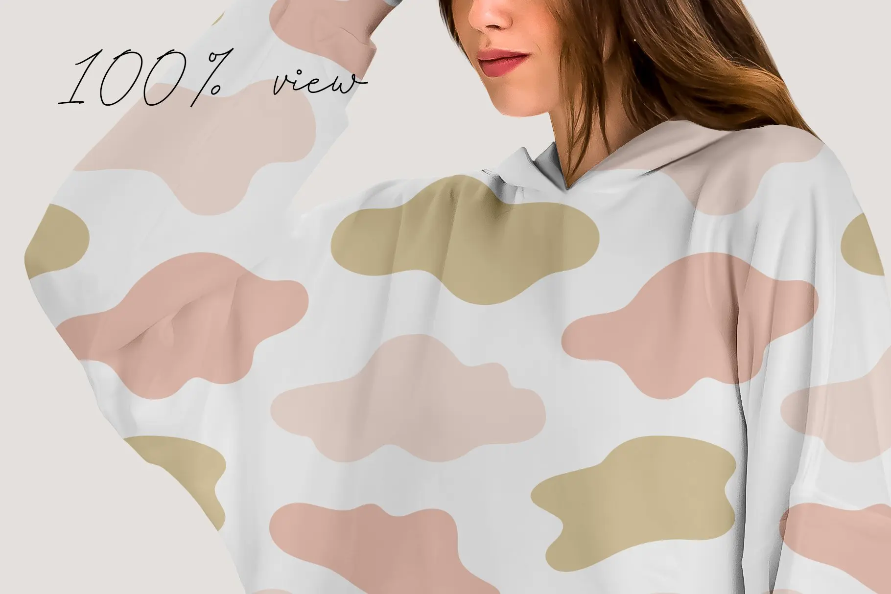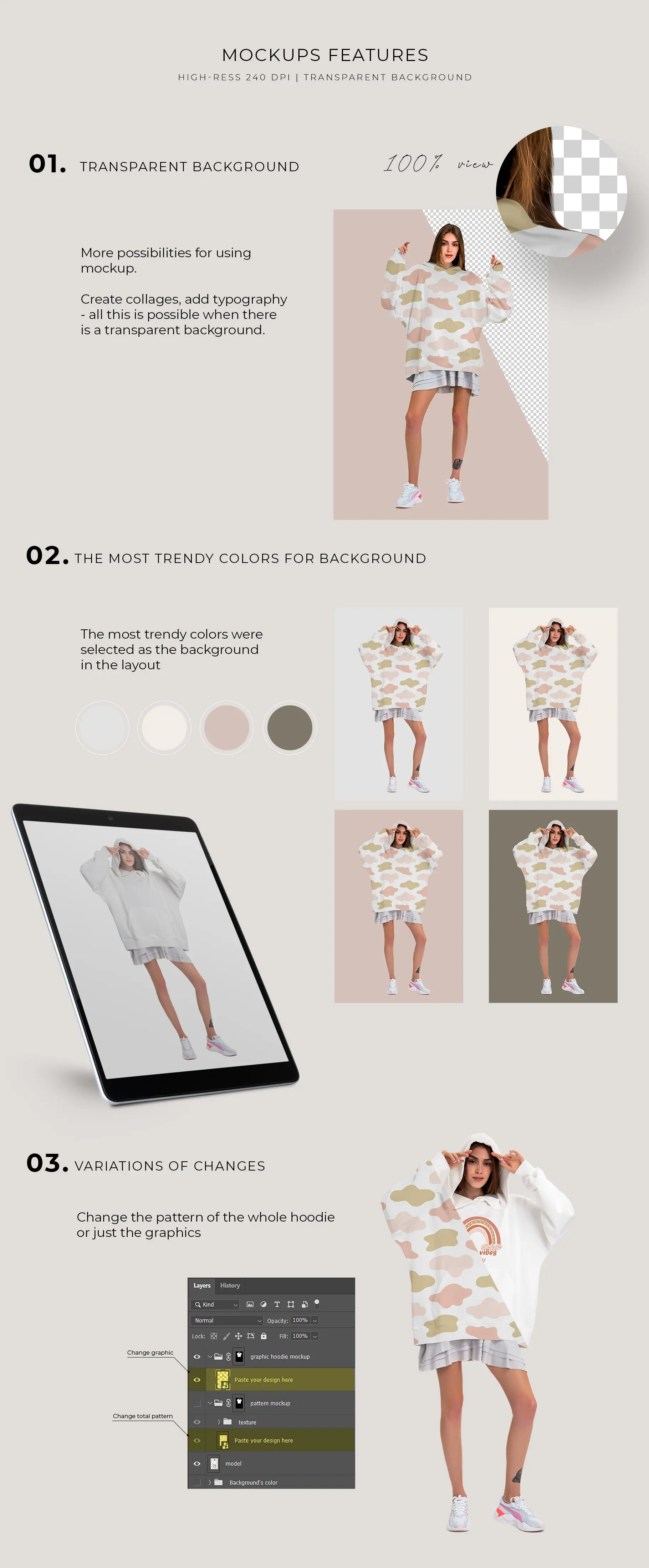 超大连帽衫样机模板 – 女性休闲服装样机的分层、可编辑 psd 文件与真实模型准备展示您的定制设计,只需双击智能对象放置您的图案设计。