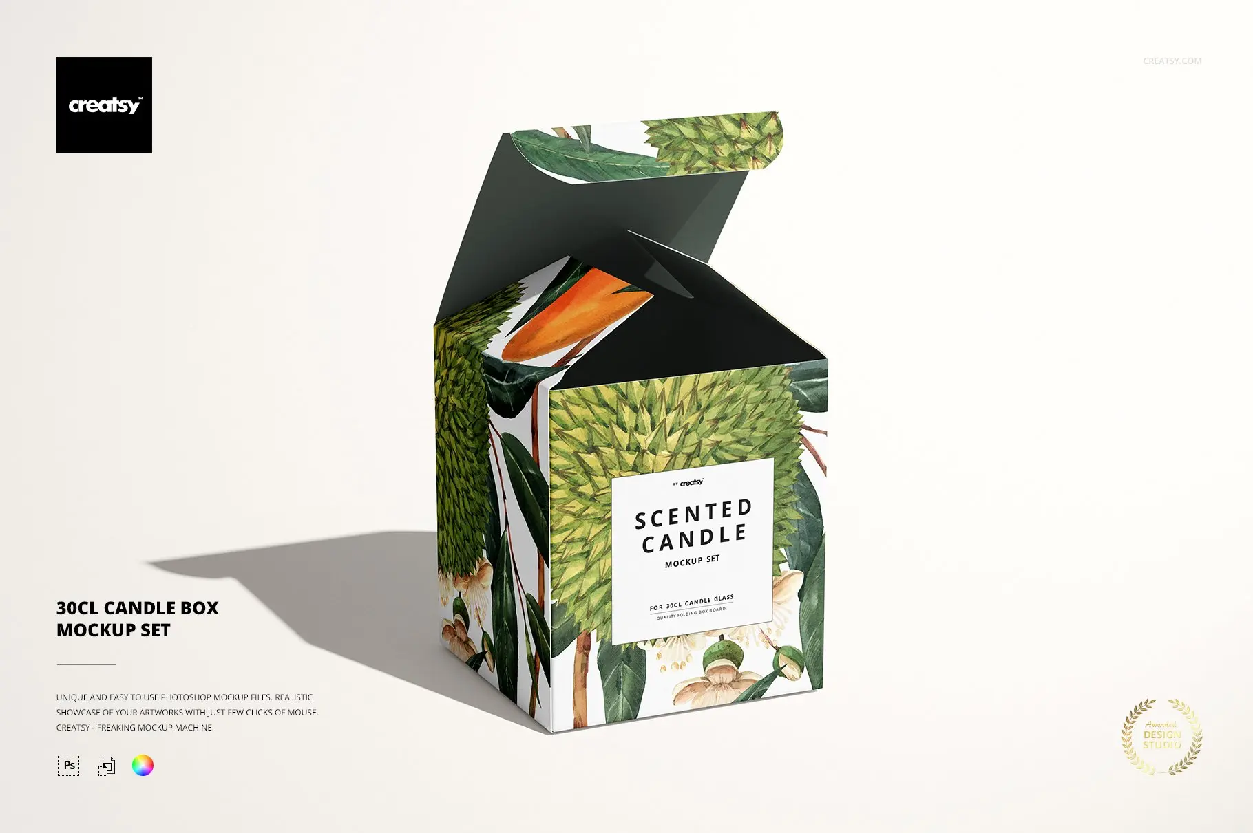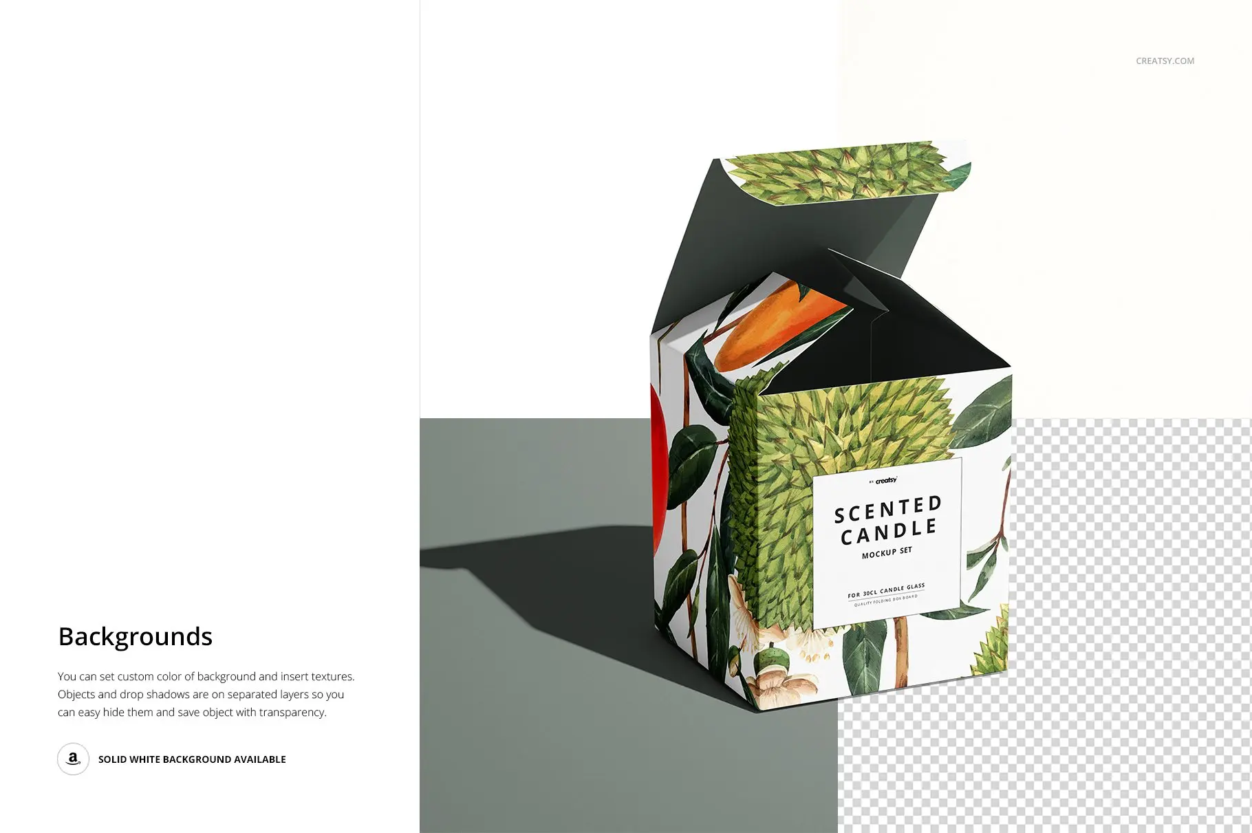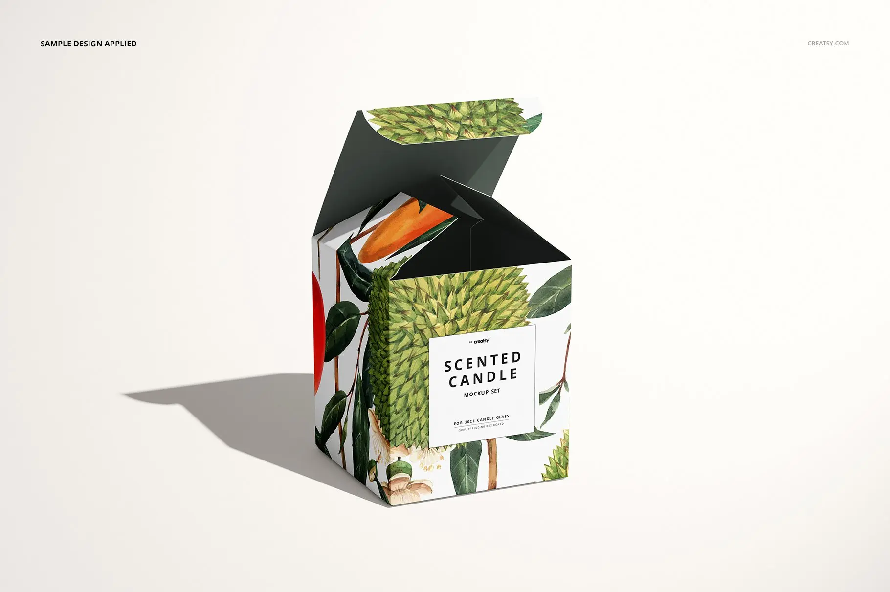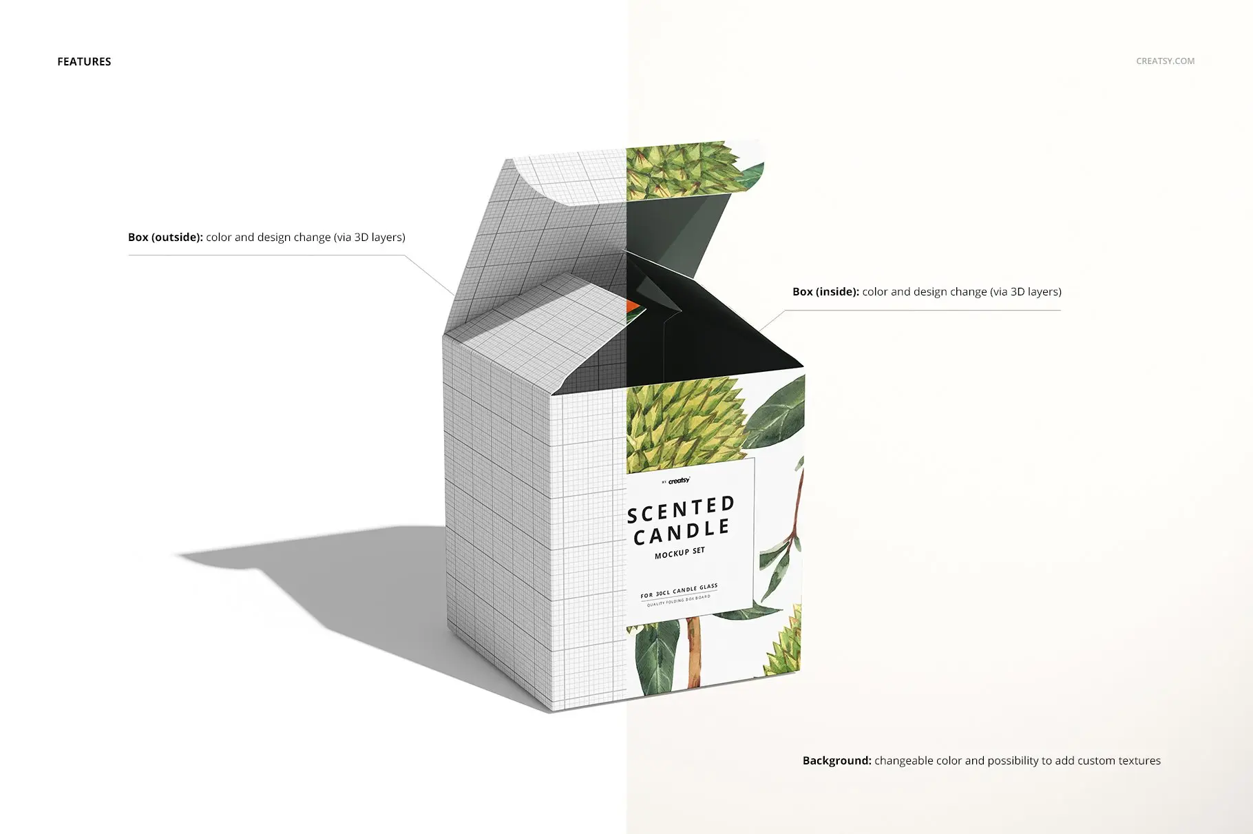 蜡烛盒模板 – 分层、可编辑的 .psd 文件,可通过编辑智能对象和颜色层来展示您的自定义设计。