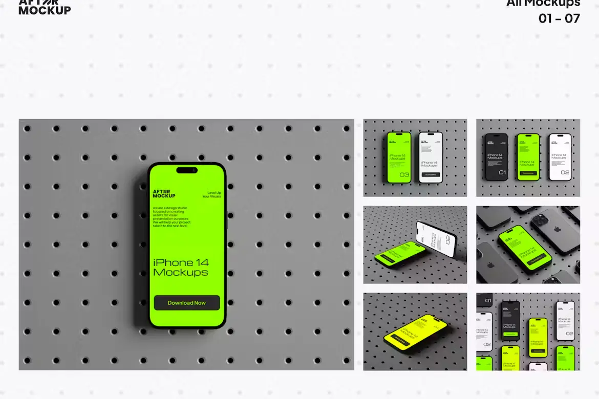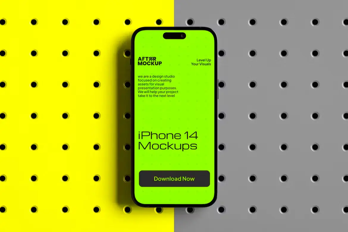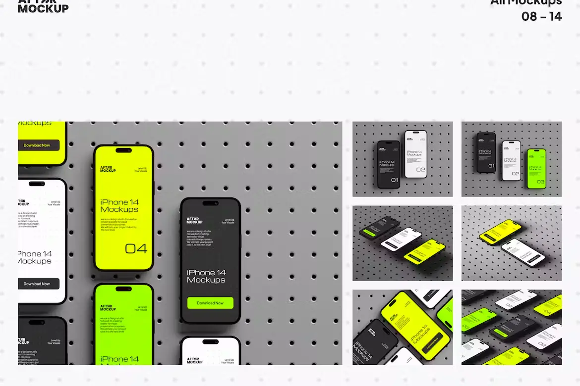 iPhone Pegboard Mockups 14款工业风带钉板背景苹果iPhone 15 Pro手机屏幕演示贴图PSD样机模板