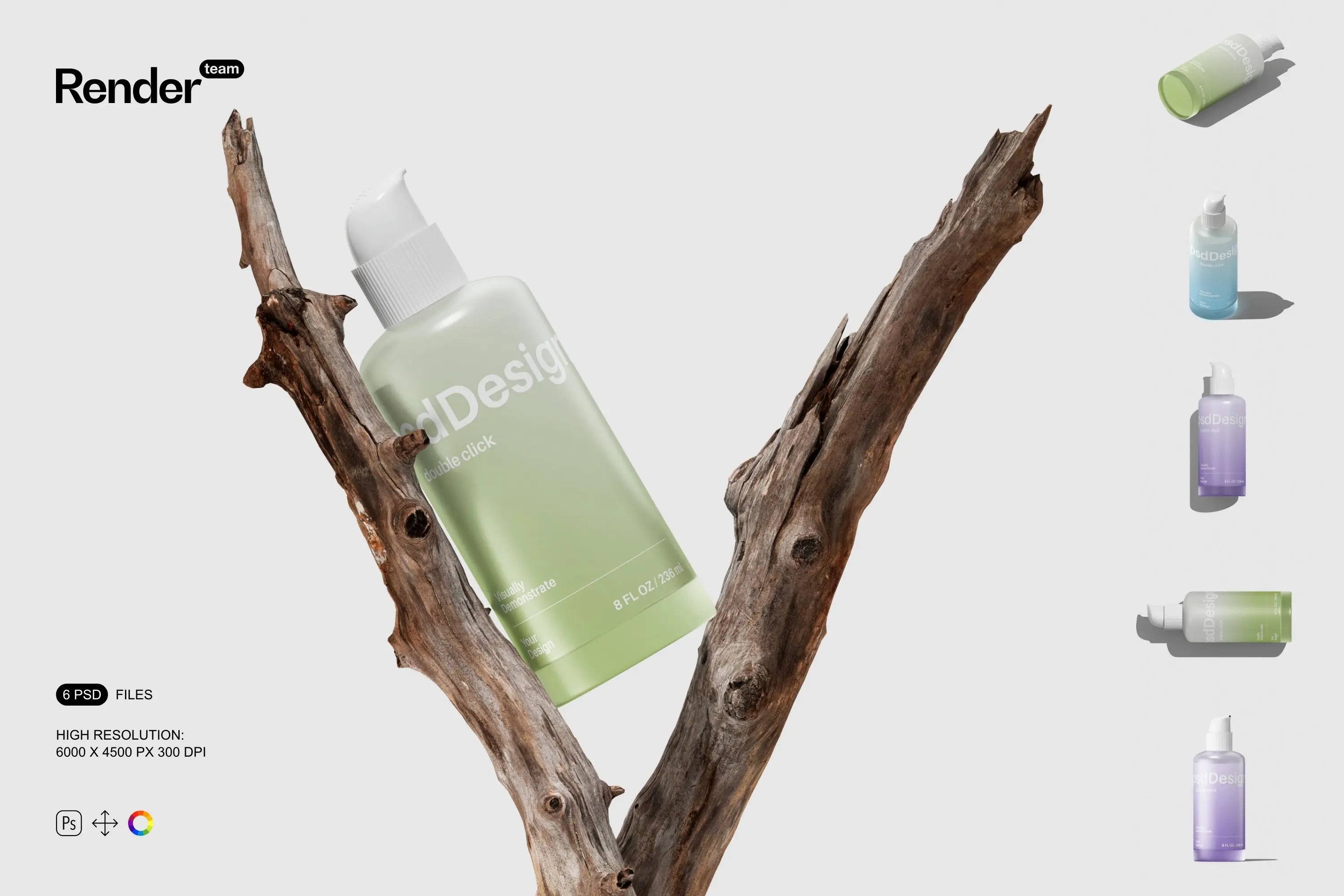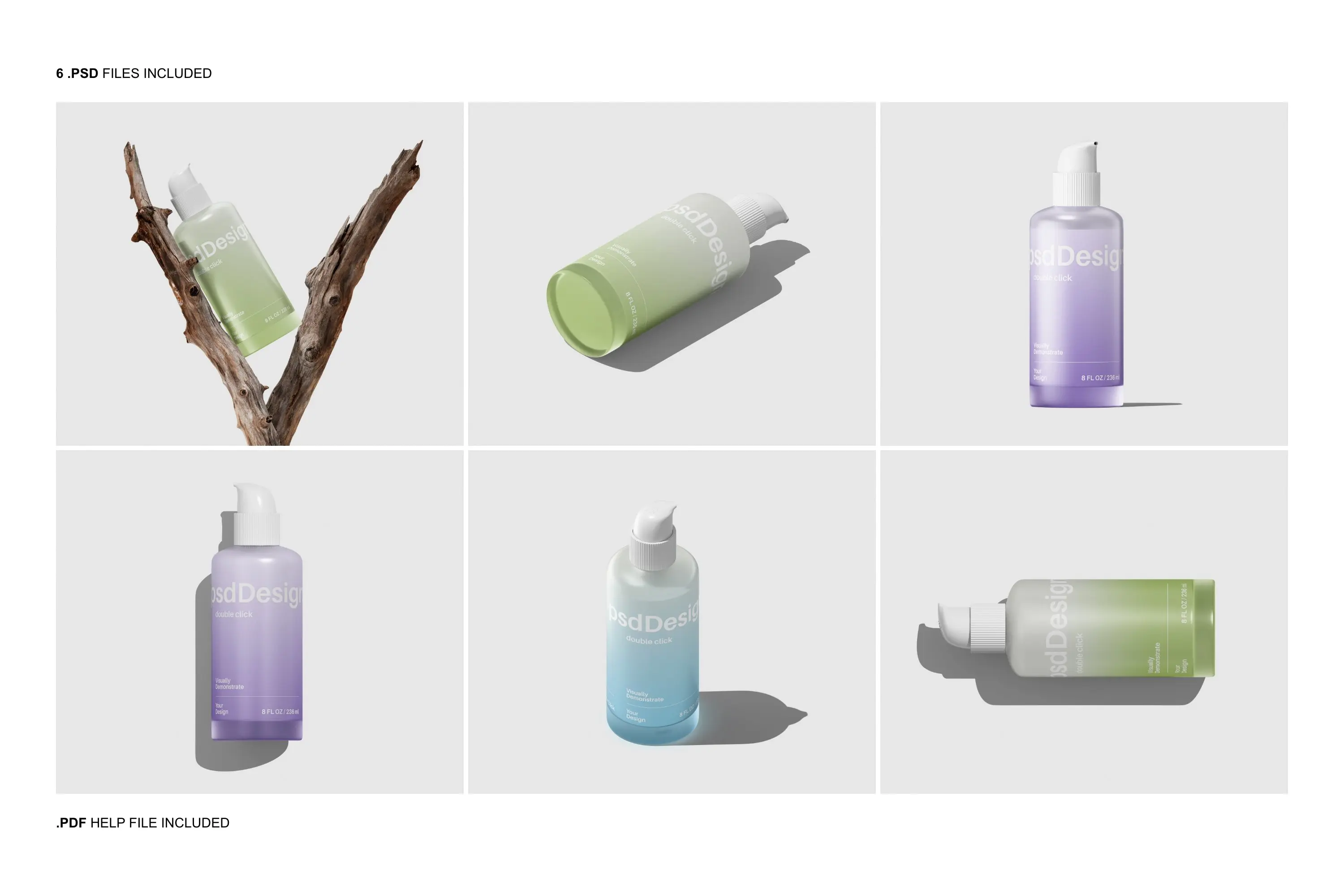 Cosmetic Bottle Mockup Set 6款时尚化妆护肤品乳状凝胶包装瓶塑料瓶设计展示贴图PSD样机模板