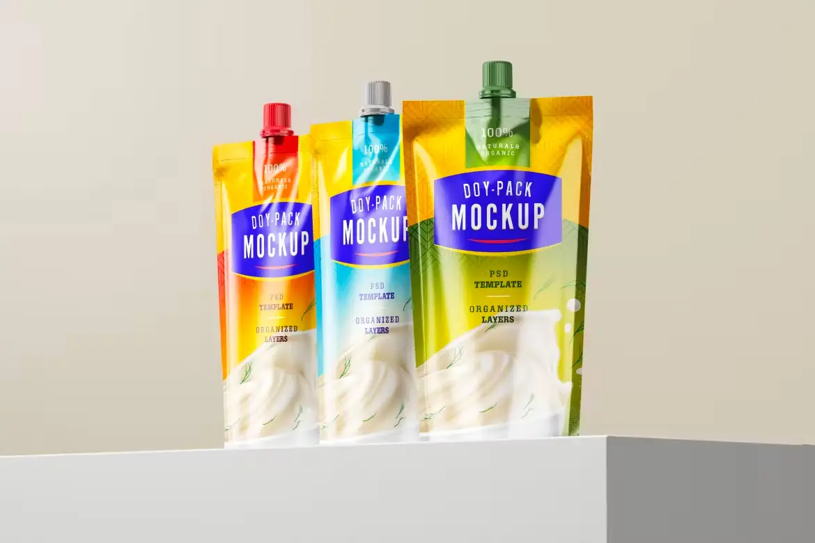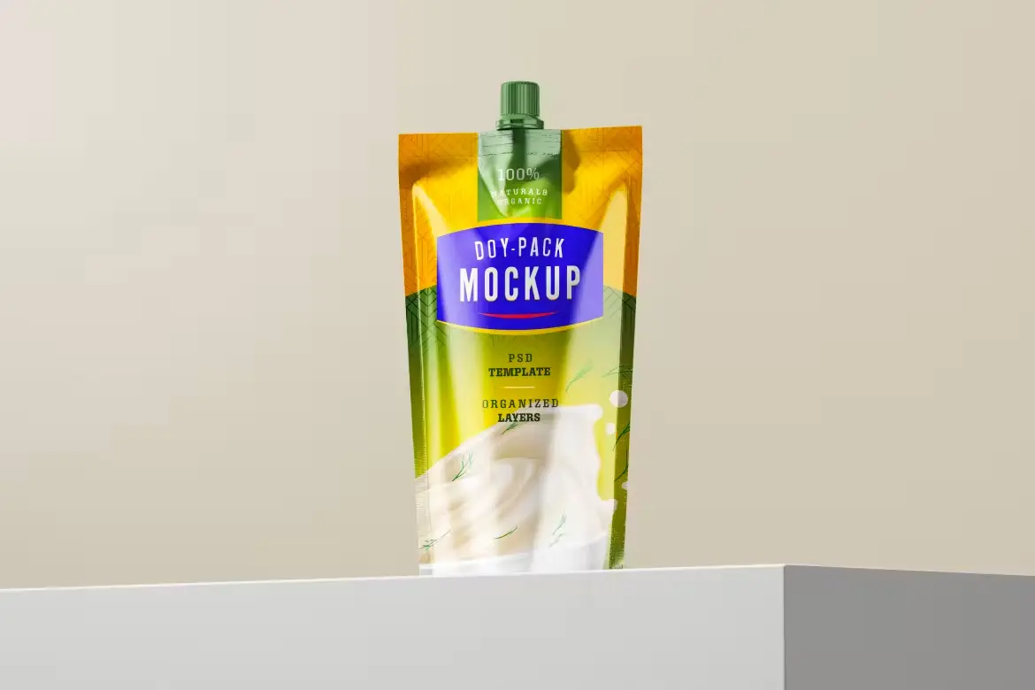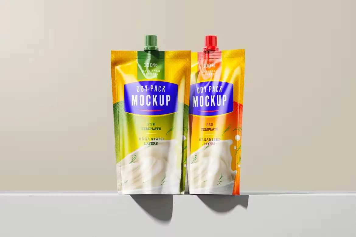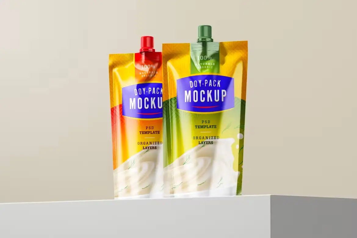Doypack Standing Pouch Packaging Mockup Set 带吸嘴的牛奶果冻自立袋模型品牌包装设计贴图ps样机素材