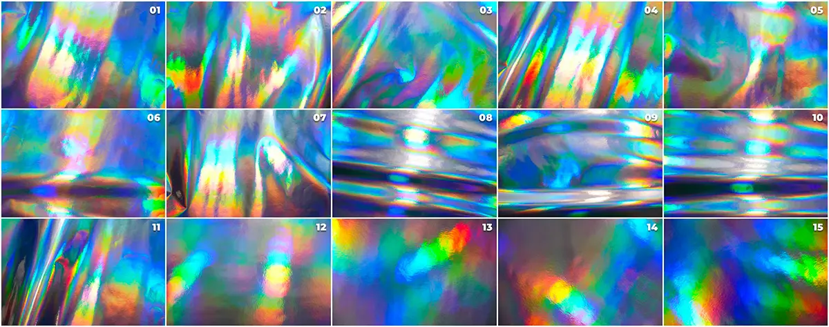 15 Holographic Foil Textures 抽象艺术全息彩虹光谱渐变箔纹理背景图片设计素材
