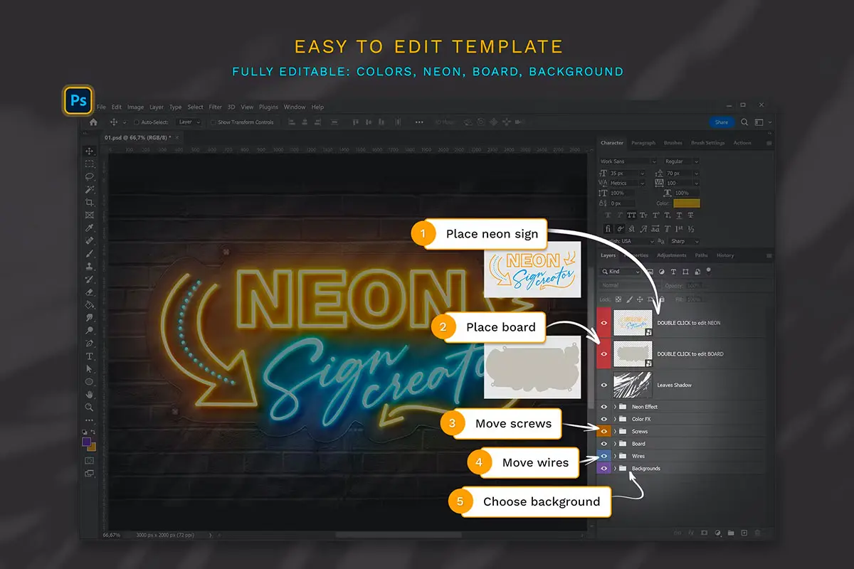 Neon Sign Board 石砖墙背景上的霓虹灯招牌字母文本展示ps特效样机素材