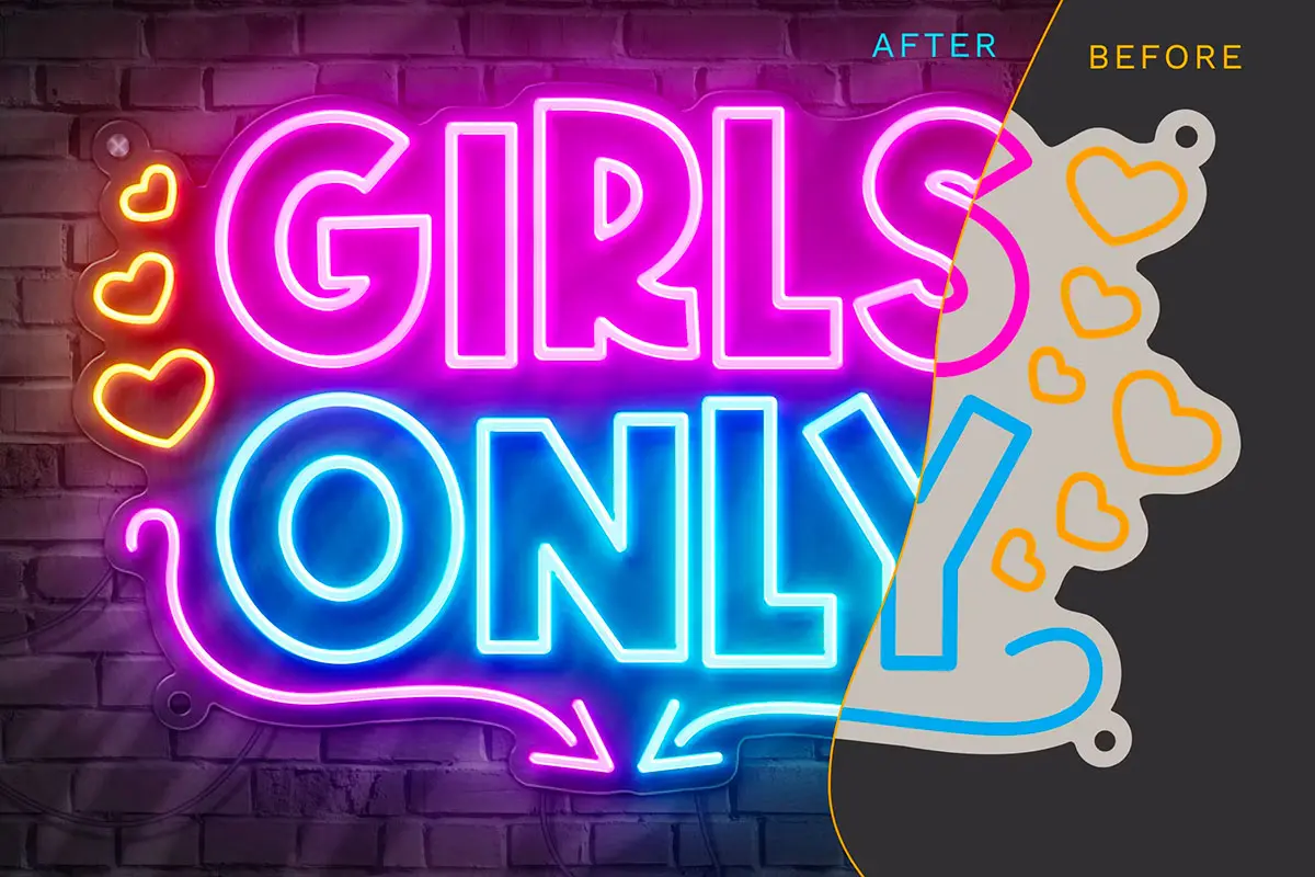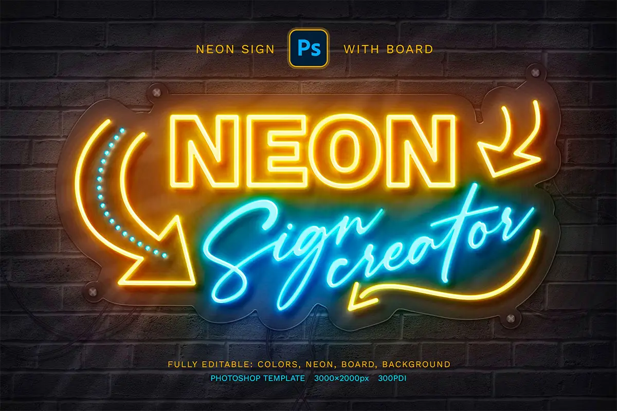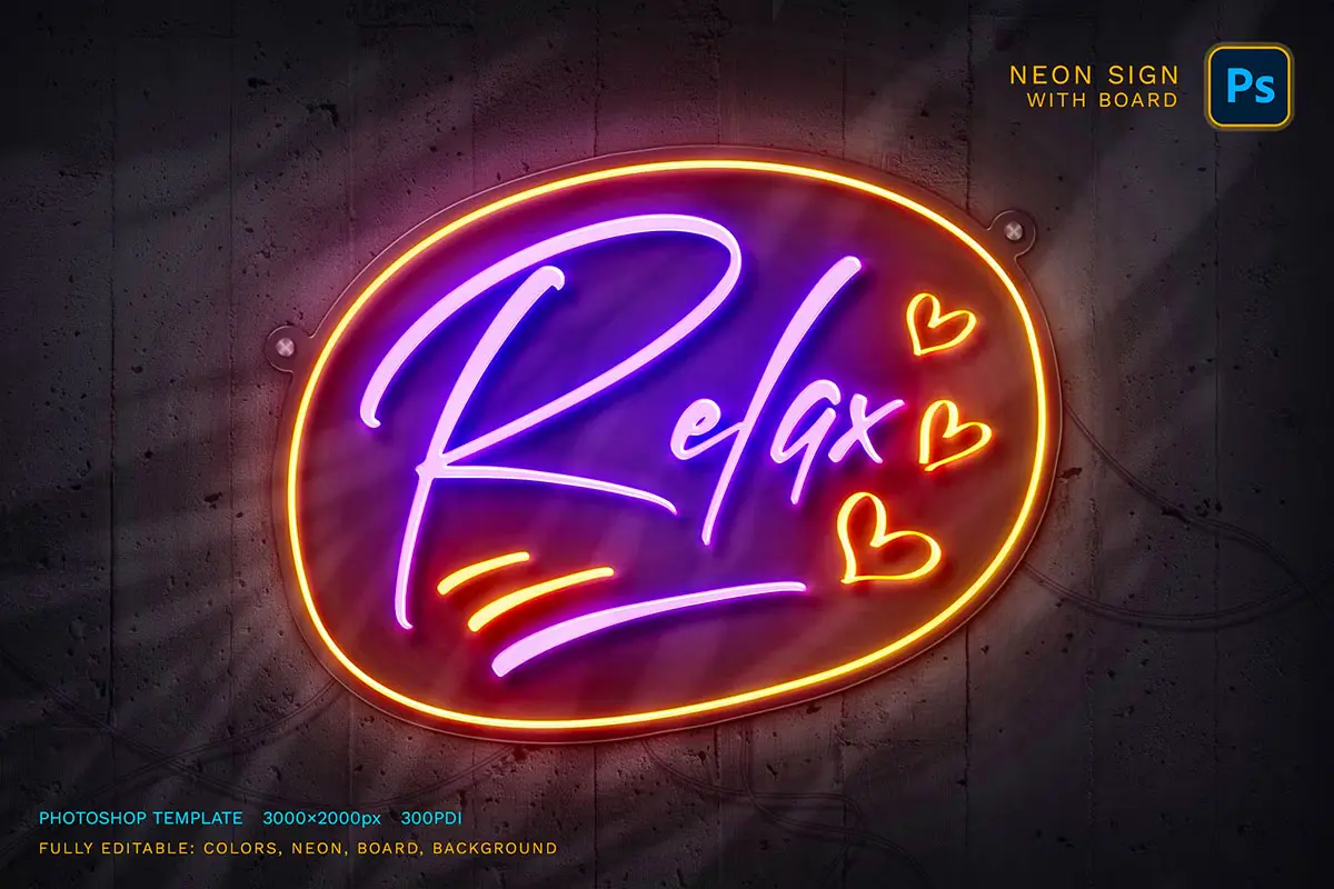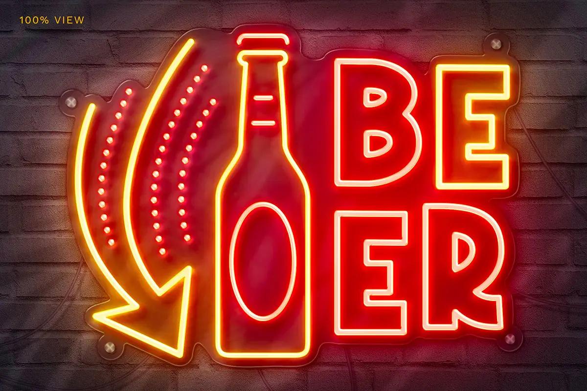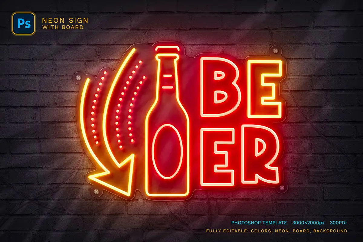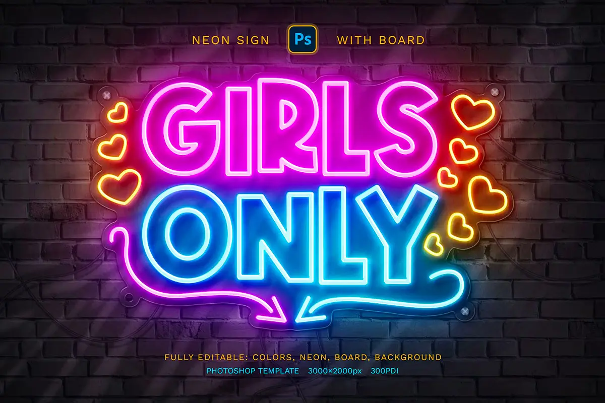 Neon Sign Board 石砖墙背景上的霓虹灯招牌字母文本展示ps特效样机素材
