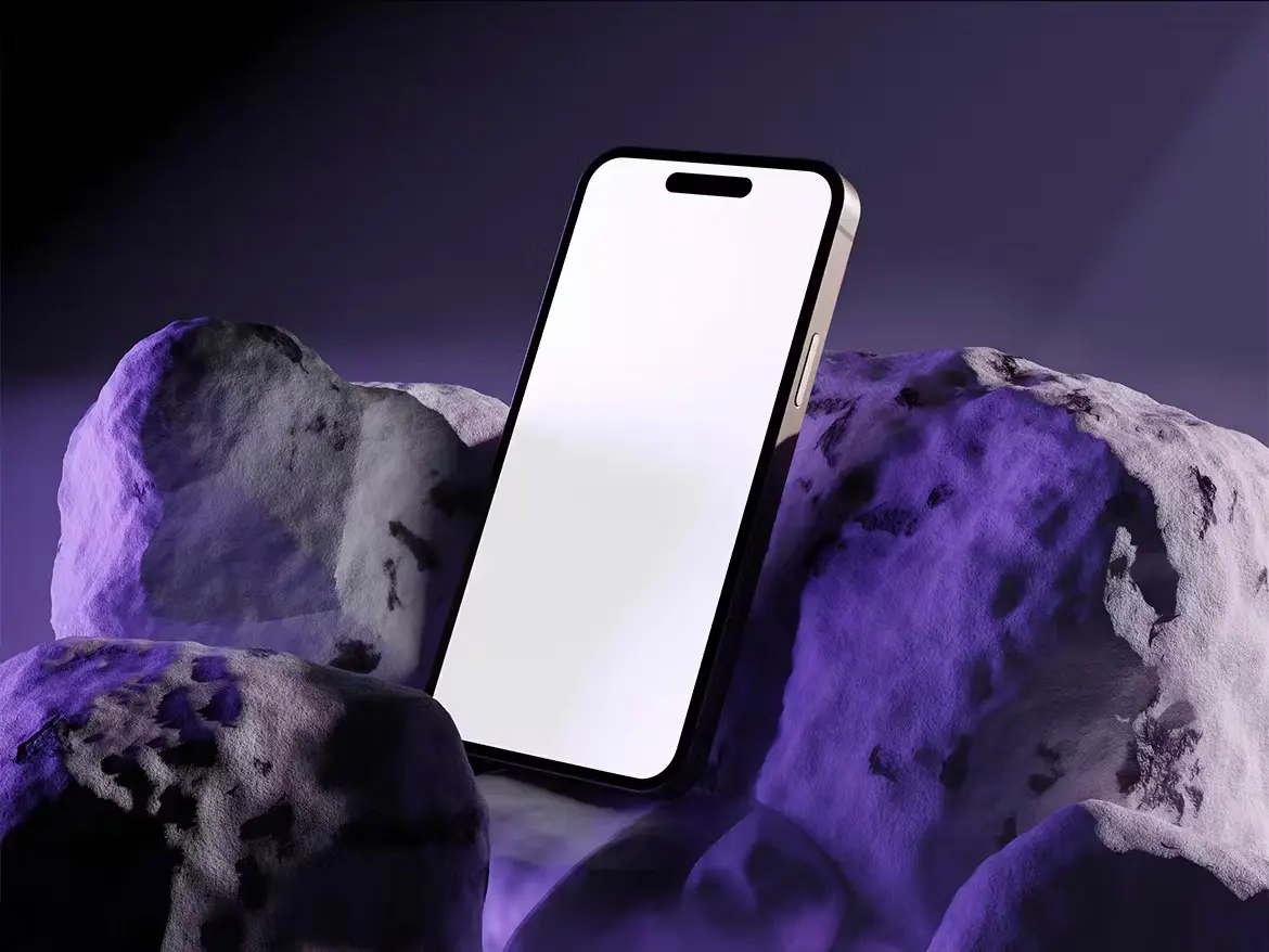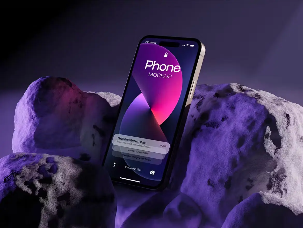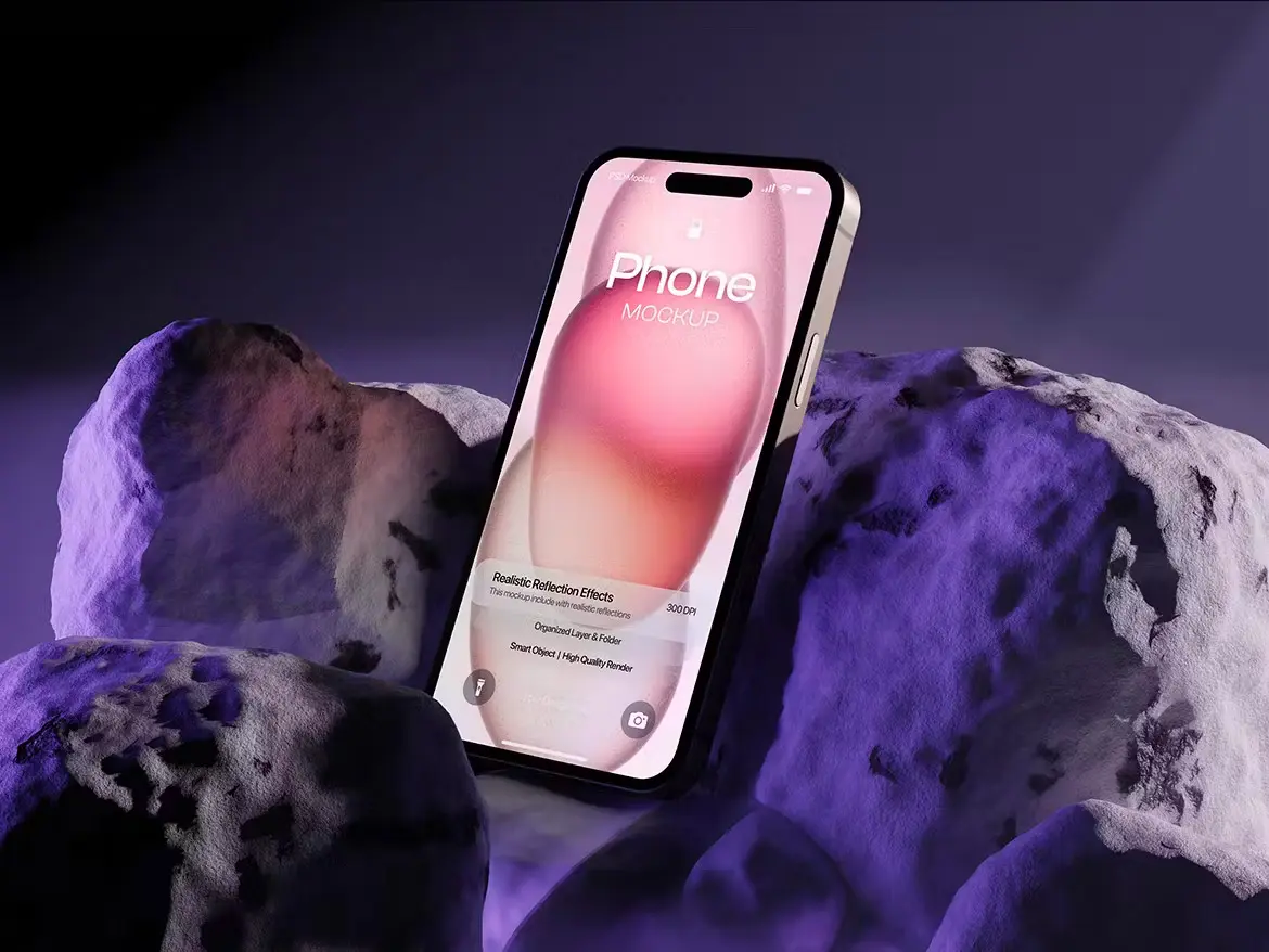 Iphone Mockup 工业风岩石iPhone 15 手机UI壁纸桌面设计展示PSD样机