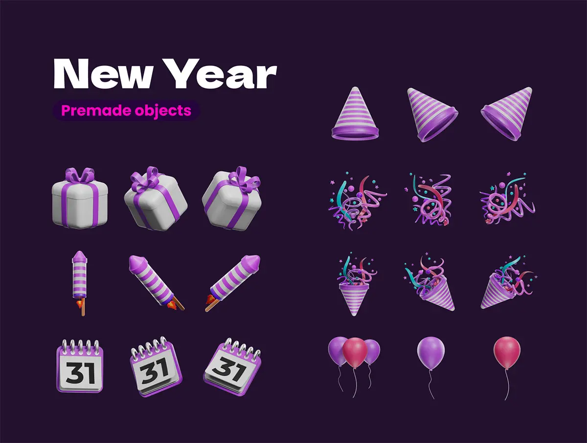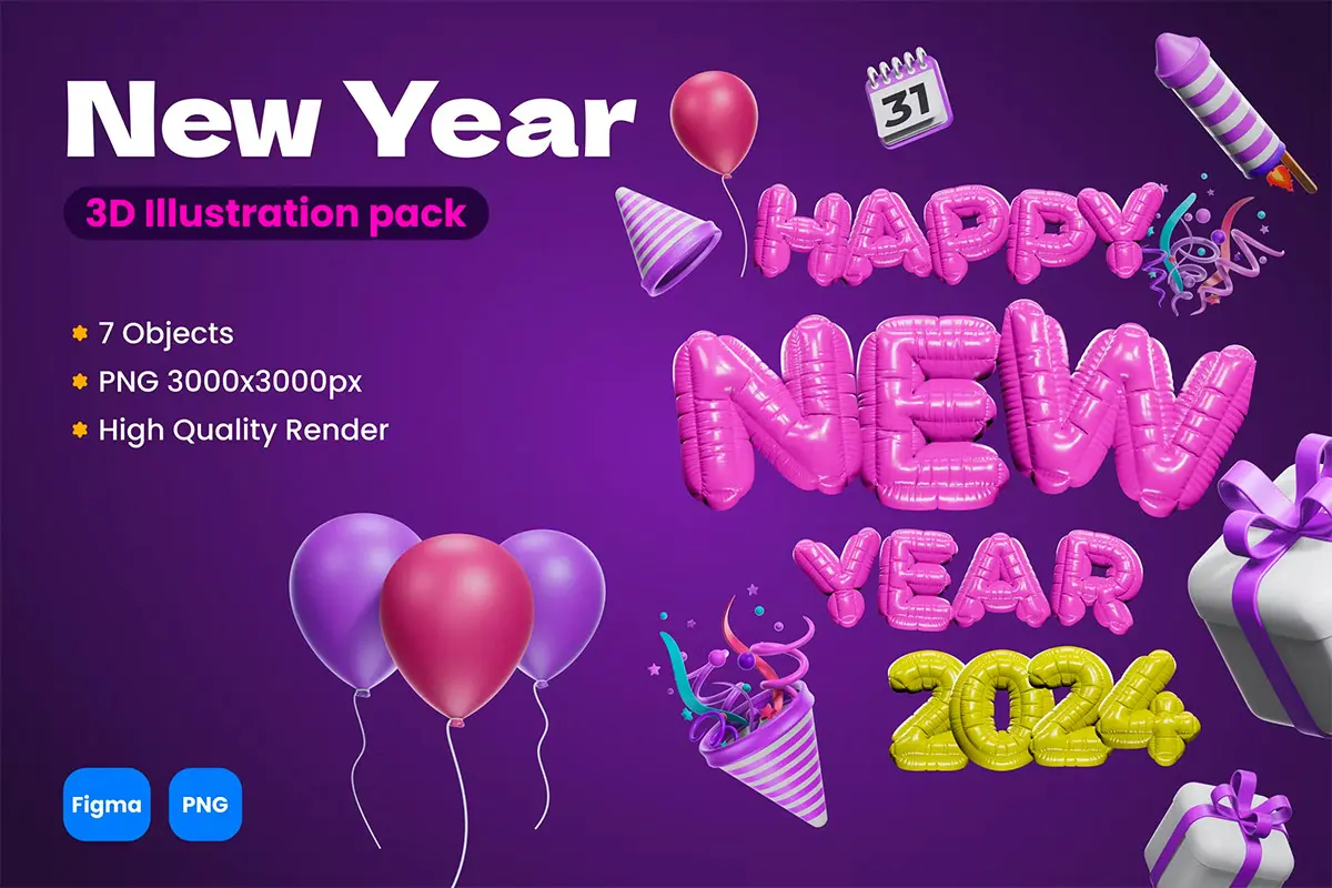 Happy New Year 3D icons Pack 7款2024年新年庆典节日派对主题元素3D图标icon素材webp免抠图片