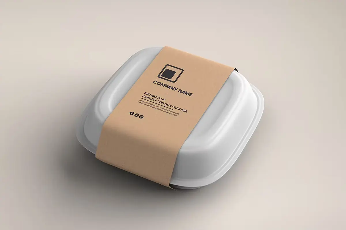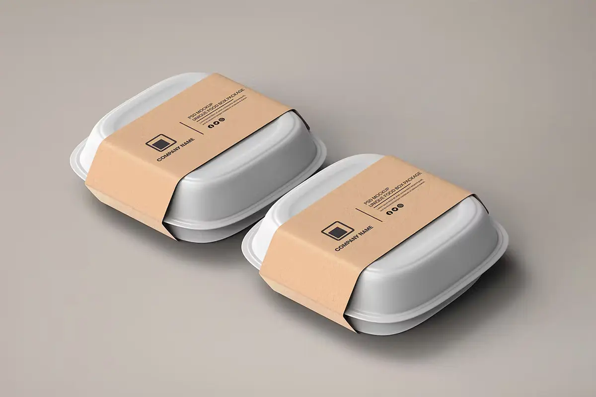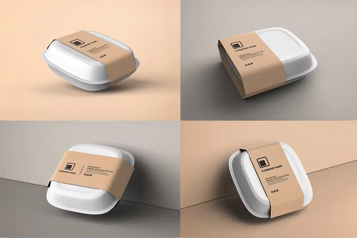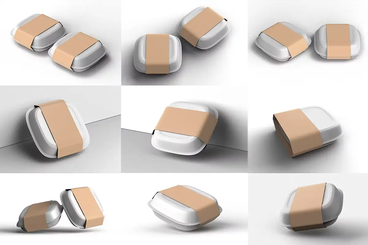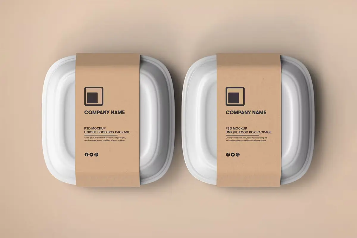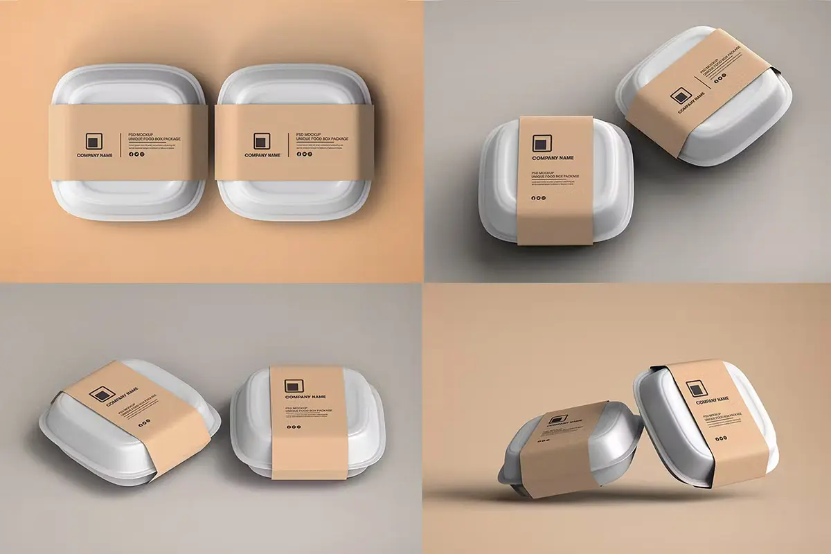 Food Tray Container with Kraft Paper Label Mockup 18款正方形一次性饭盒外卖打包餐盒包装设计ps样机素材展示效果图
