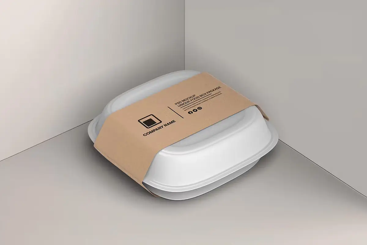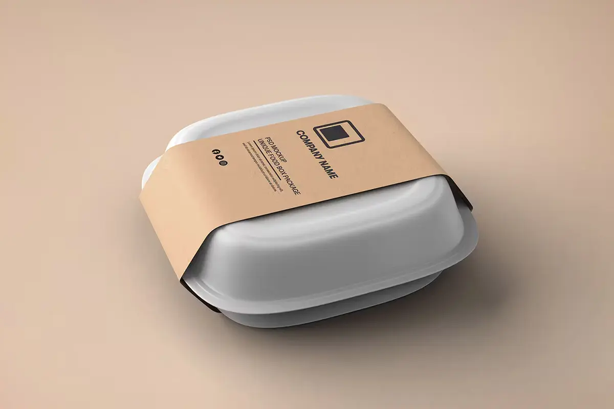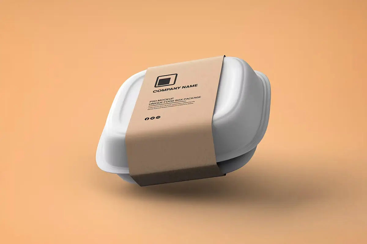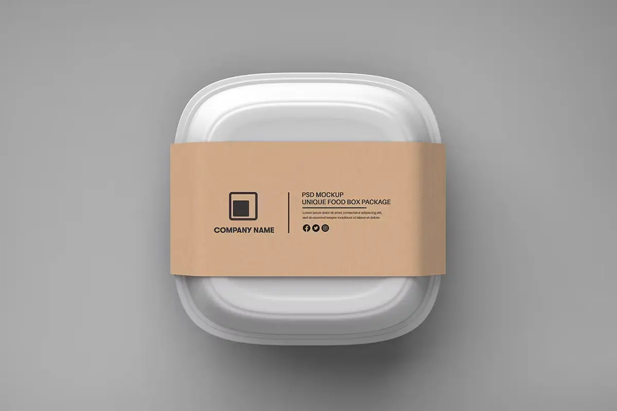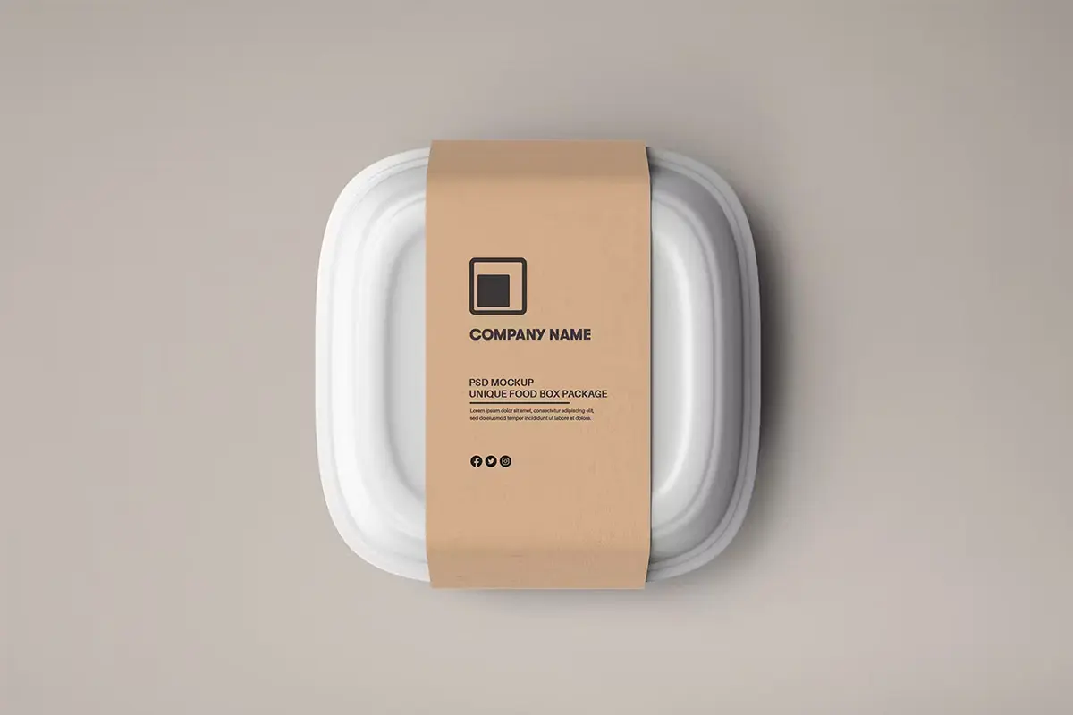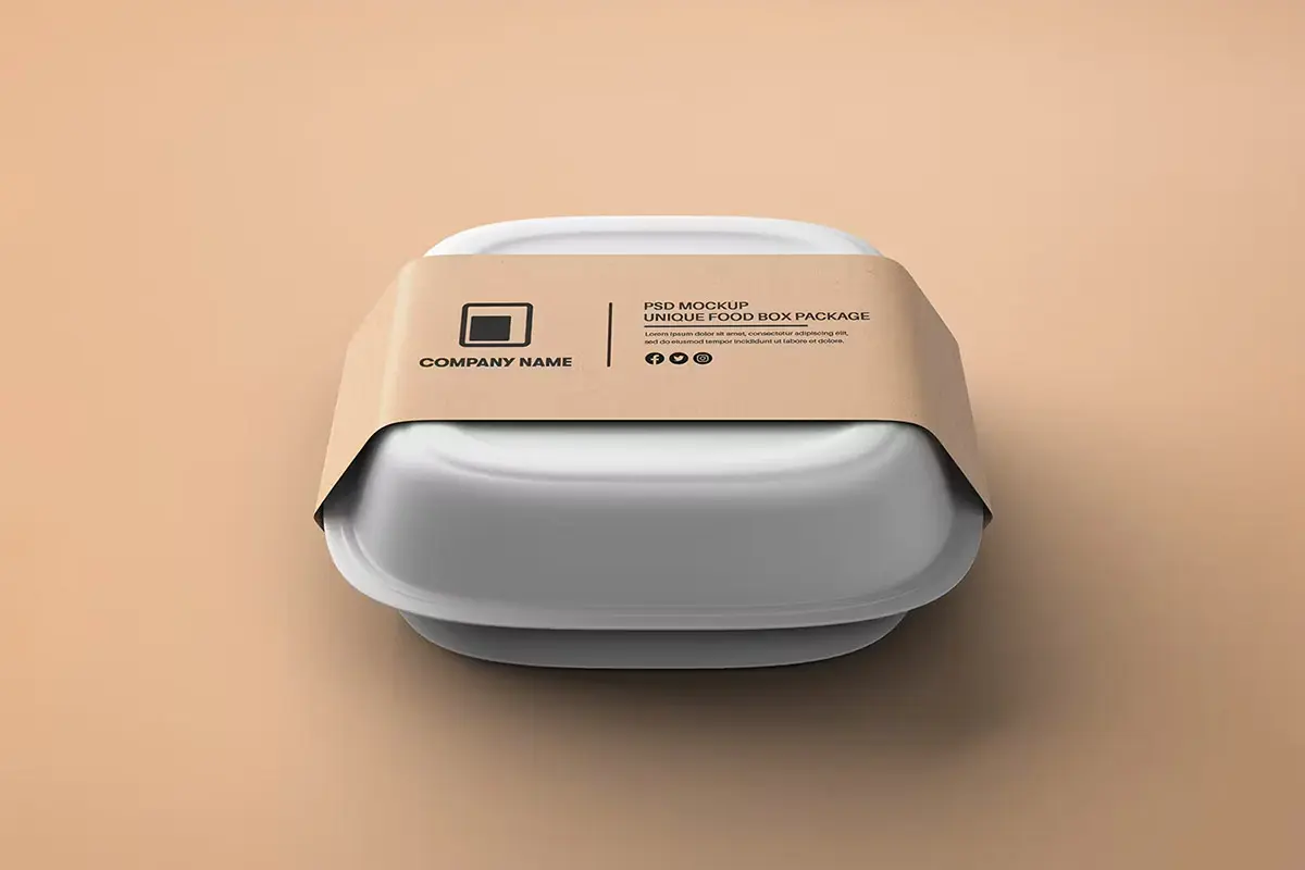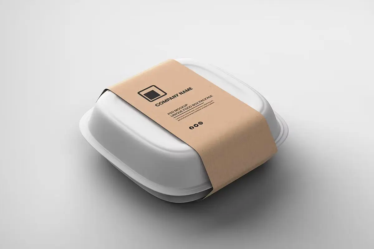 Food Tray Container with Kraft Paper Label Mockup 18款正方形一次性饭盒外卖打包餐盒包装设计ps样机素材展示效果图