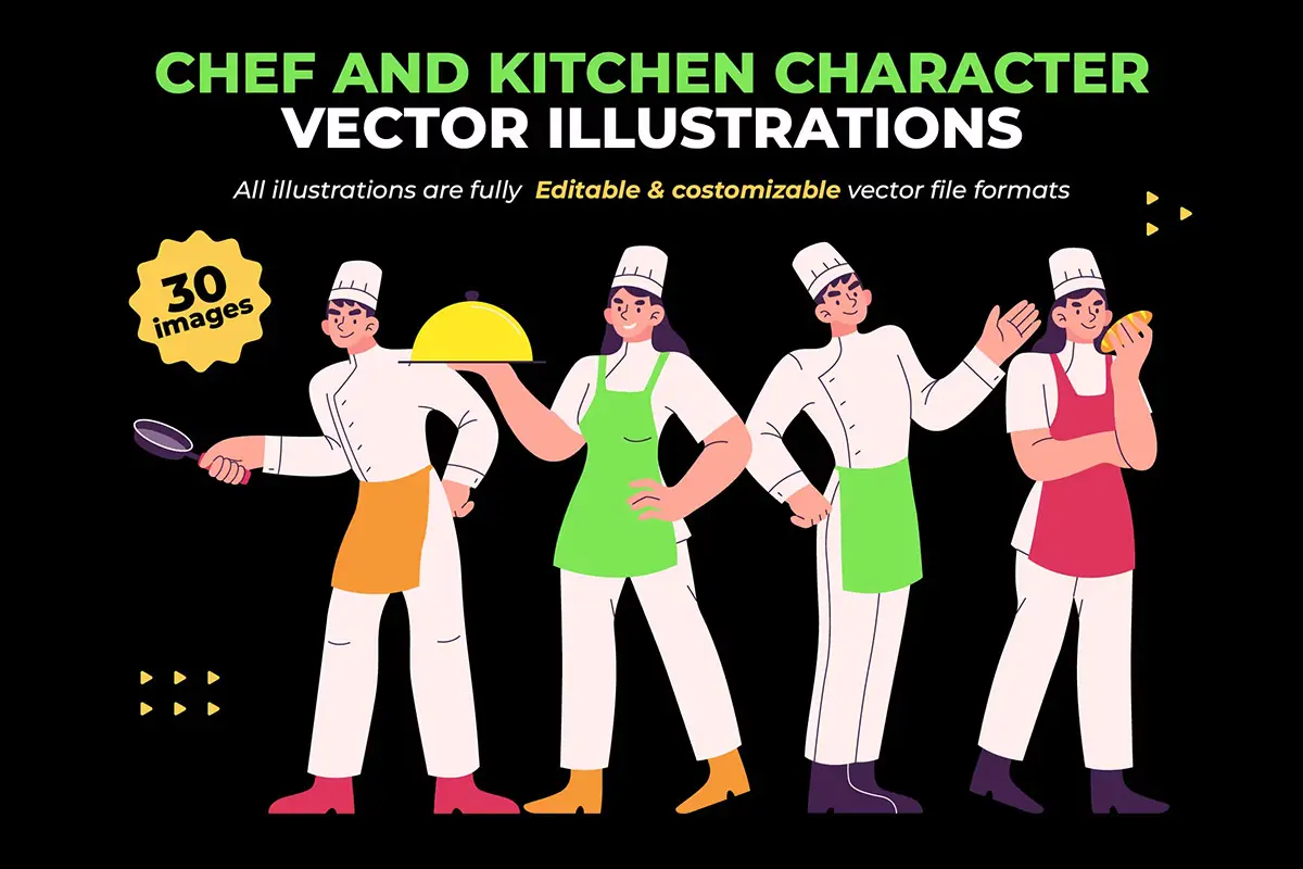 Flat Design Chef & Kitchen Character Illustrations 卡通厨师烹饪菜谱厨具剪切画用户界面站位插图插画图片矢量设计素材