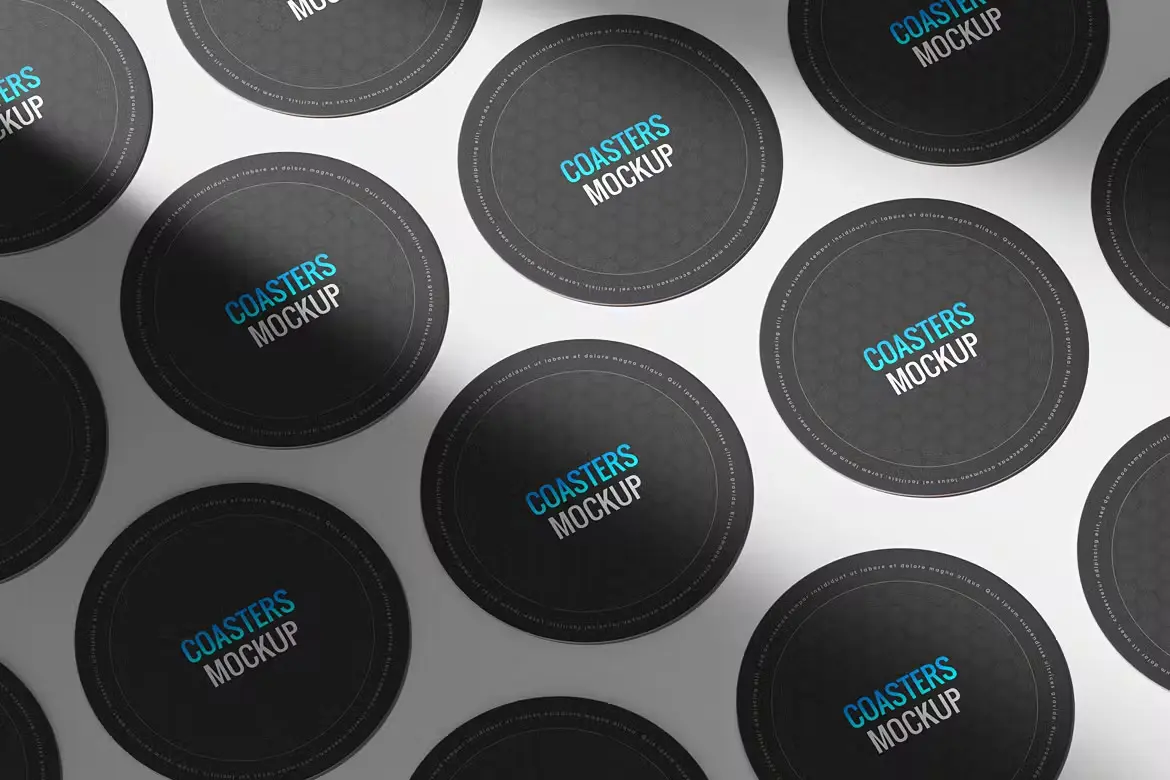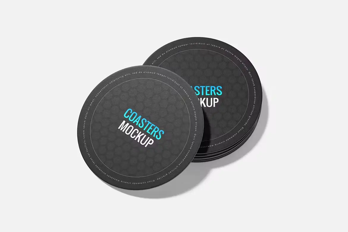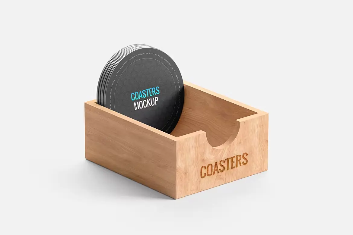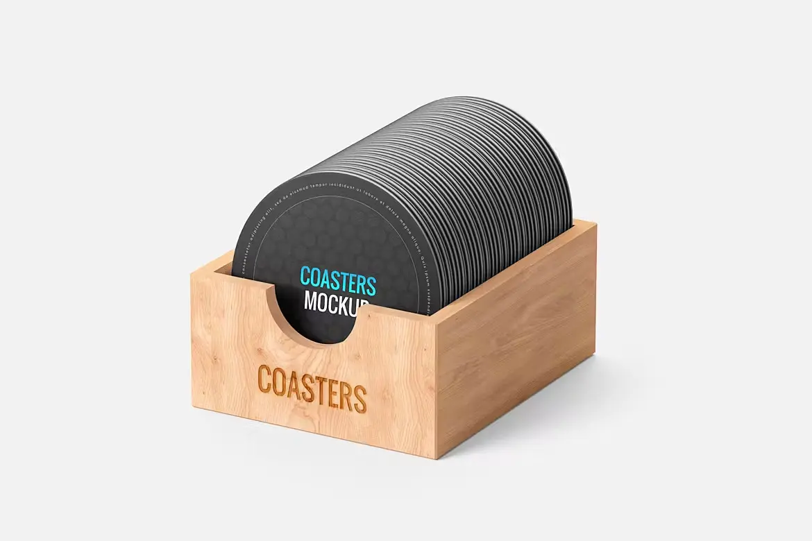 Paper Beverage Coaster Mockup 纸质圆形杯垫木盒模型品牌logo标识设计贴图ps样机素材