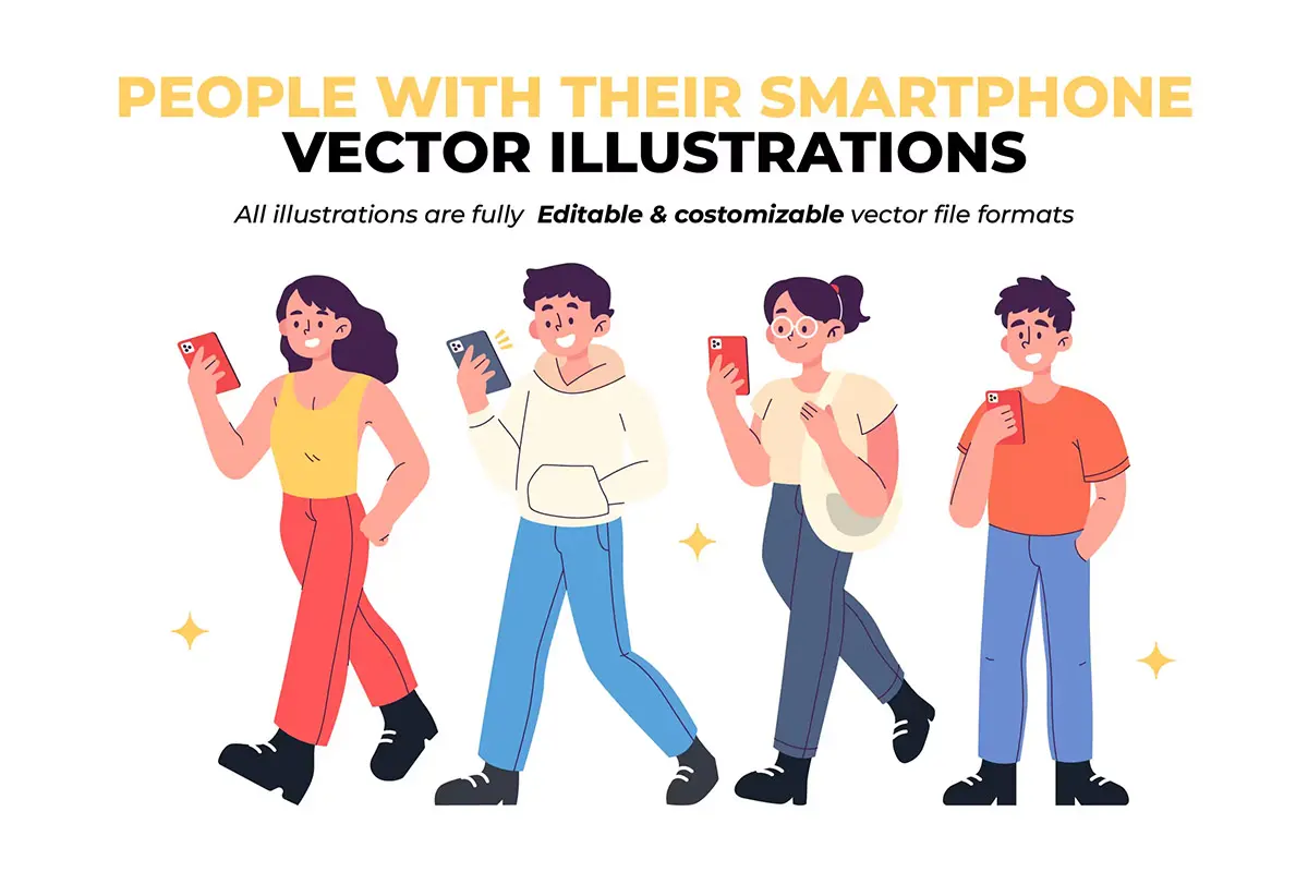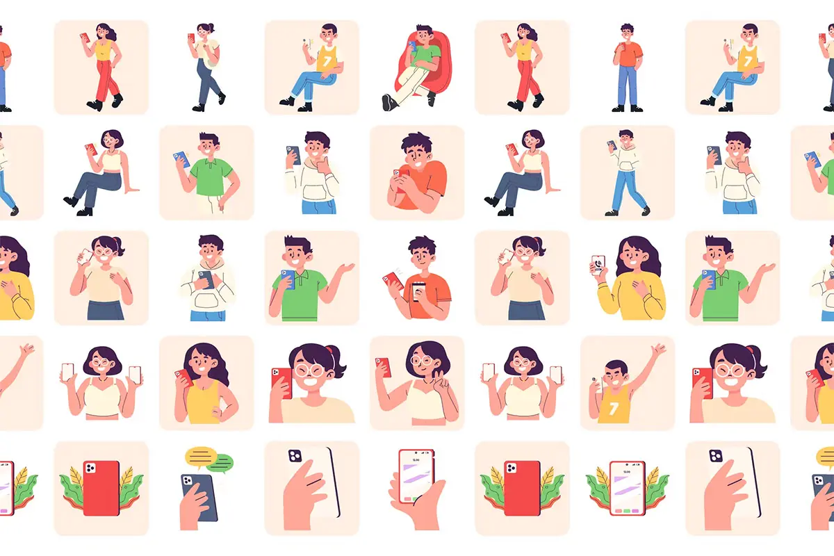 Great Bundle of People with their Smartphone 卡通人物手持手机自拍视频通话刷视频打游戏在线社交插图插画矢量设计素材