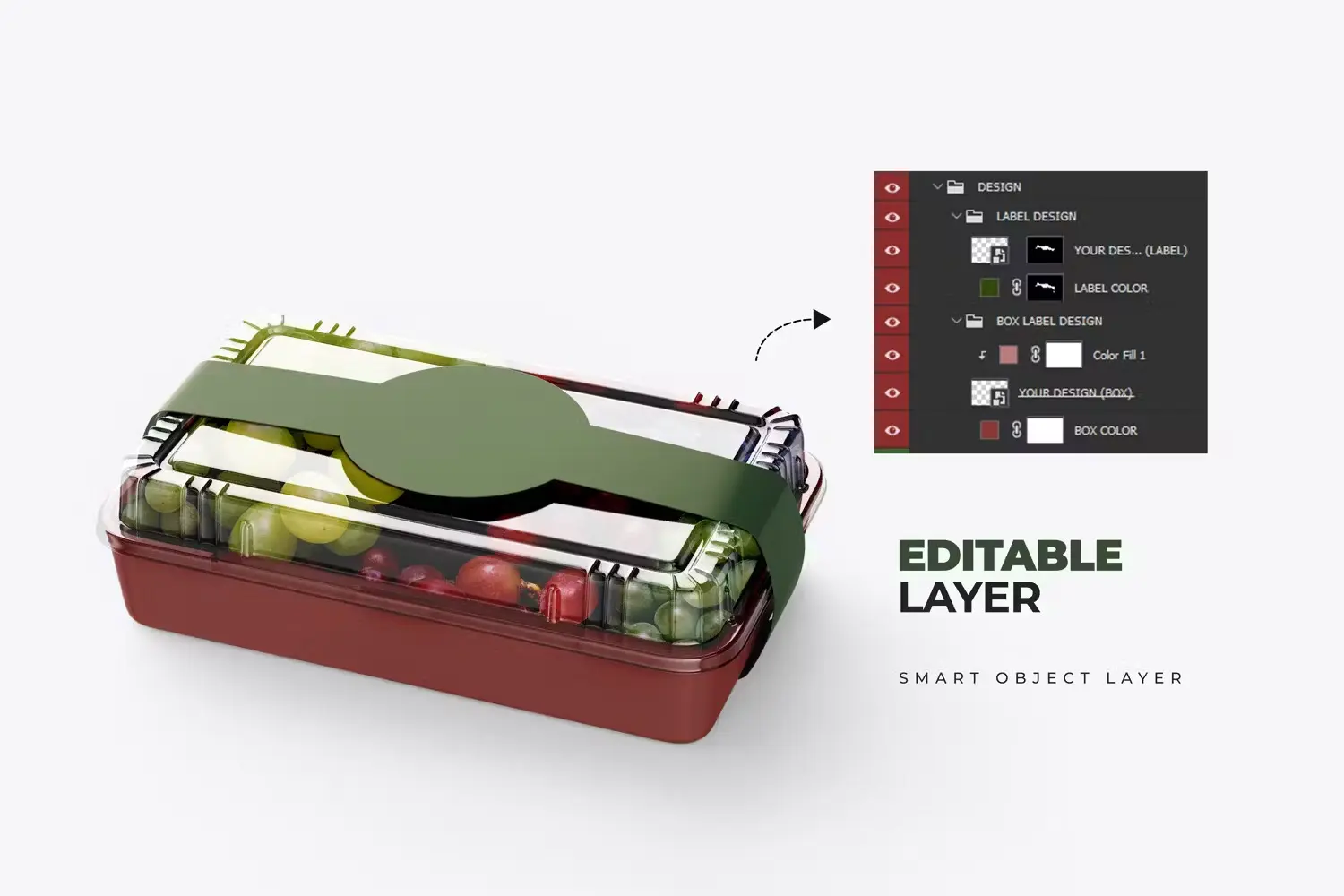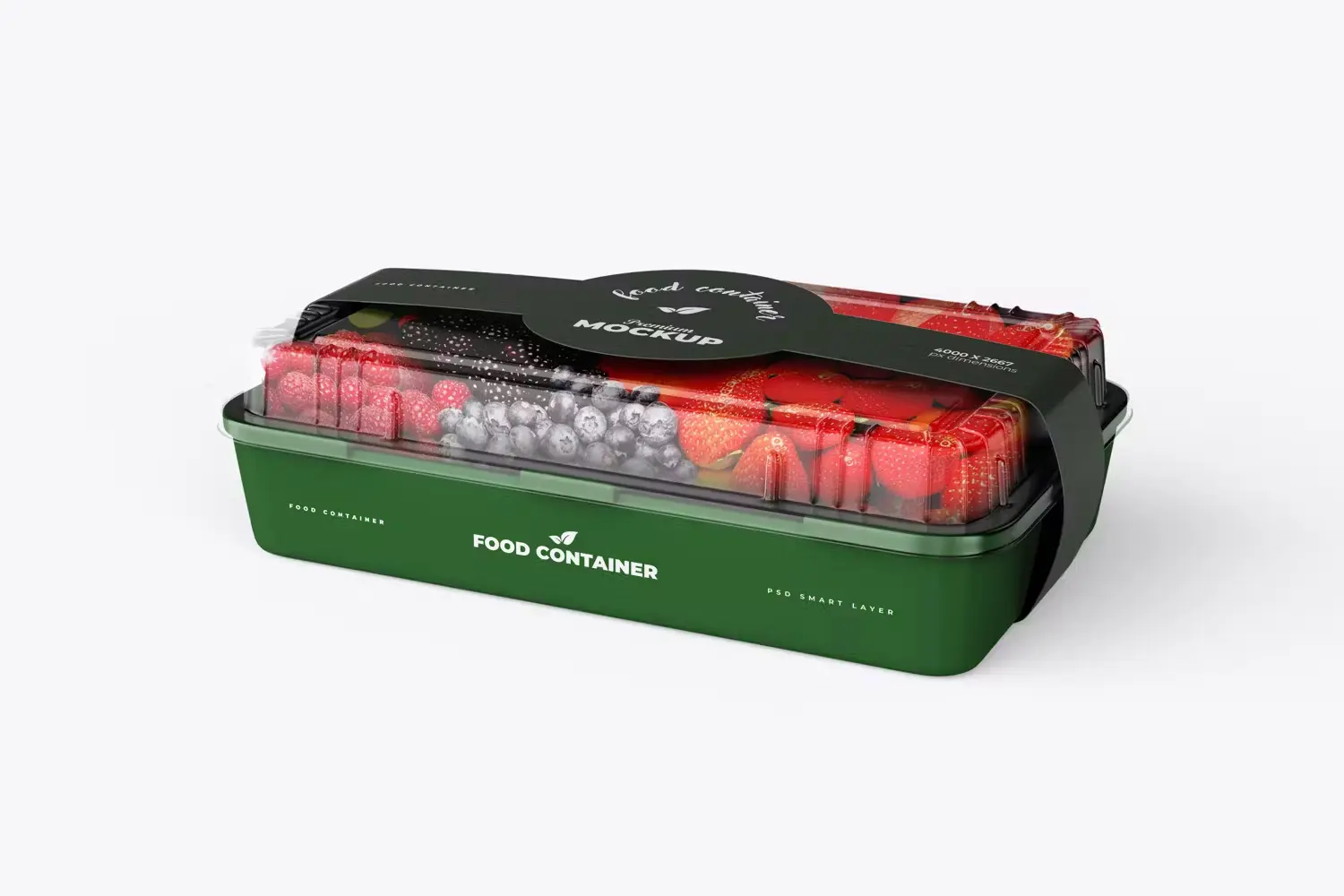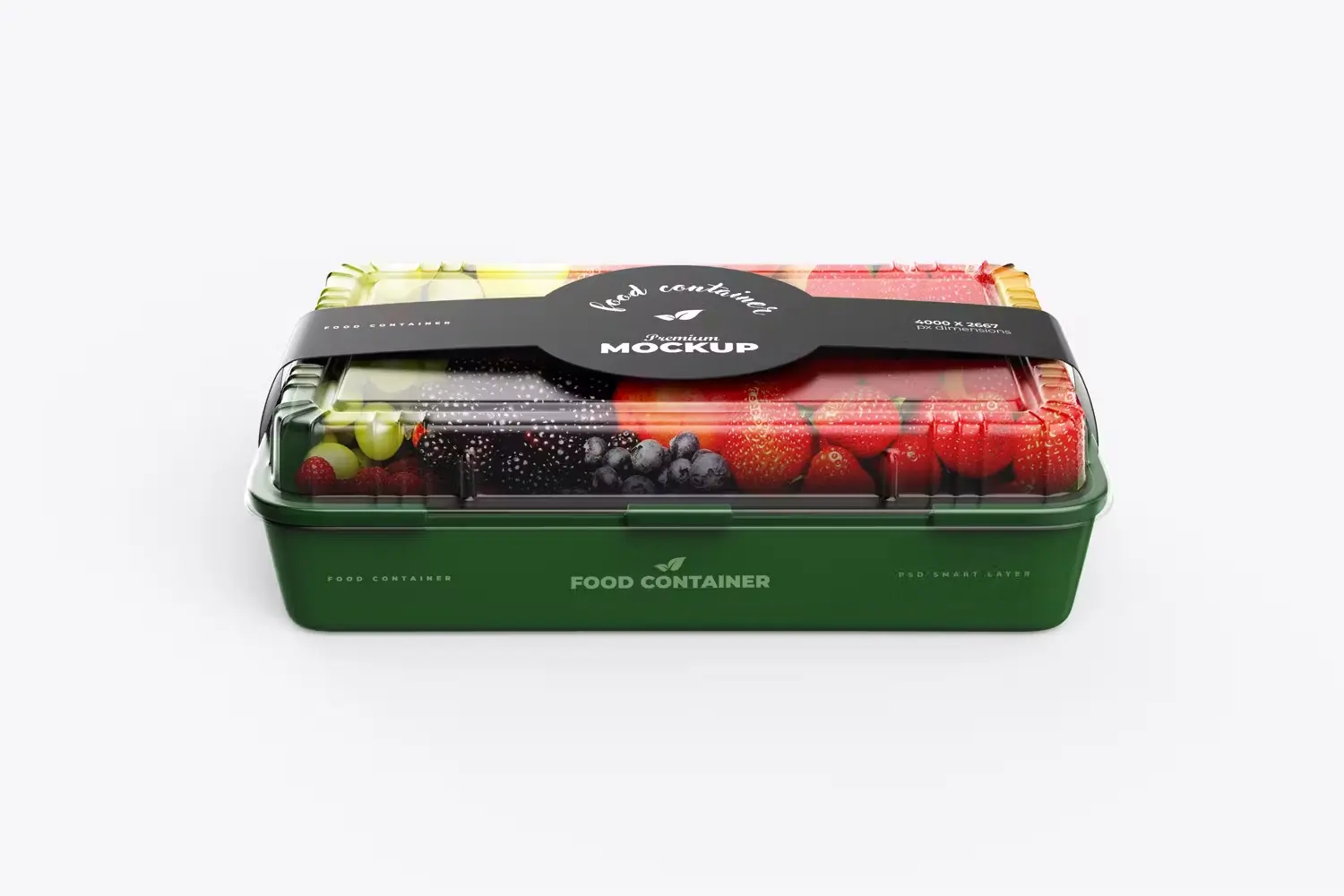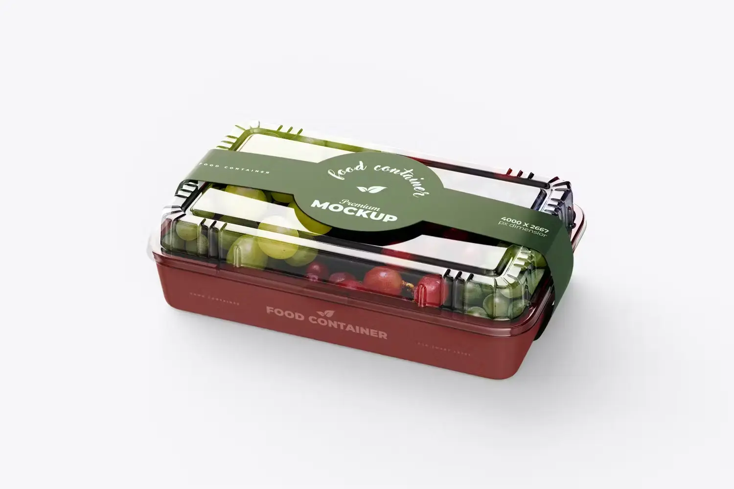 Transparent Food Container Box Mockup 蔬果零售透明塑料包装盒腰封logo标识设计贴图ps样机素材