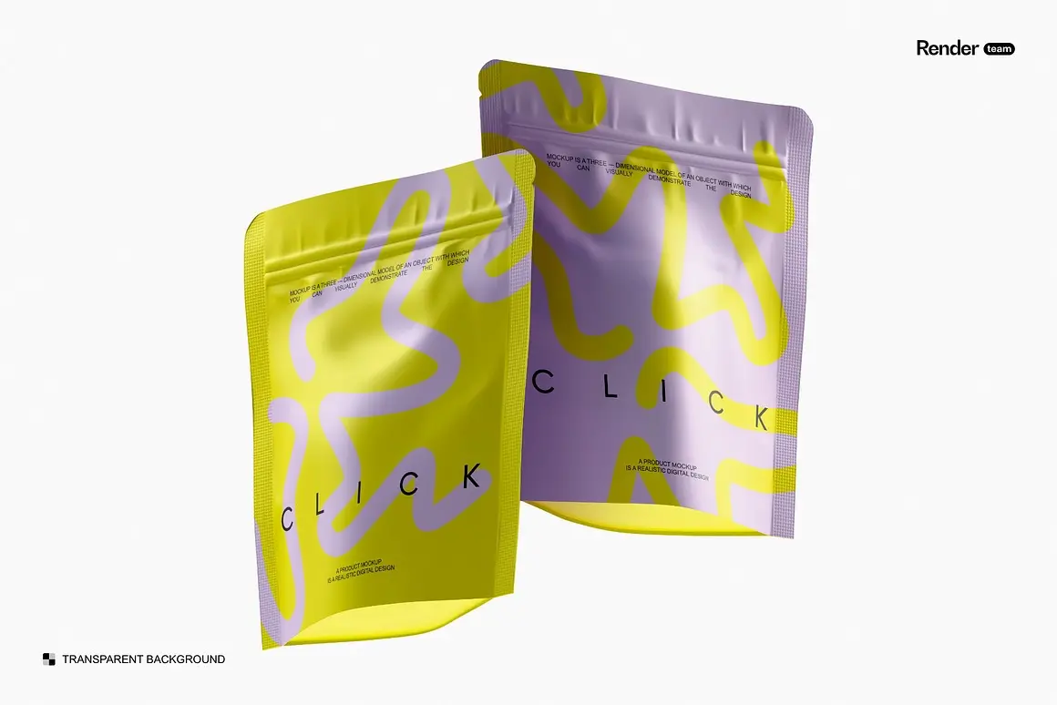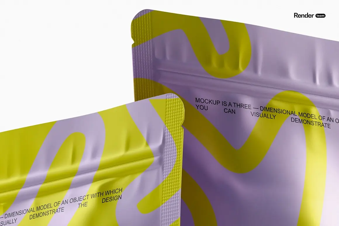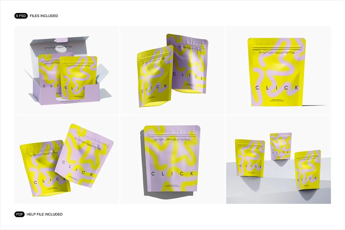 Matte Stand-Up Pouch Mockup Set 6款哑光铝箔零食自立袋自封袋产品包装设计ps样机素材展示效果图