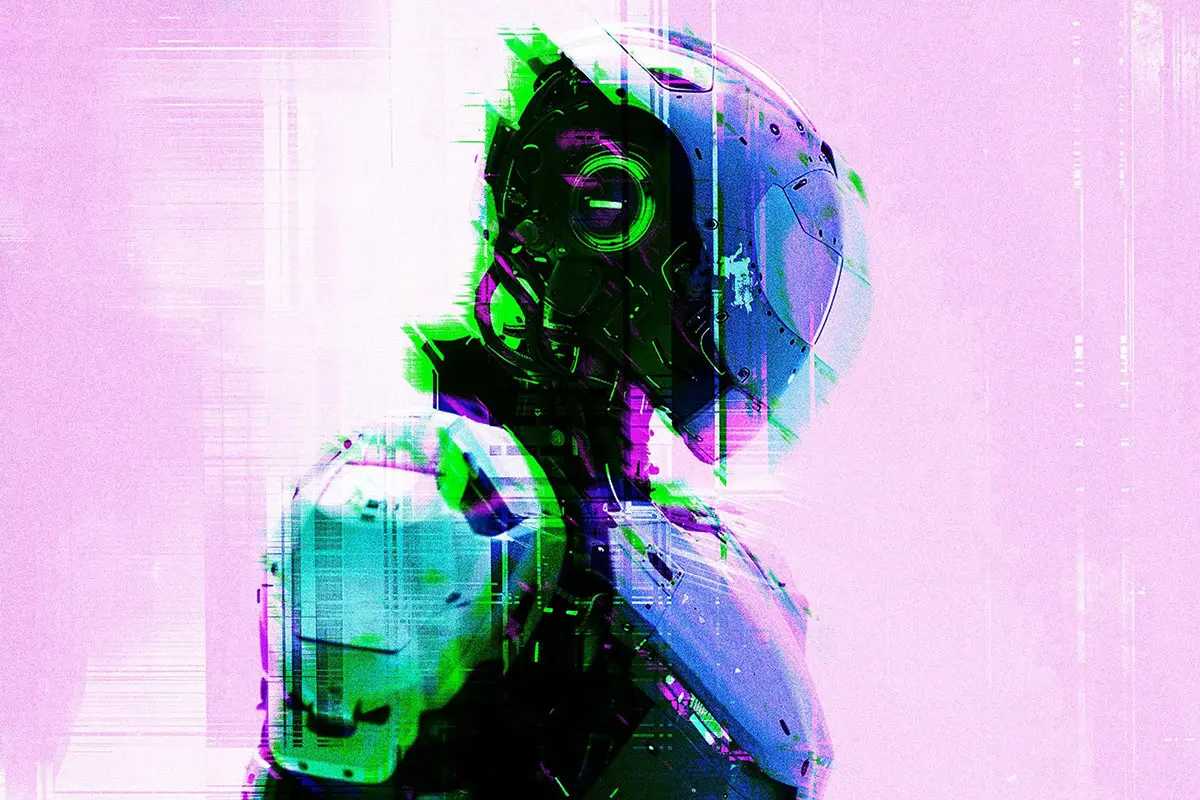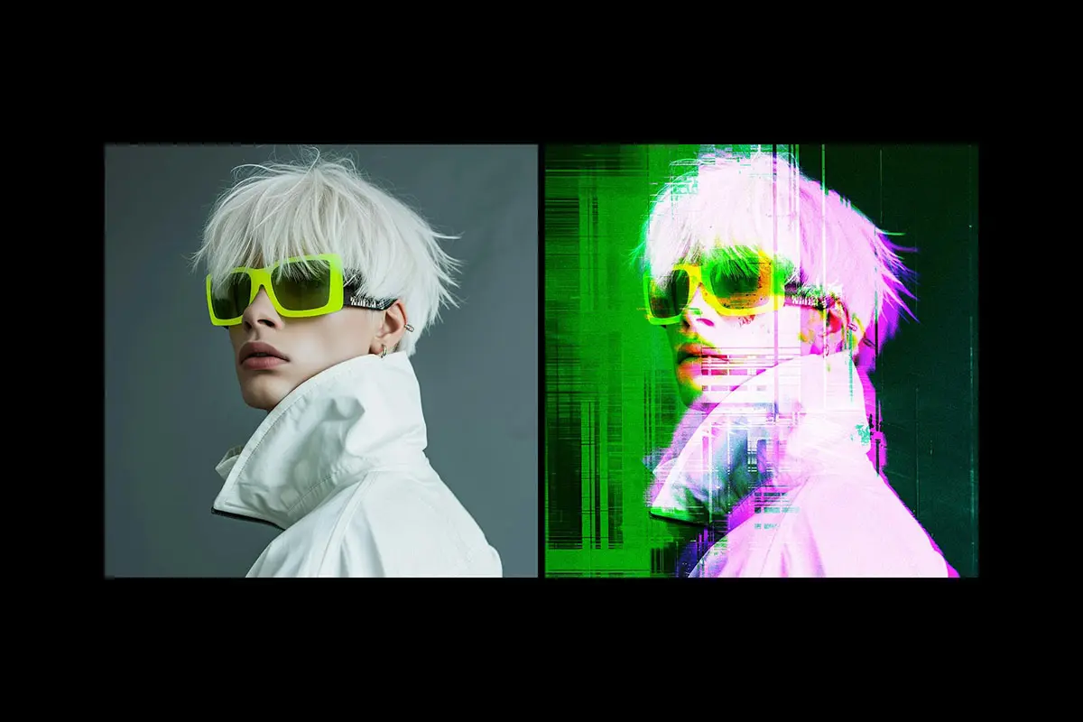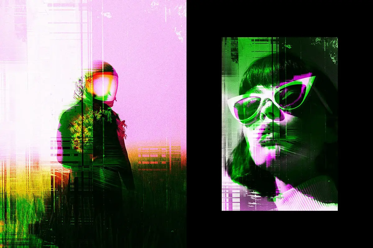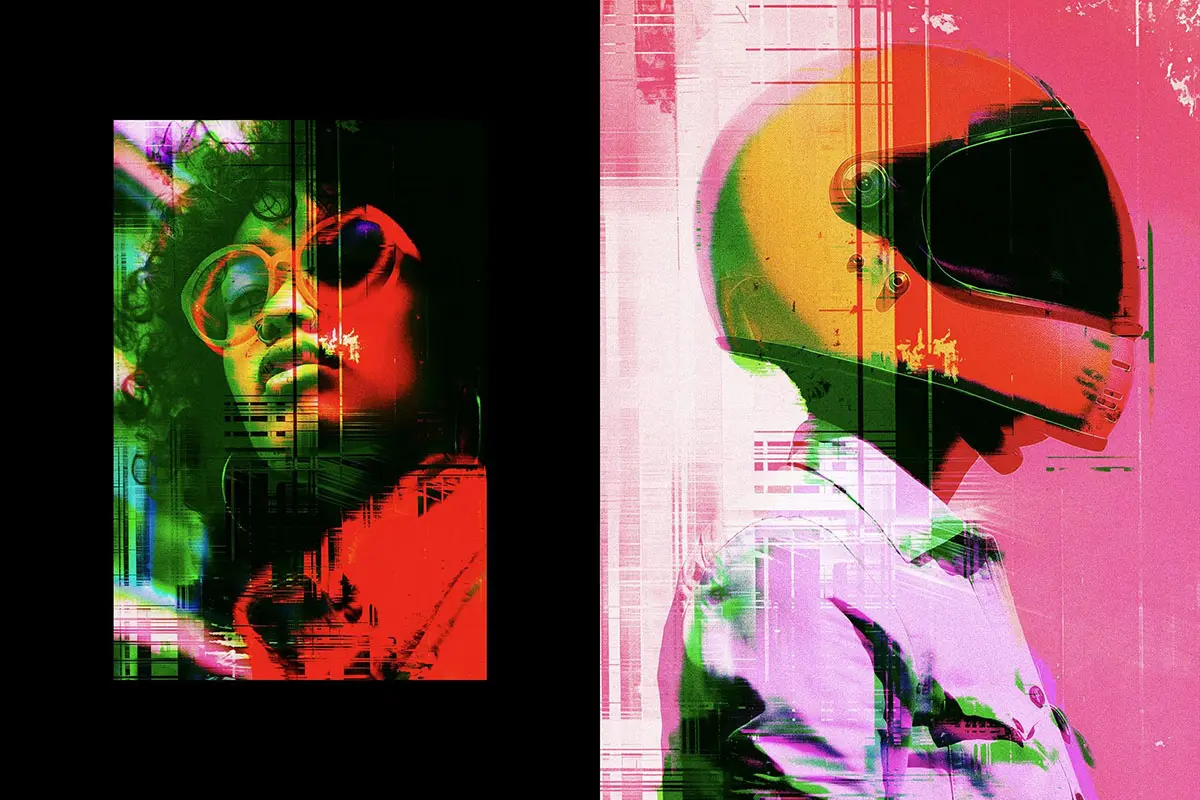 Distort Glitch Photo Effect 潮流未来科幻赛博朋克扭曲错位故障风图像照片滤镜ps样机特效模板