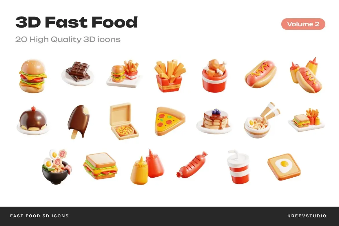 Fast Food 3D Icons Vol. 2 20款3D立体趣味卡通汉堡披萨三明治薯条快餐食品icon图标PNG插画插图Blender模型
