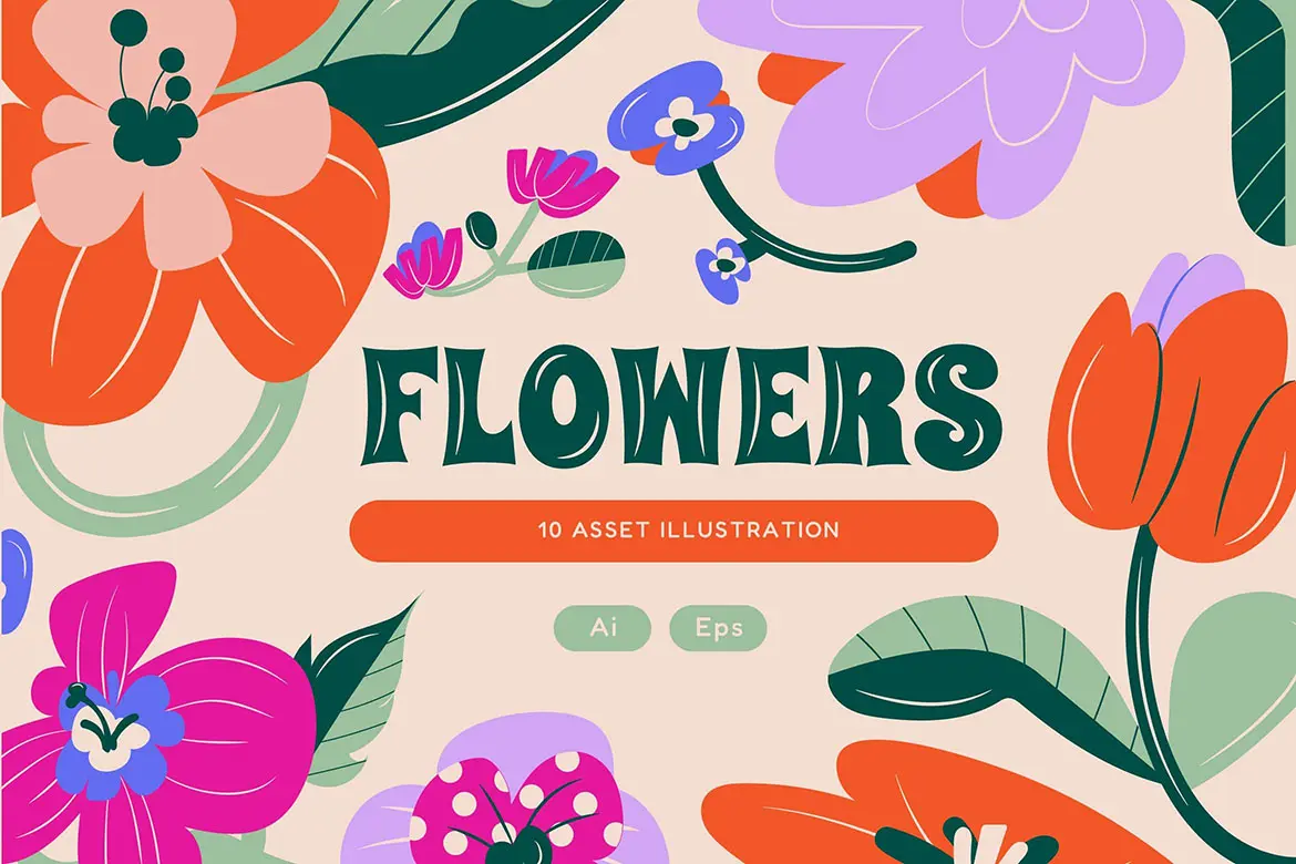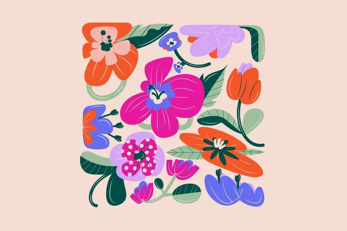 Cream Flat Design Flowers Illustration Set 手绘花朵植物剪切画图案设计图片Ai矢量素材