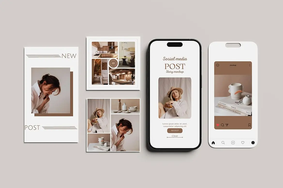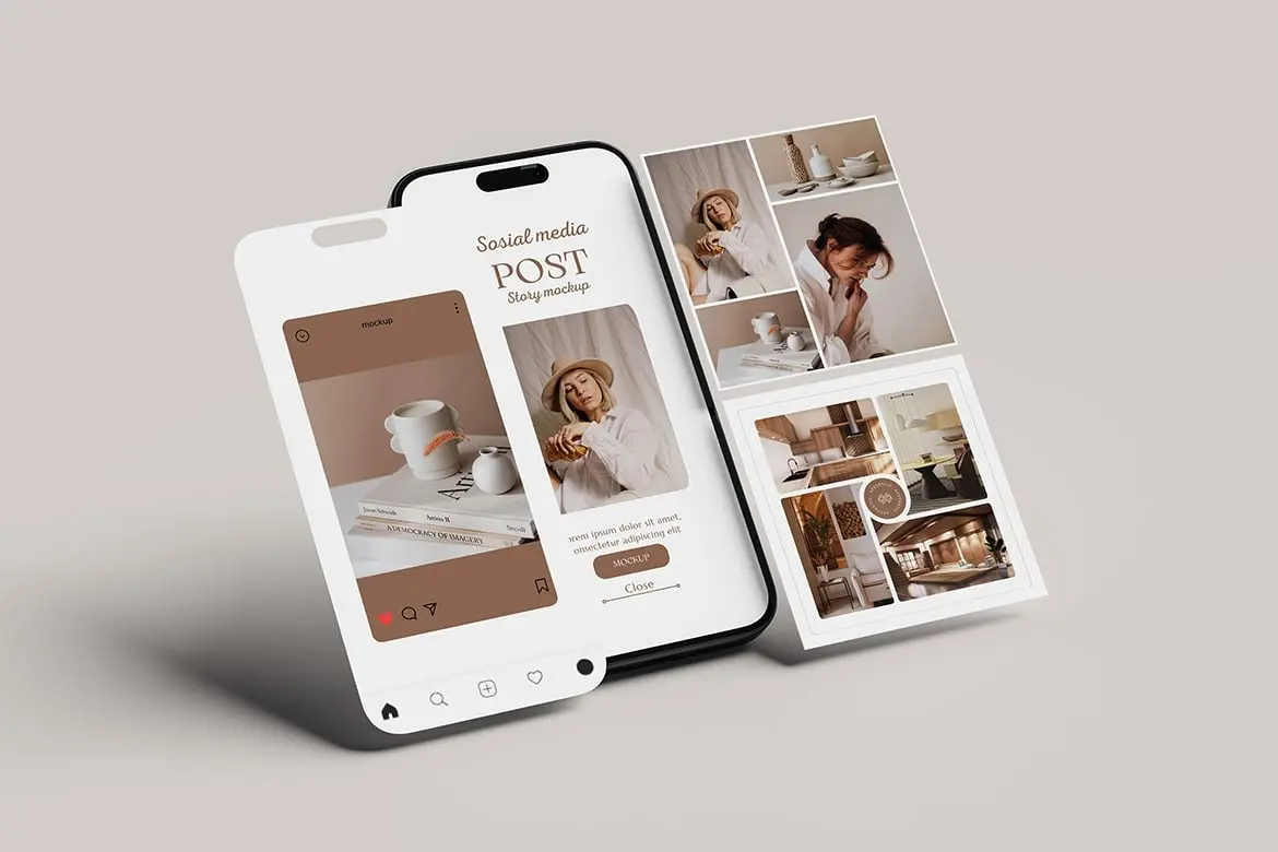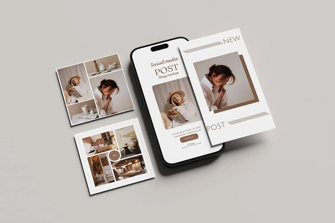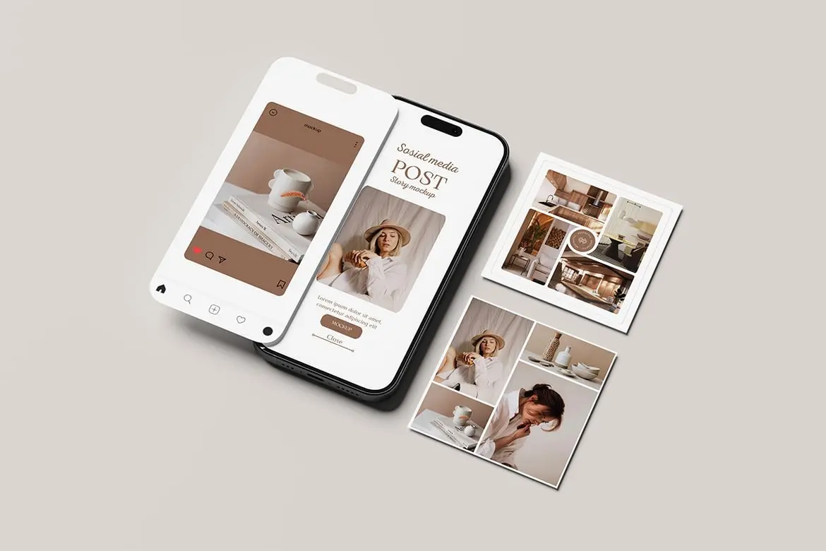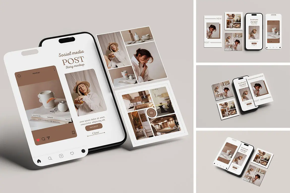 Social Media Post Mockup 4款社交媒体App广告帖子手机模型ui展示设计贴图ps样机素材