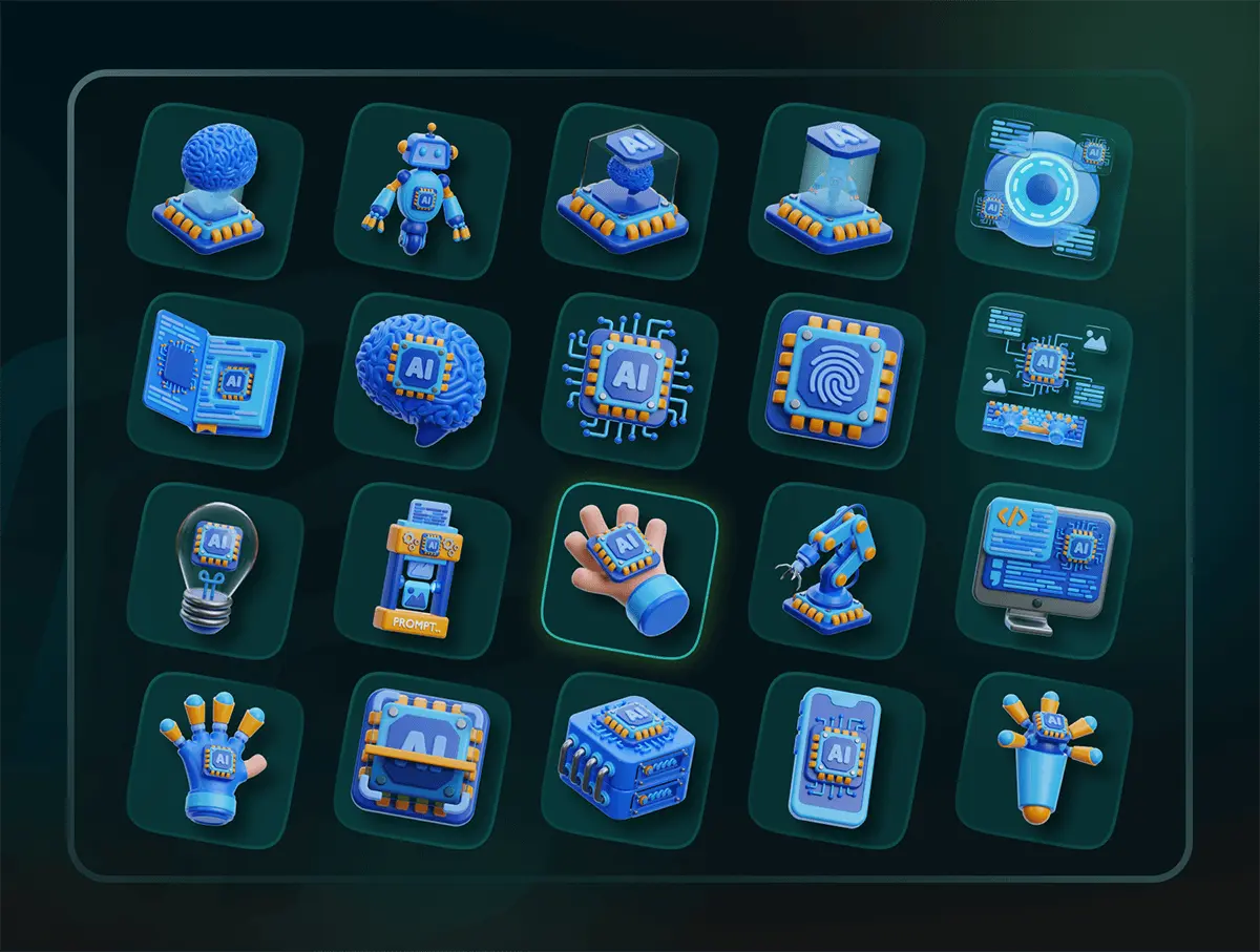 3D Artificial Intelligence Icon Set 20款高级AI人工智能芯片大脑3D插图图标Icons设计Blender/PNG格式素材