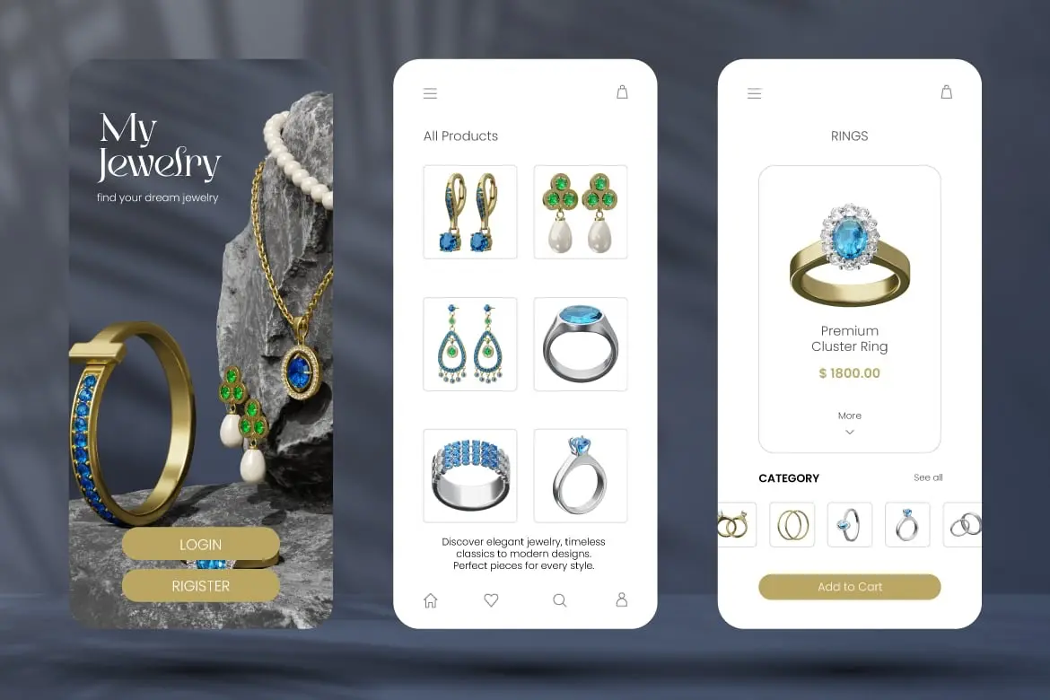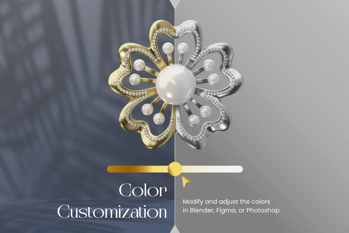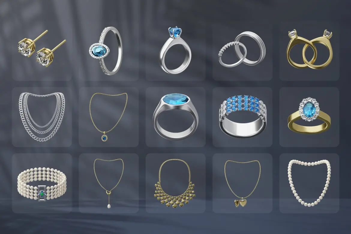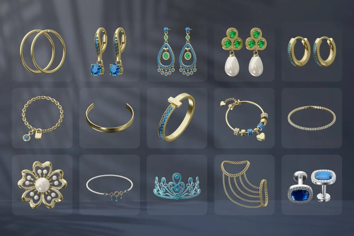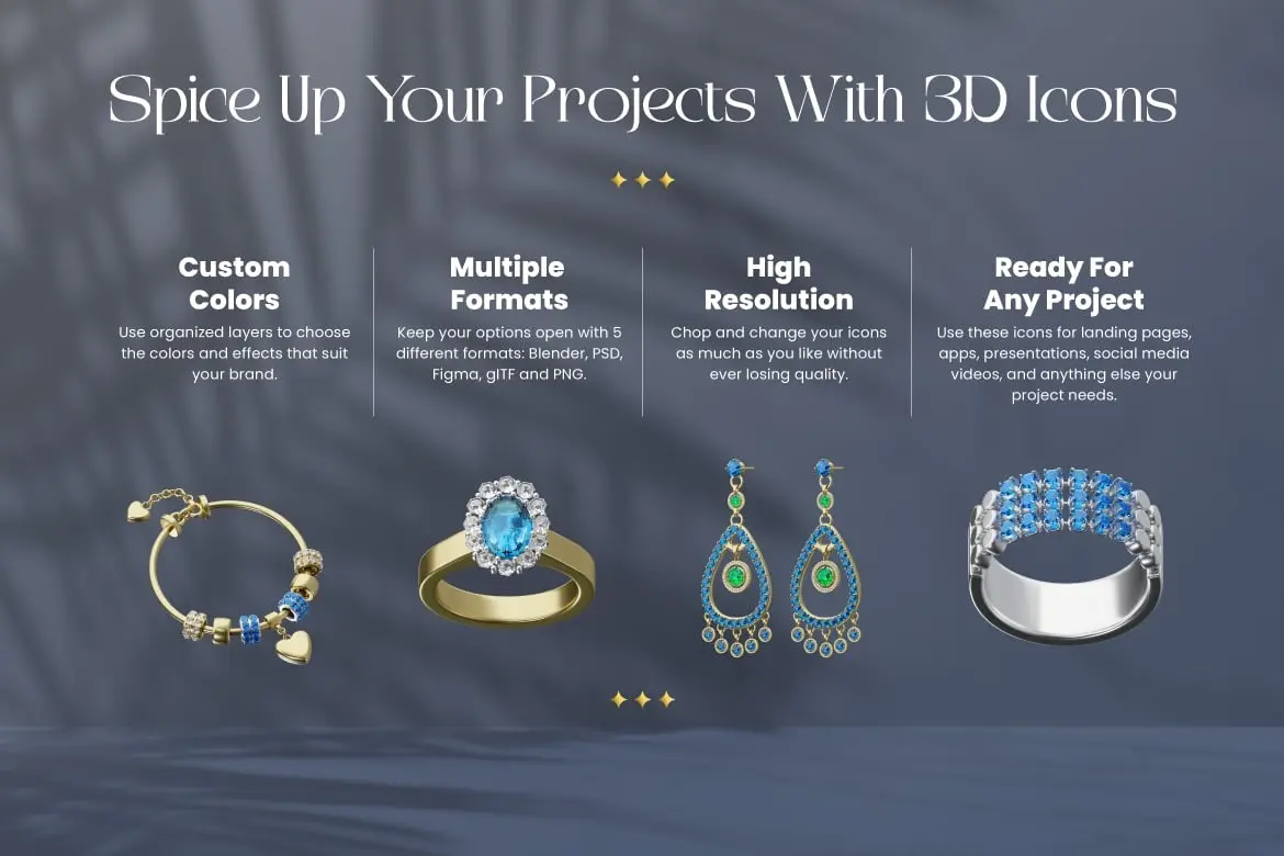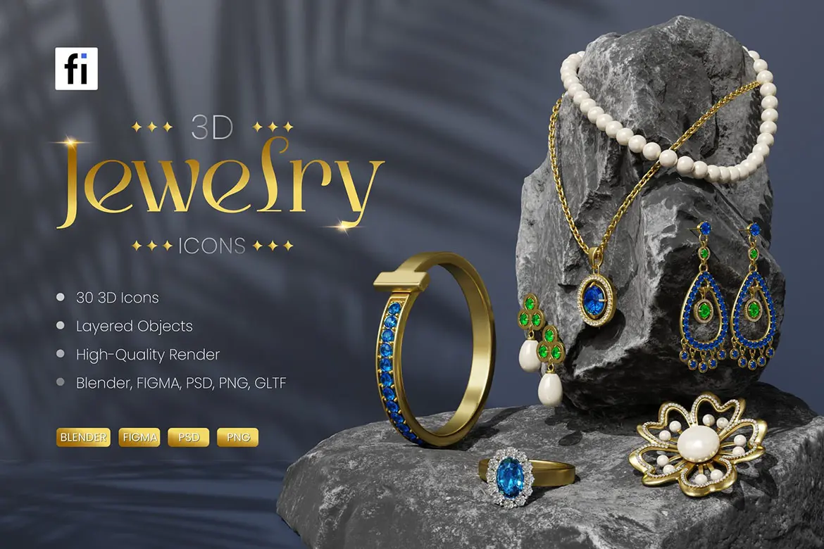 3D Jewelry Icon Set 30款3D立体珠宝首饰戒指耳环项链耳钉手镯手链胸针头饰icon图标PNG插画Blender模型