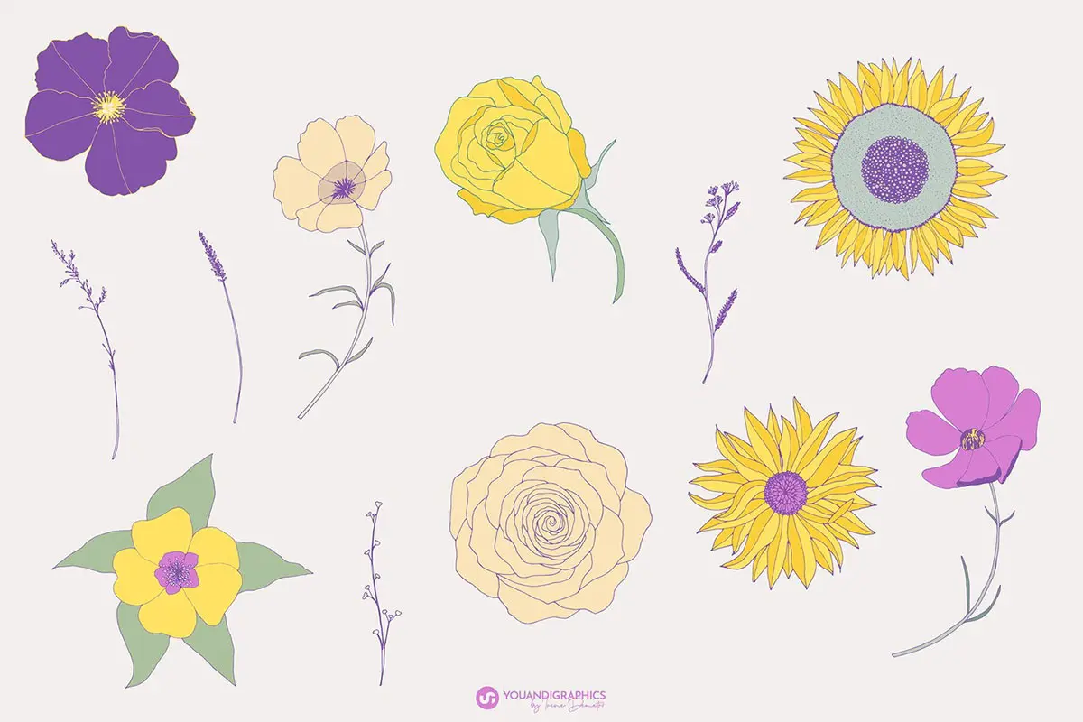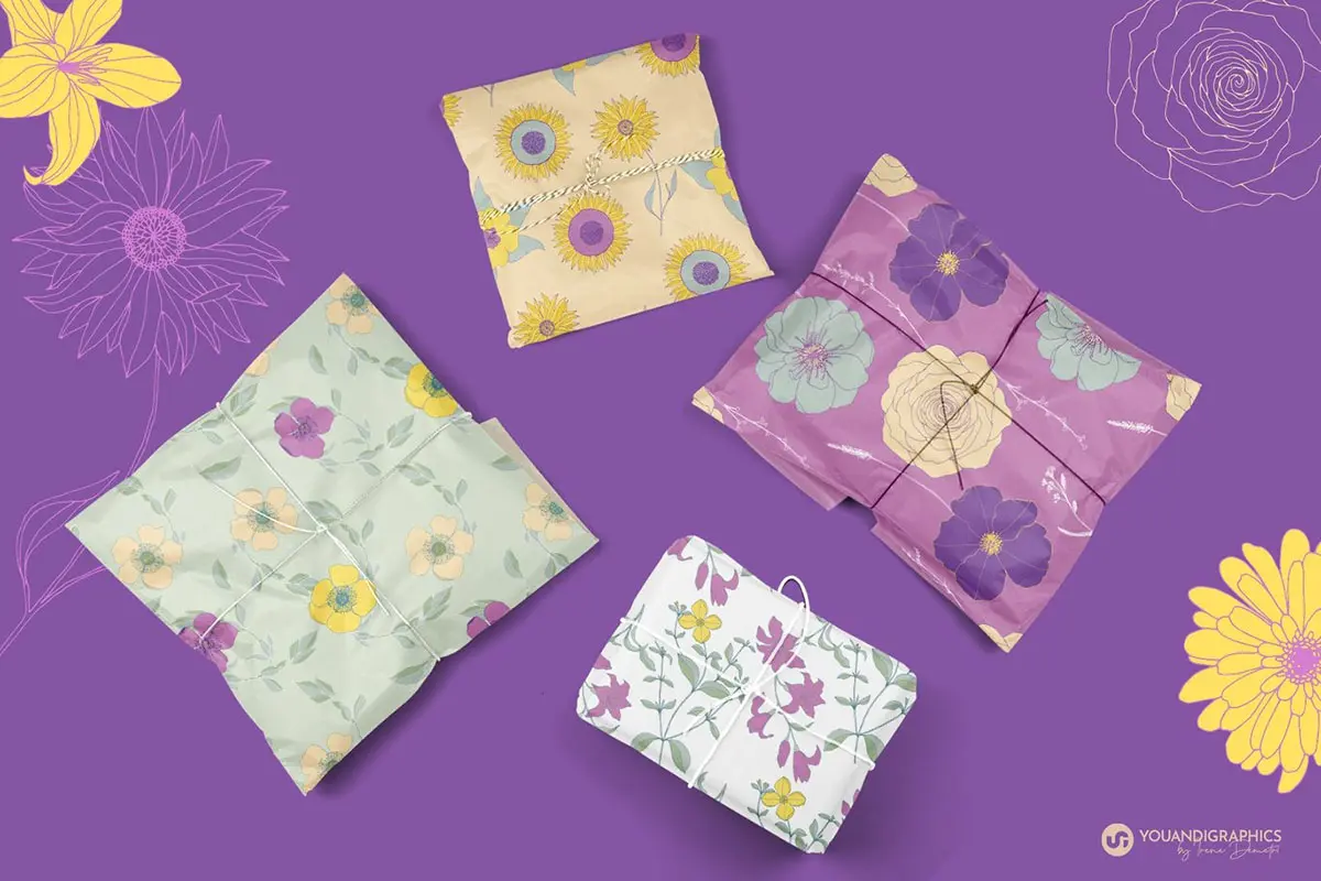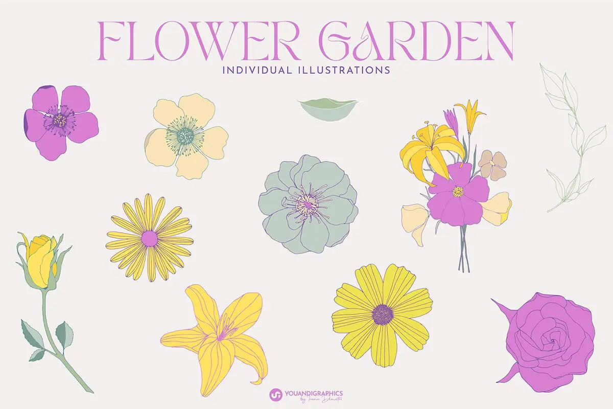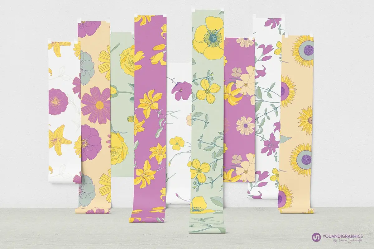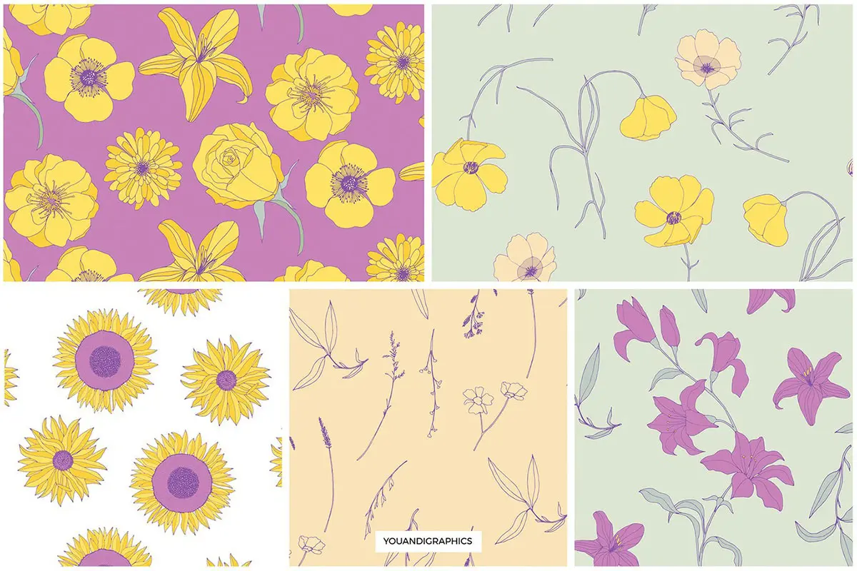 Flower Garden Seamless Patterns 春季时尚手绘线描花卉野花插图插画无缝拼接图案ai设计素材源文件