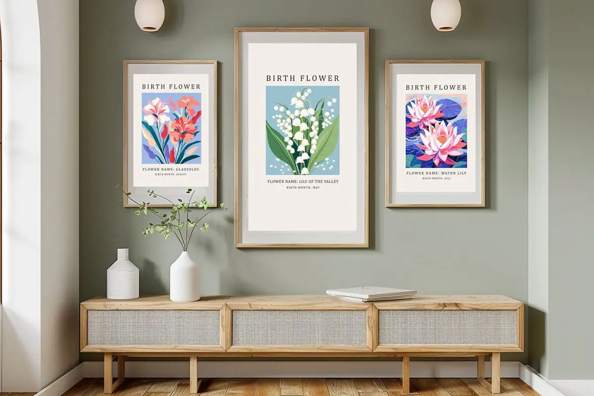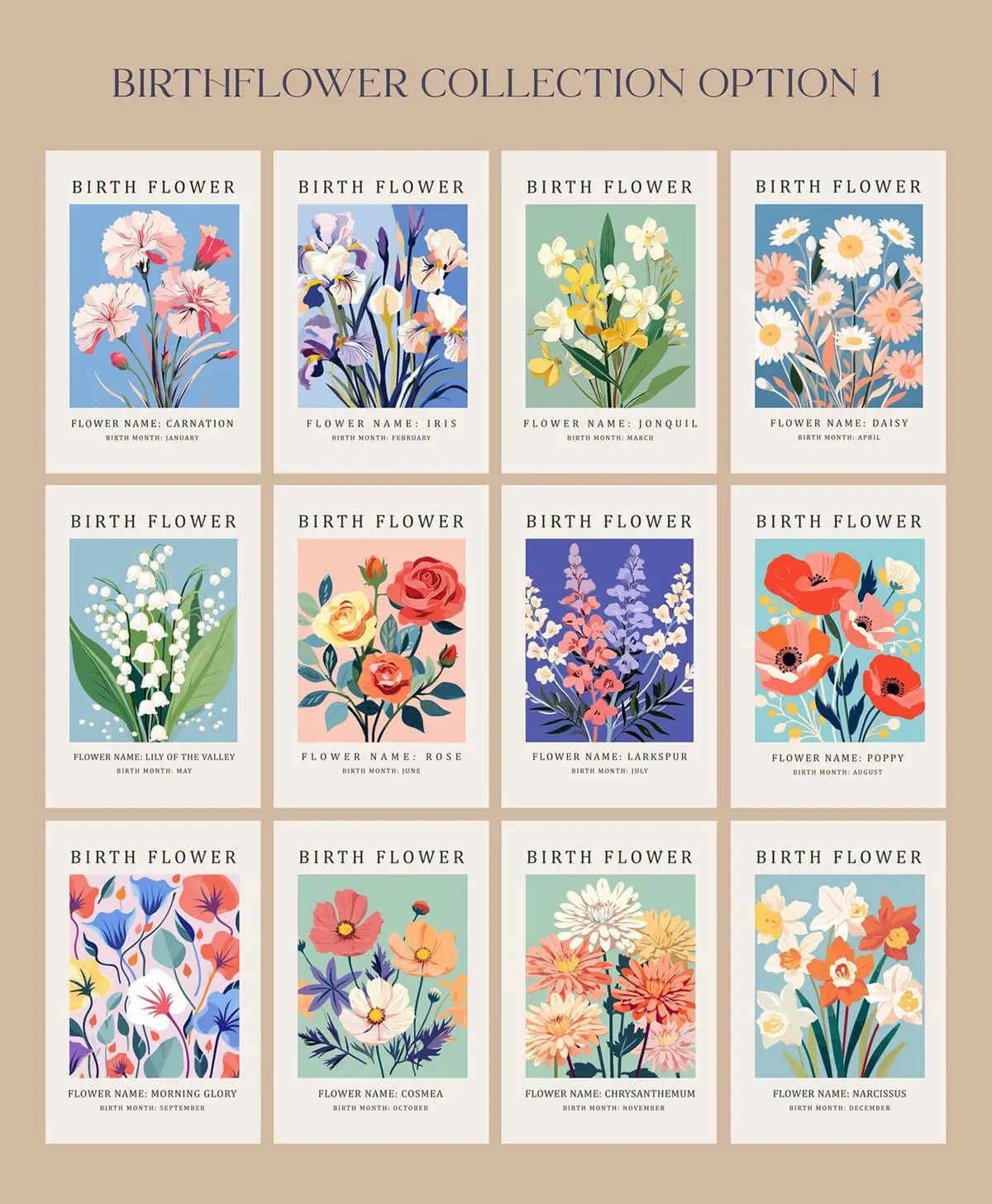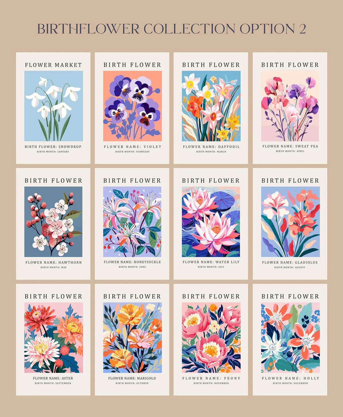 Birth Month Flower Market Wall Art 24款时尚扁平化出生月花卉植物鲜花手绘插图装饰插画ai矢量素材