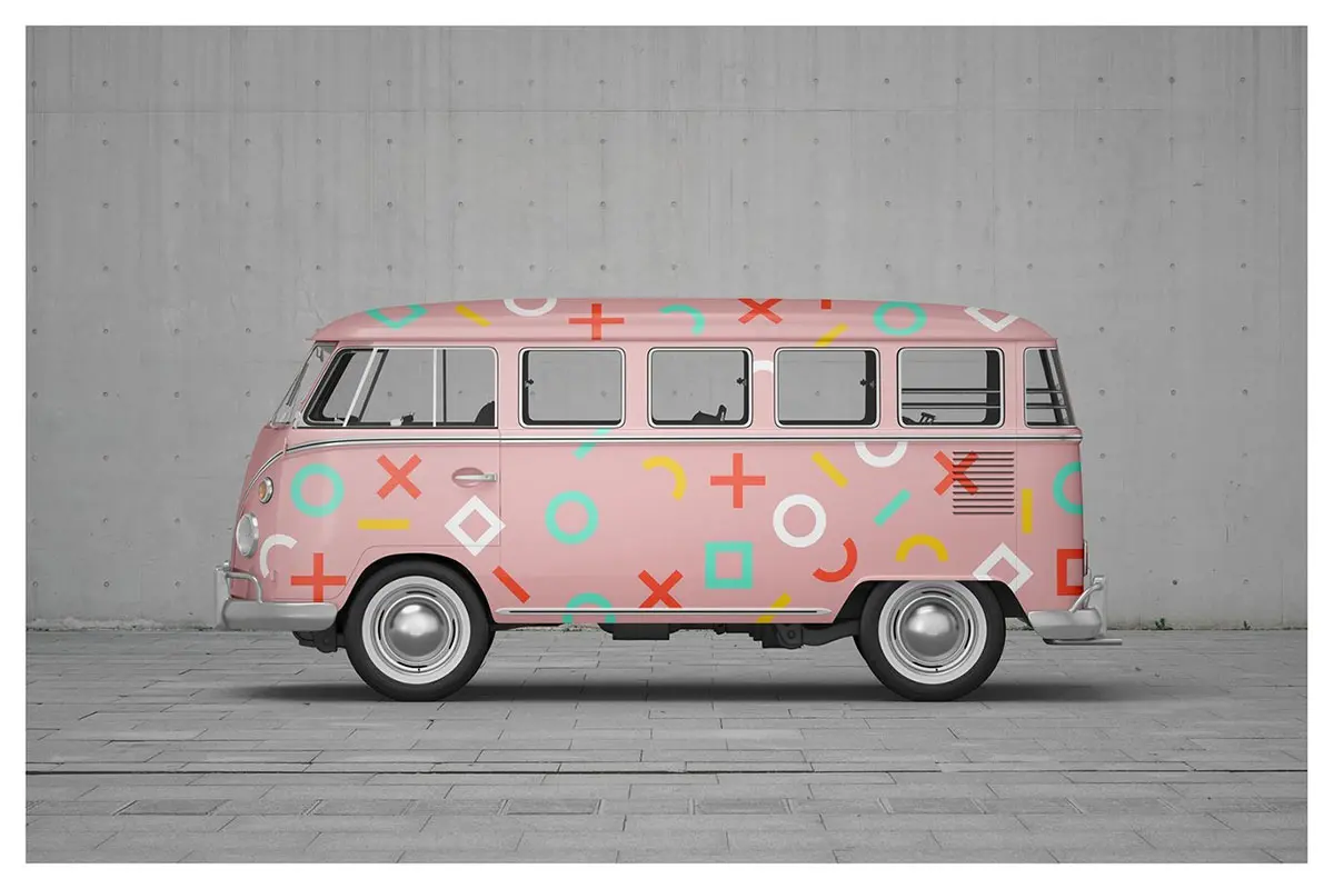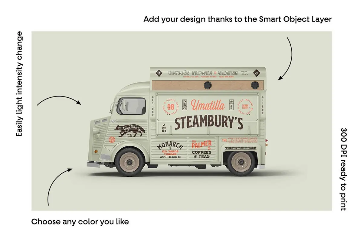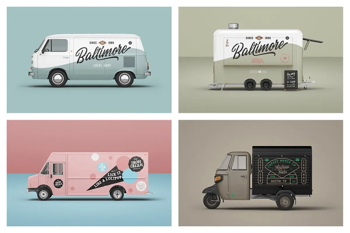 Vehicle Mockups vol.5 面包车货车运输车餐车模型车身展示设计贴图ps样机素材