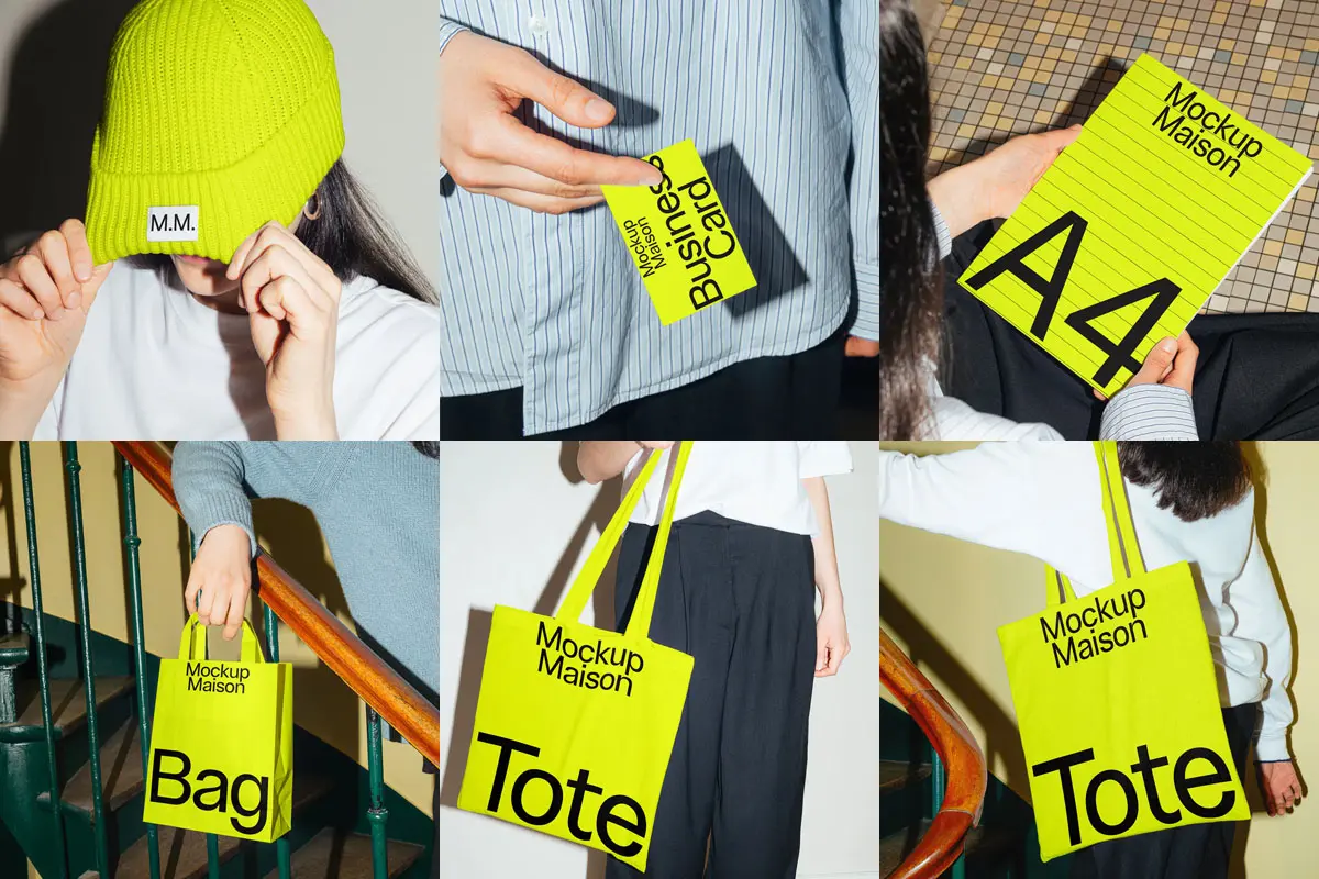 Mockup Maison – Laundry Mockup Collection 02 6款小众名片画册封面帆布手提袋棉线帽子VI设计展示贴图PSD样机模板